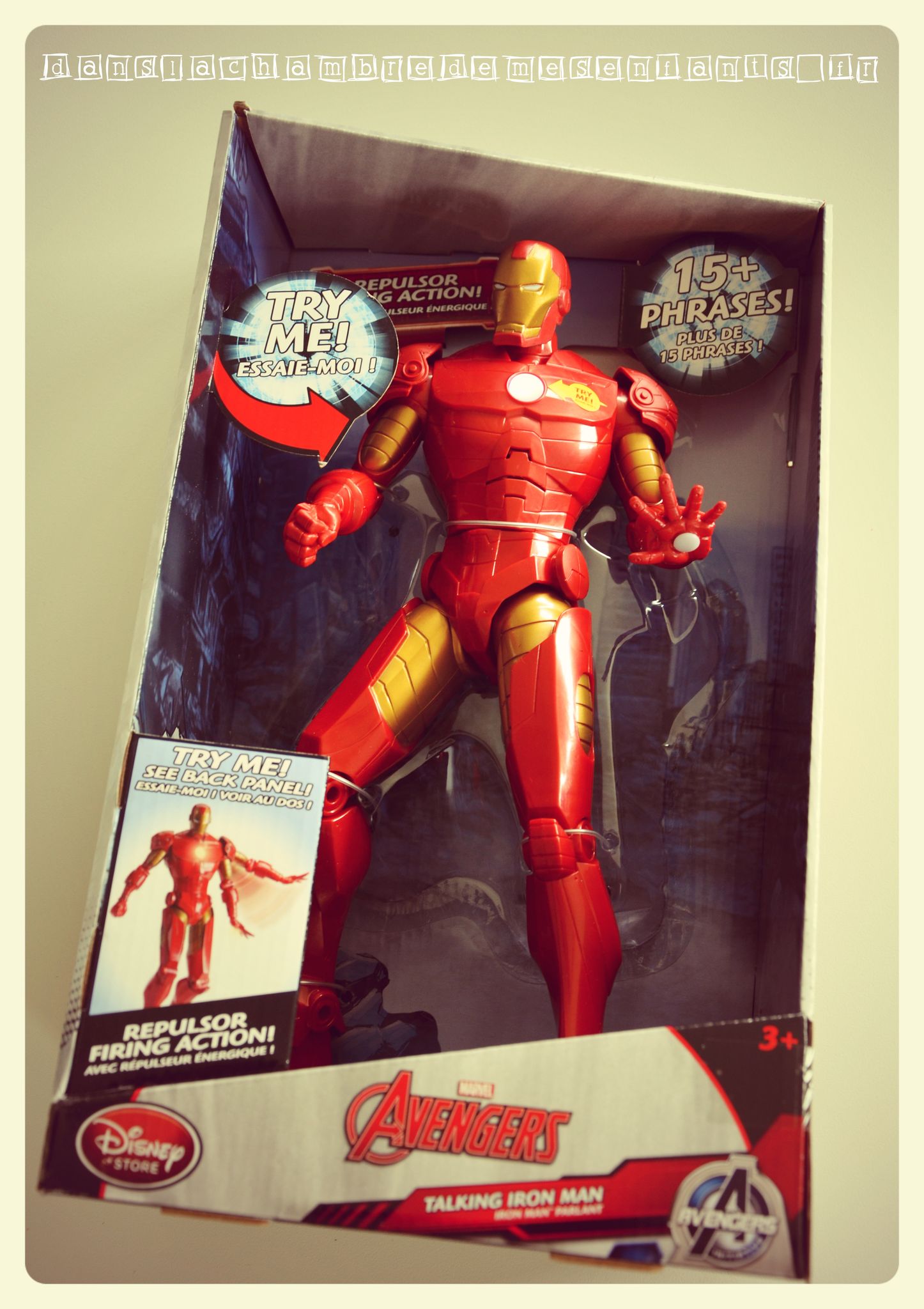 Il y a aussi les super-héros et mon préféré à moi c’est Iron Man à 16,45 € (ah on parlait pas de moi ?! Oui, c’est pour Alex bien entendu…) : il est grand, articulé, parle (beaucoup… comme moi quoi) et s’éclaire (au thorax et à la paume de la main gauche). Certains hésiteront car il parle en anglais mais, d’expérience, les enfants ne s’arrêtent pas à ça et, souvent, n’en font même pas la remarque (mon fils a eu Flash Mc Queen a 3 ans et il parle 4 langues : il le laisse le plus souvent en espagnol ou en portugais !).