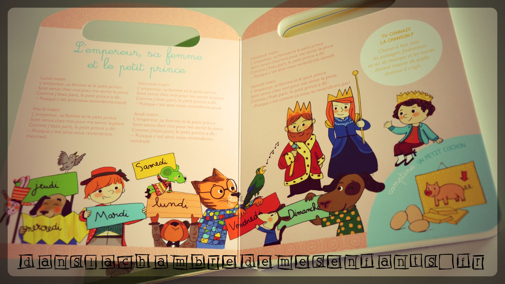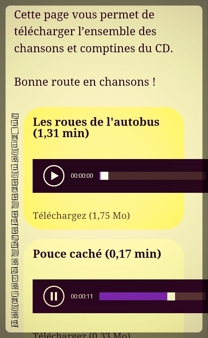 Pour accompagner nos chanteurs en herbe, un CD de 15 chansons et 15 comptines (soit 40 min) est niché dans une pochette collée à l’intérieur de la couverture. Il s’agit de chansons traditionnelles telles que « Les crocodiles », « A la volette », « Alouette » ou encore le fameux « Un kilomètre à pied ». Une alternance est faite entre chansons et comptines telles que « Une souris verte » ou « Une poule sur un mur », plus accessibles aux enfants à partir de 2,5 ans. Pour l’emporter vraiment partout, un flashcode est mis à disposition permettant une écoute à partir d’un smartphone (voir visuel en photo) ou d’une tablette.