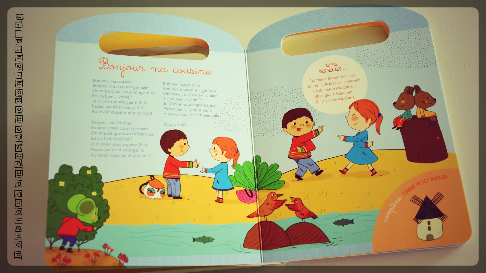Vous pouvez vous fier à ses airs de valisette : prenez-le par la poignée et emportez-le partout car il est là pour vous suivre sur la route des vacances. Pour cela, il est petit, avec un format cartonné solide et complet : les paroles de chaque chanson sont présentées sur chaque double page, avec un onglet pour annoncer la comptine qui lui fera suite et une bulle pour suggérer un jeu réalisable en voiture. Les pages sont colorées et illustrées dans un style qui parle aux enfants à l’âge de l’école maternelle. S’ils ne connaissent pas déjà les paroles, ils pourront ainsi les lire à partir de 6 ans, tout comme certains jeux qui leur seront plus accessibles (ex : « Dis-moi combien ! On observe les passagers de la voiture qui roule devant nous. L’adulte dit : « Combien de pieds dans cette voiture ? » On peut faire la même chose avec les doigts, les orteils etc. Celui qui répond le premier a gagné ! »). Je vous rassure il y a en aussi pour les plus jeunes.