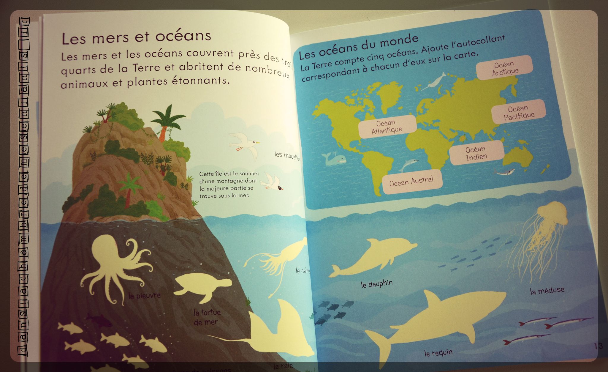 L’avis des enfants : Alex connaissait une partie des informations, notamment grâce à de précédentes lectures sur les phénomènes climatiques, mais il a tout de même appris de nombreuses choses (continents, océans…) et cela l’a intéressé. Le jeu de stickers ne lui a pas été difficile (il a 5,5 ans) mais il a tenu à le terminer tout en suivant la lecture.