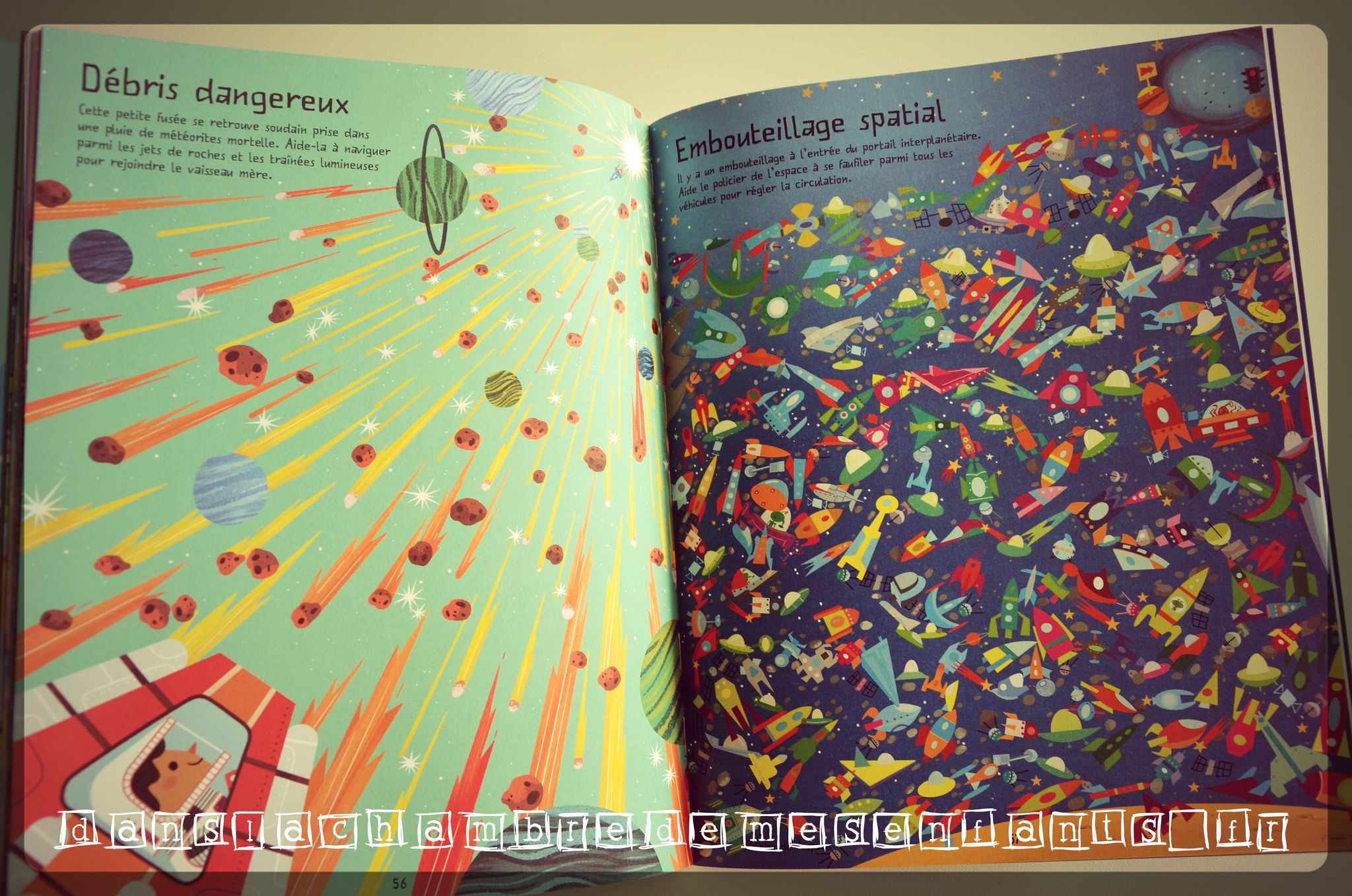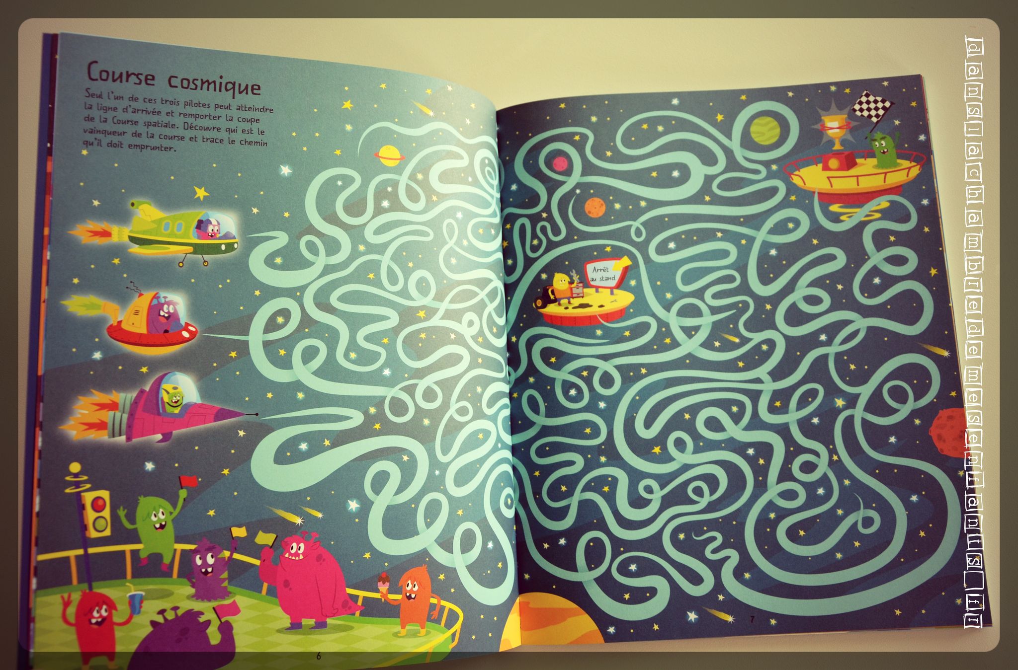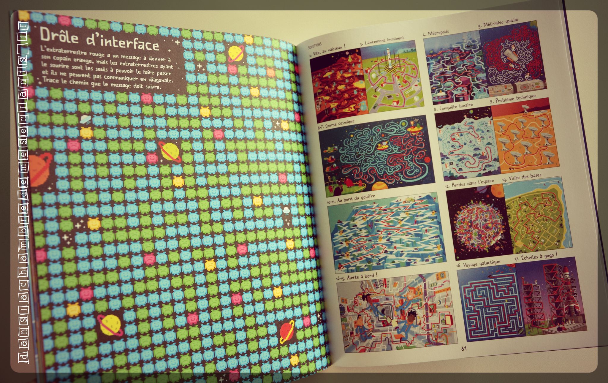 Ce grand cahier d’activité est ciblé : vous n’y trouverez que des labyrinthes (45 exactement) mais pas les moindres car vous passerez de la lune à une excursion planétaire, pas sans embouteillage spatial ou problème de parking de l’espace (pour n’en citer qu’une partie). Cela ressemble bizarrement à nos propres vacances ! 😉
