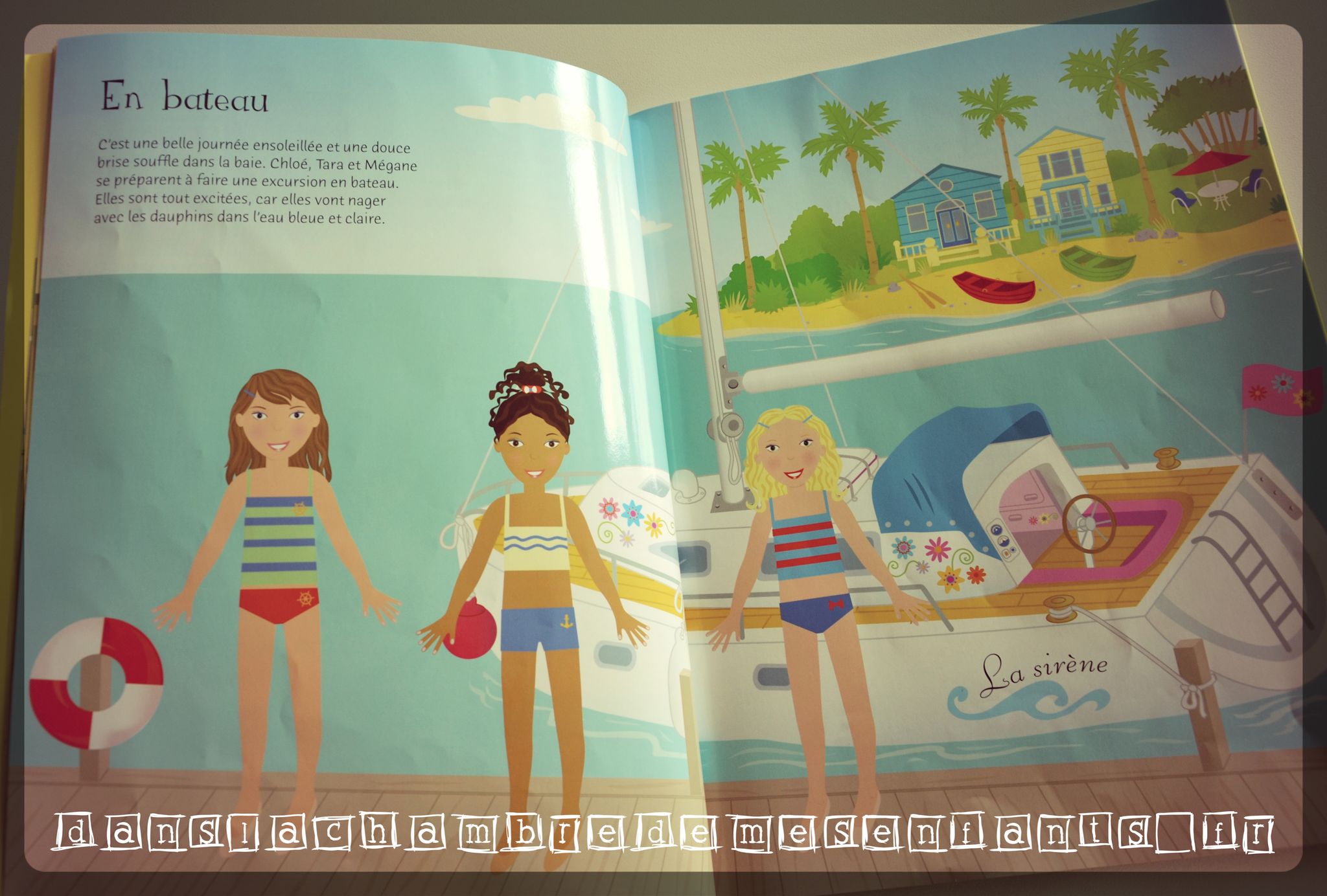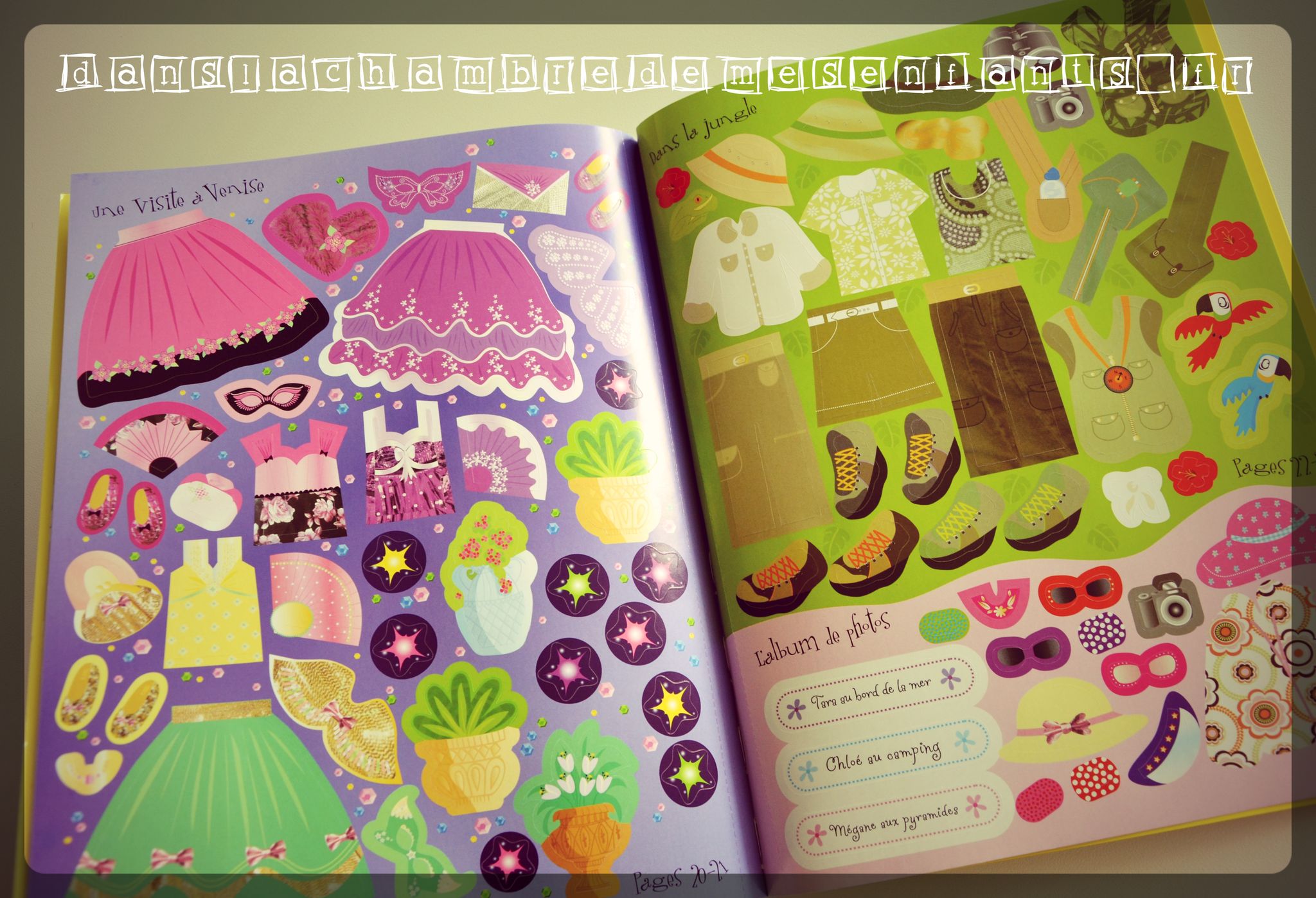Ce cahier dispose de pages glacées présentant 13 scènes et 10 pages prédécoupées comportant plus de 400 stickers repositionnables. Un grand rabat permet de faire office de marque page, de « plan de travail » lorsqu’il est déplié ou de rangement pour les pages de stickers en cours. Il s’agit d’un univers très girly où l’on retrouve trois amies (Tara, Mégane et Chloé) durant leurs vacances (sur une île tropicale, à la montagne, en safari, dans un récif de corail…). Chaque scène comprend un petit commentaire et un décor où figure la bande de copines. Les stickers sont repérés par le numéro de page de la scène s’y référant et ils représentent des habits, des accessoires et des éléments de décoration.