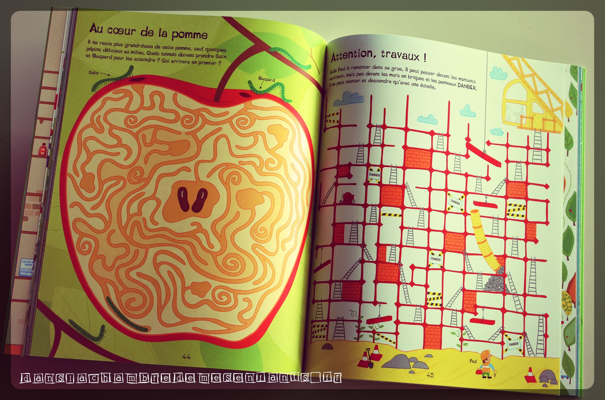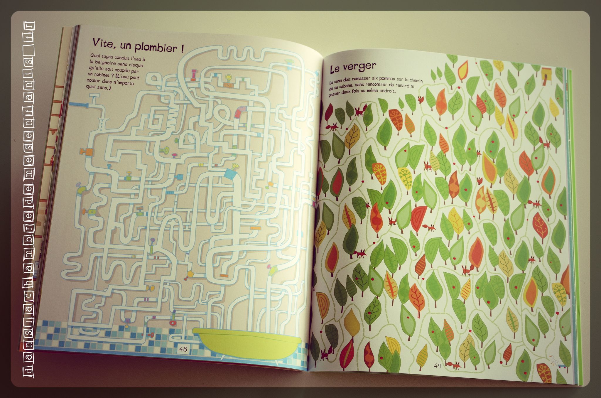Si vous préfèrez des jeux plus ciblés, voici un ouvrage comprenant 50 labyrinthes à travers des décors variés dont un cheminement dans les nuages, un banc de poissons, un arbre tortueux, une table à dessin ou encore les galeries creusées par les vers Gaspard et Colin dans une pomme.