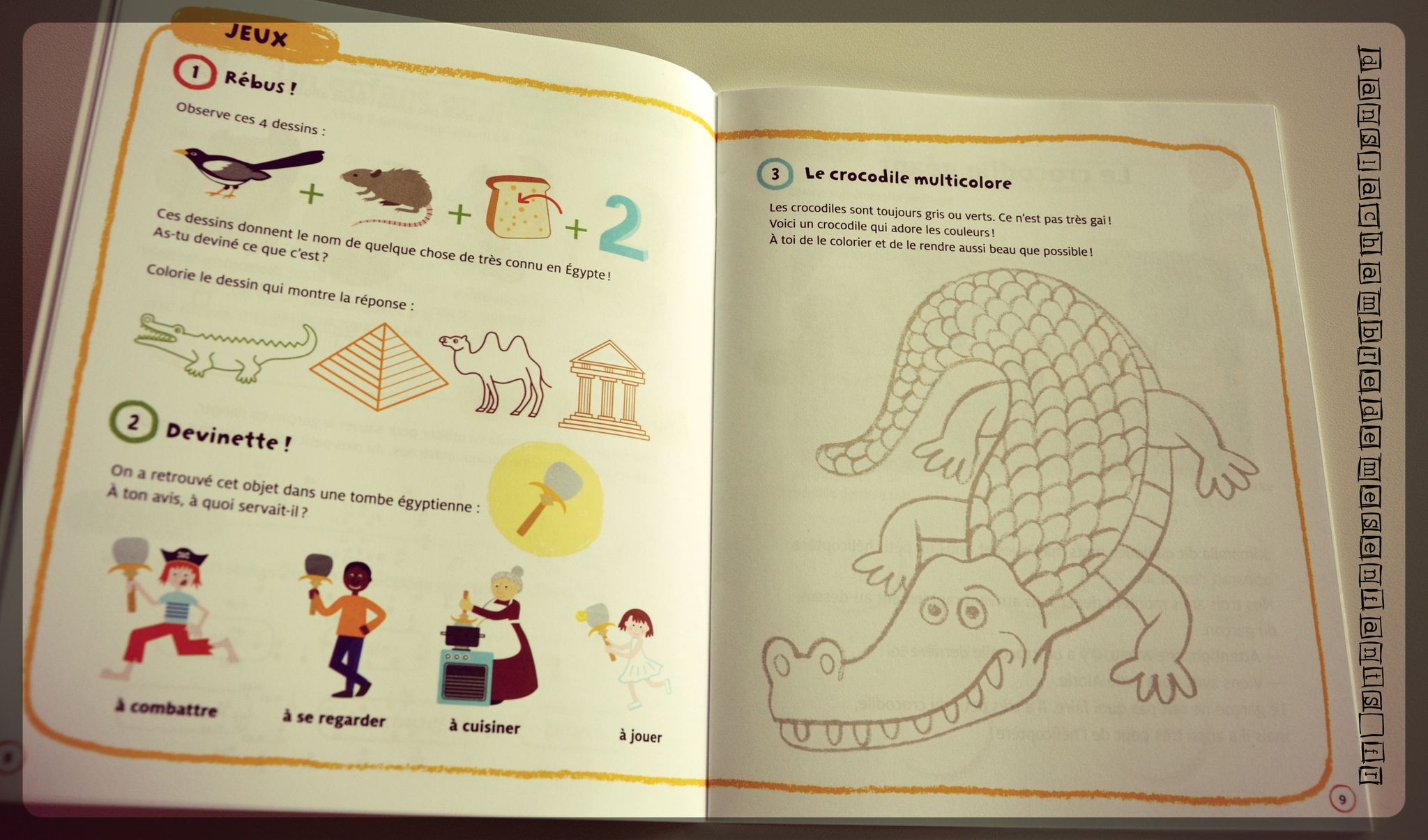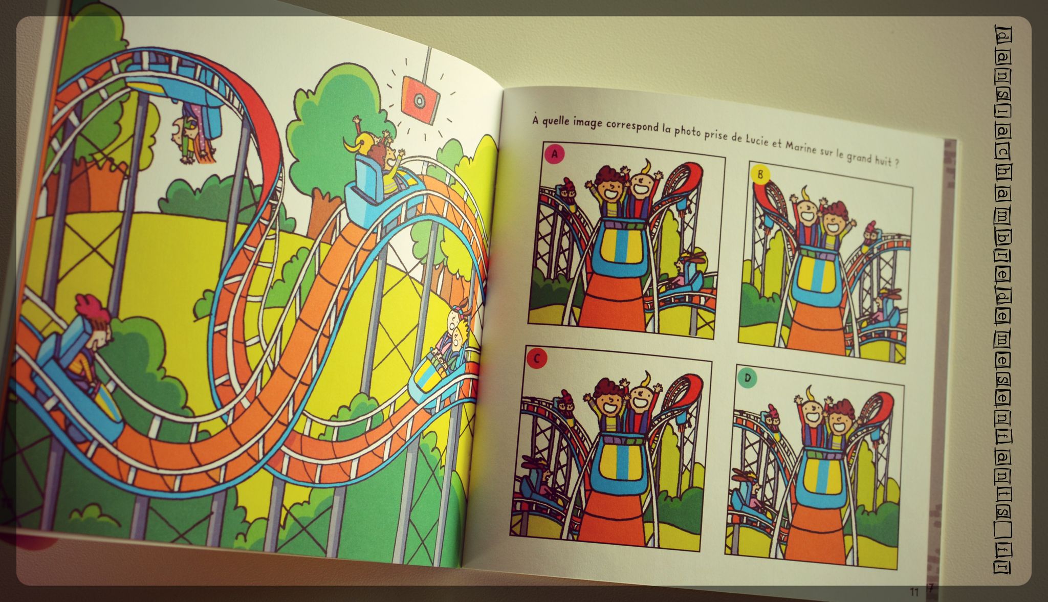 Ici, encore, il s’agit d’un ouvrage appartenant à une collection : le grand format de qualité et les belles illustrations colorées attirent l’œil et les jeux retiennent l’attention longtemps ! La grande diversité des tableaux rythme bien l’activité.