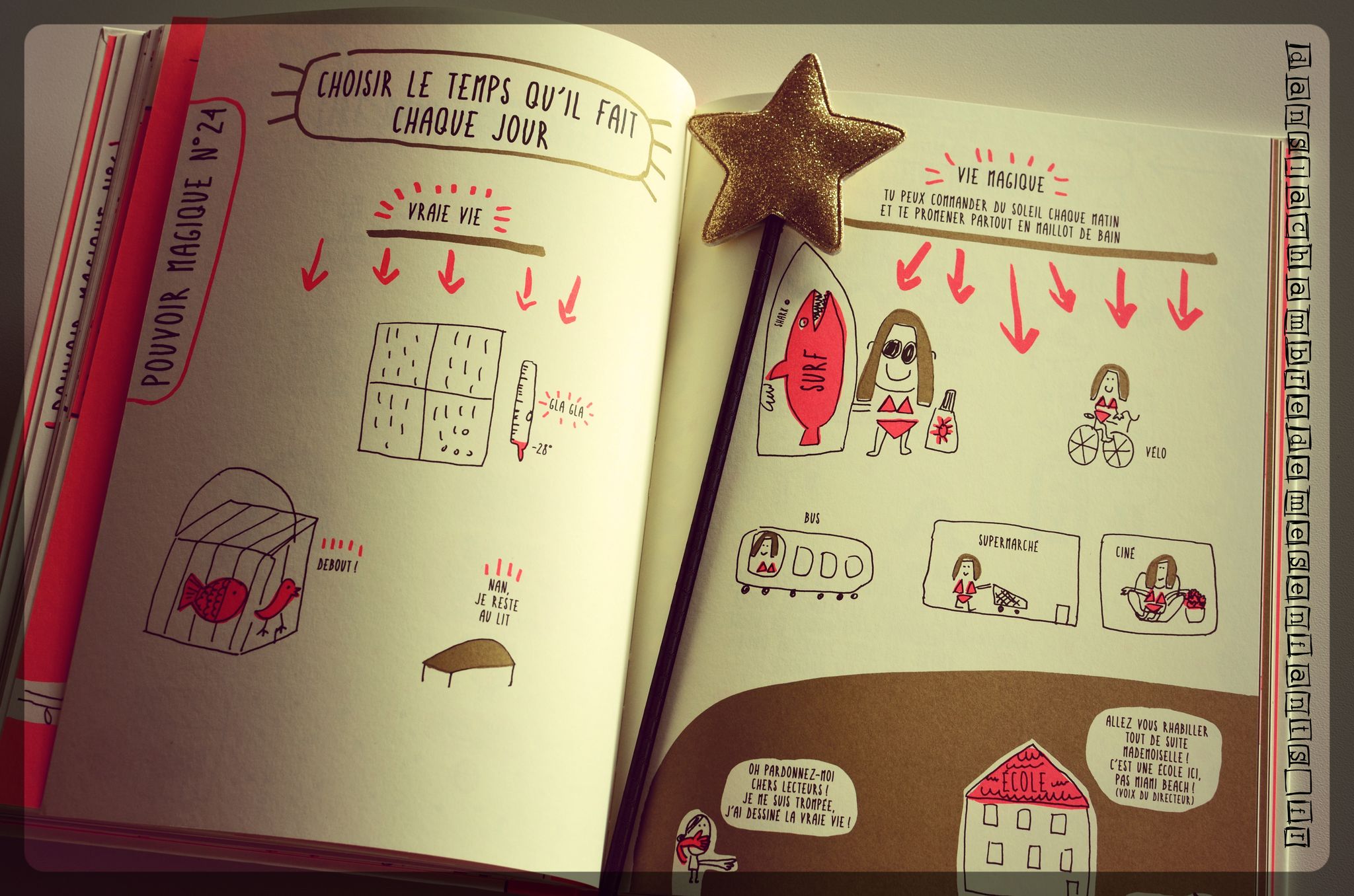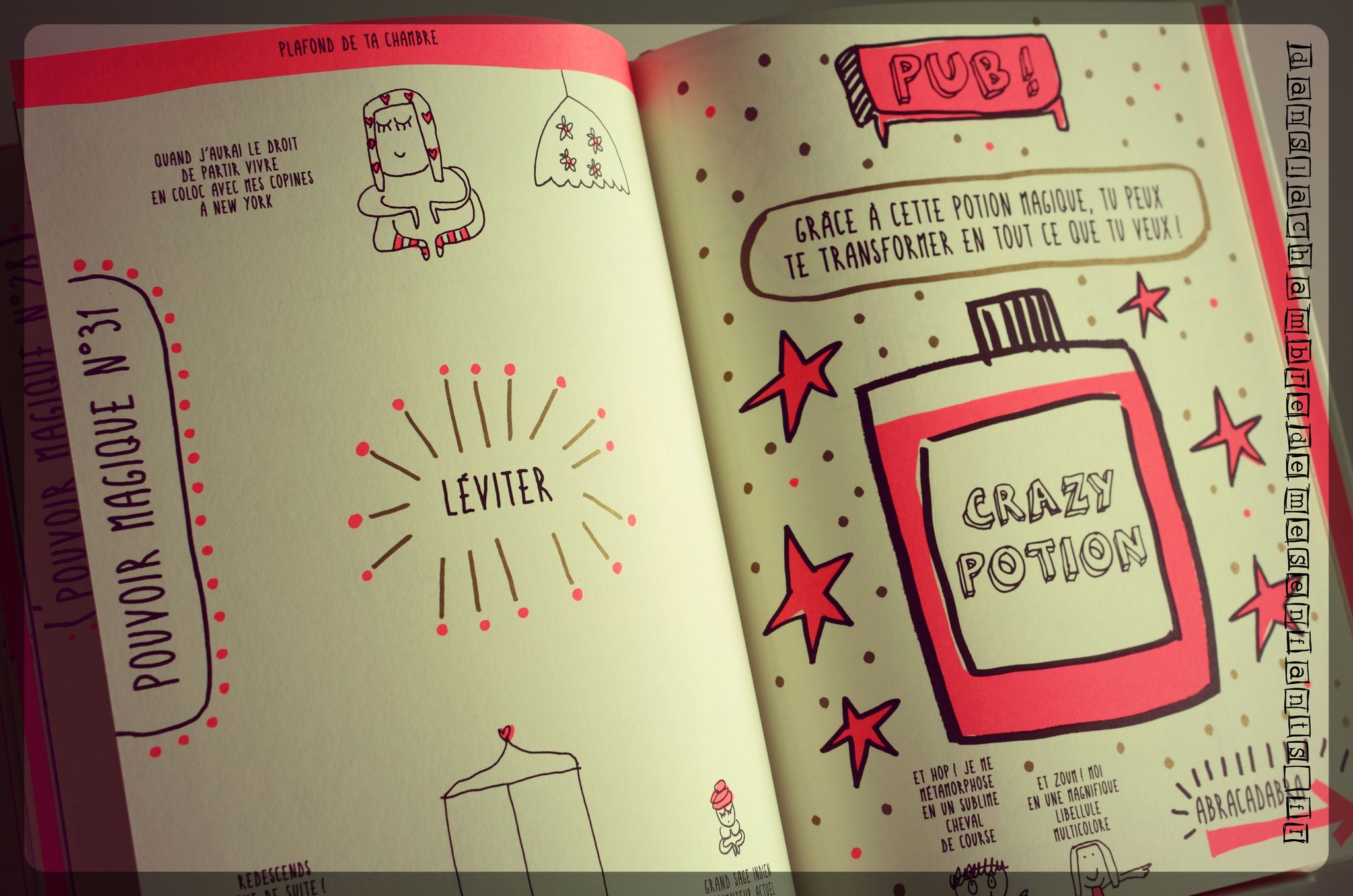 Puisque tout y est permis, je vous propose le pouvoir magique n° 14 « Choisir ton âge à chaque instant » (avec une projection d’un « mec de 32 ans » super winner, qui ne mange jamais de légumes, sans appareil dentaire…), le n° 24 « Choisir le temps qu’il fait chaque jour », le n° 27 « Changer de chaîne quand une conversation ne te plaît pas » avec des chaînes « oiseaux exotiques ; silence complet ; le contraire […] ». Parmi les pages de « pouvoirs magiques », on trouve des articles divers tel qu’un test « Comment savoir si des lapins sont normaux ou magiques ? », une pub de lotion pour se transformer, des commentaires sur des sujets ouverts par des pouvoirs comme la téléportation.
