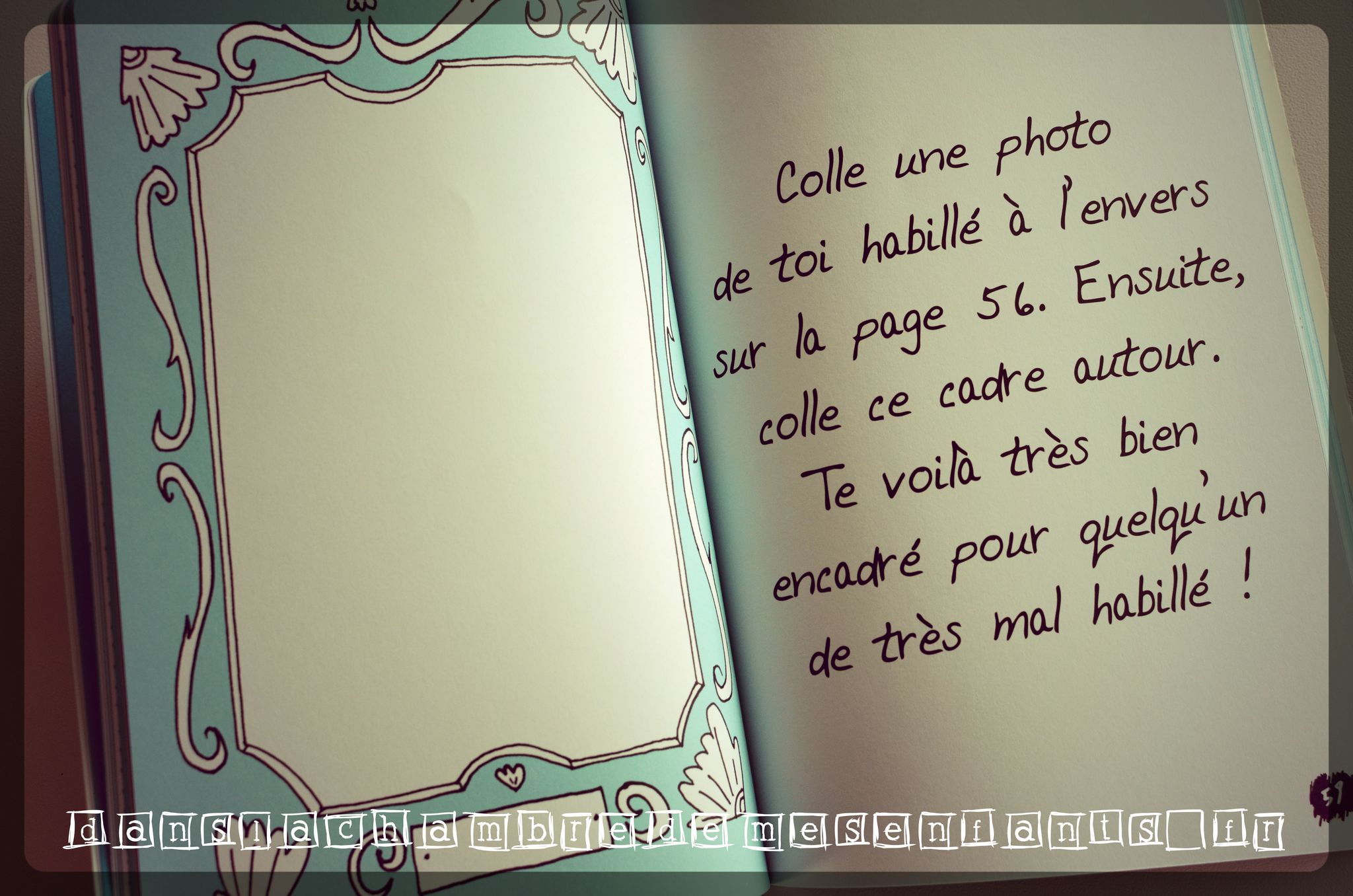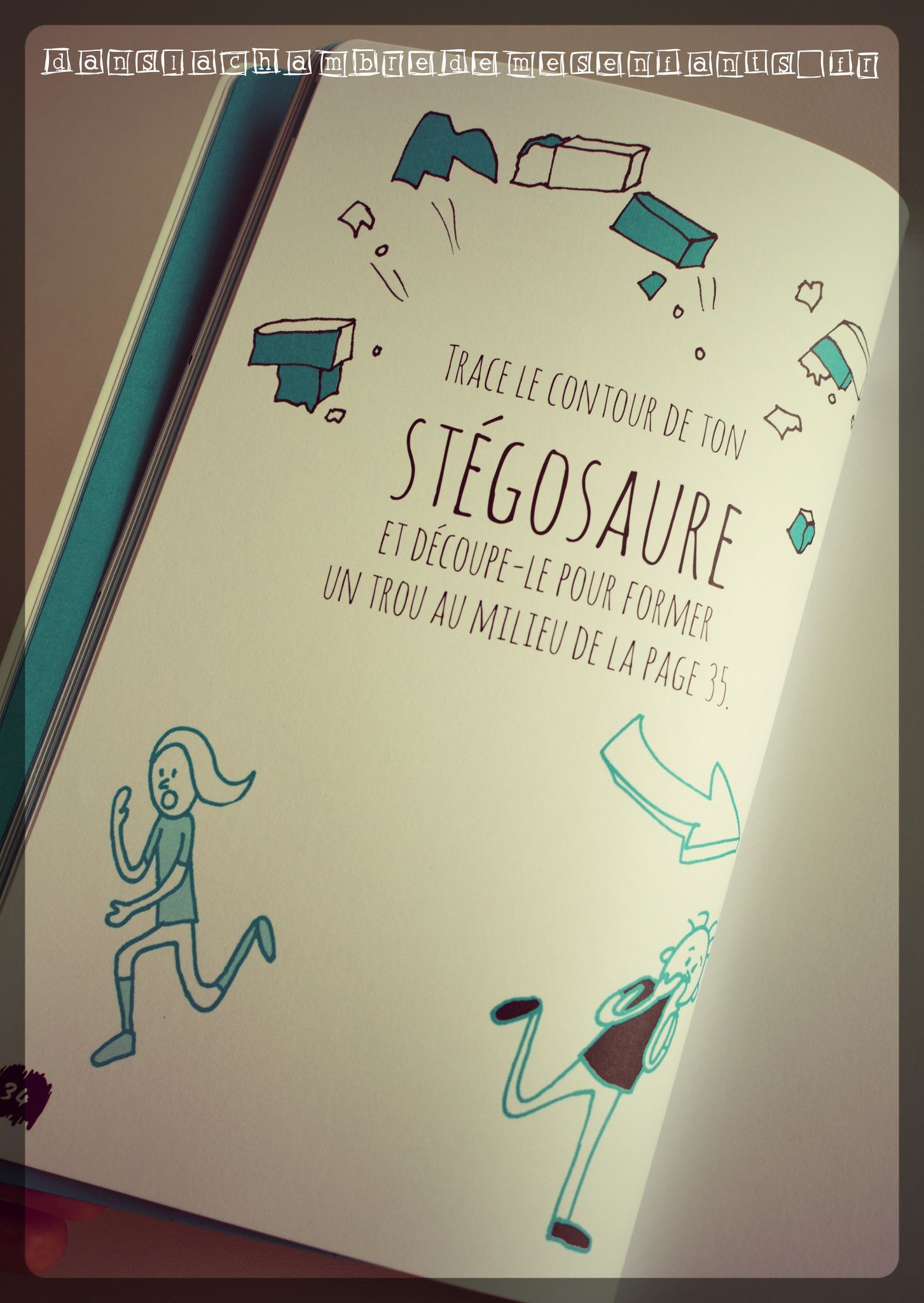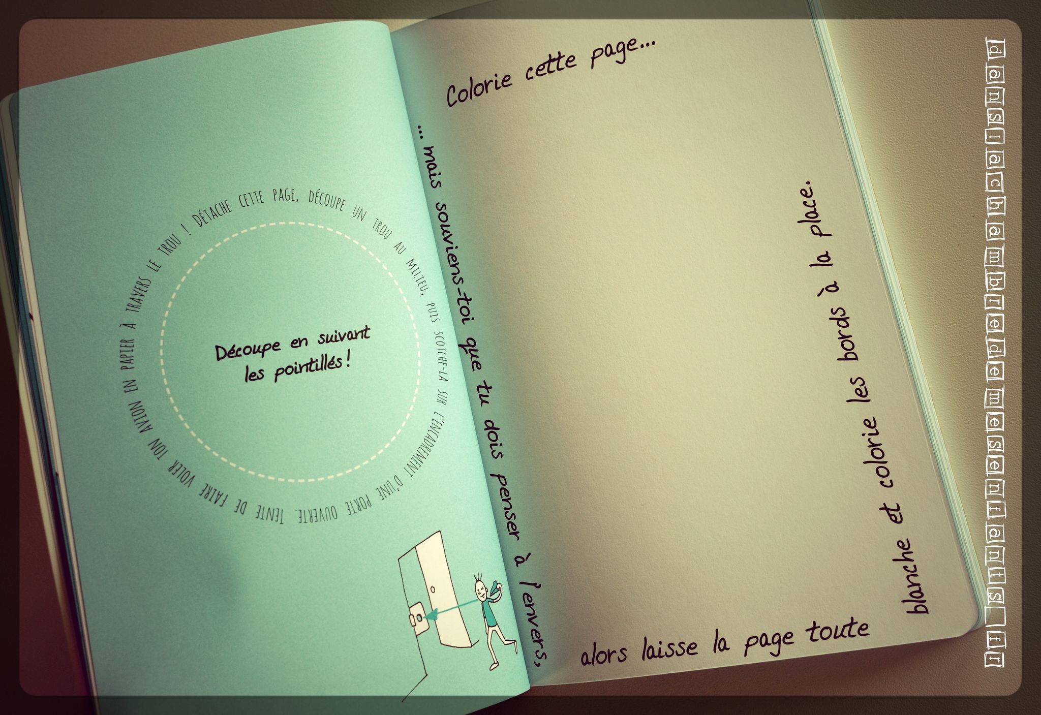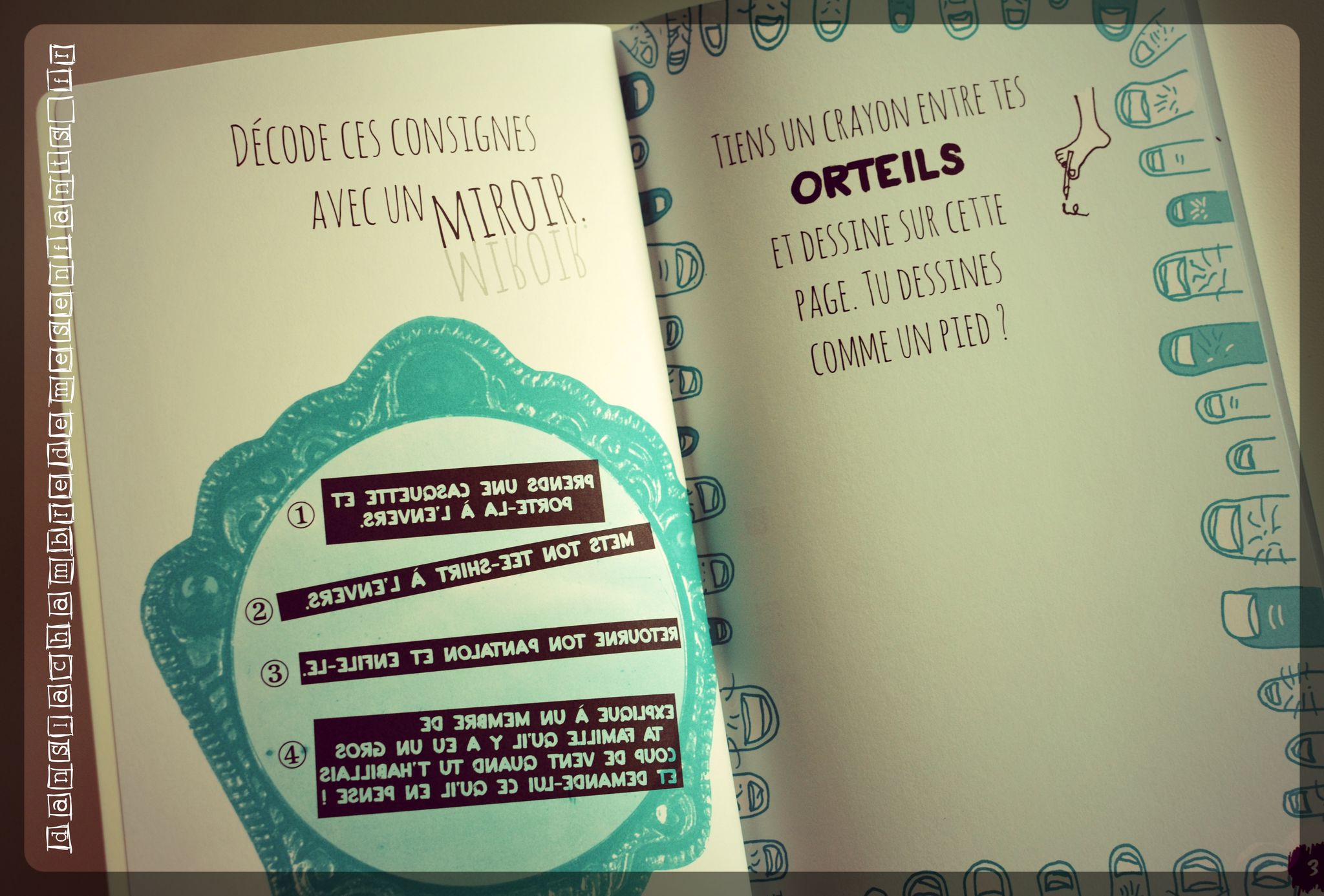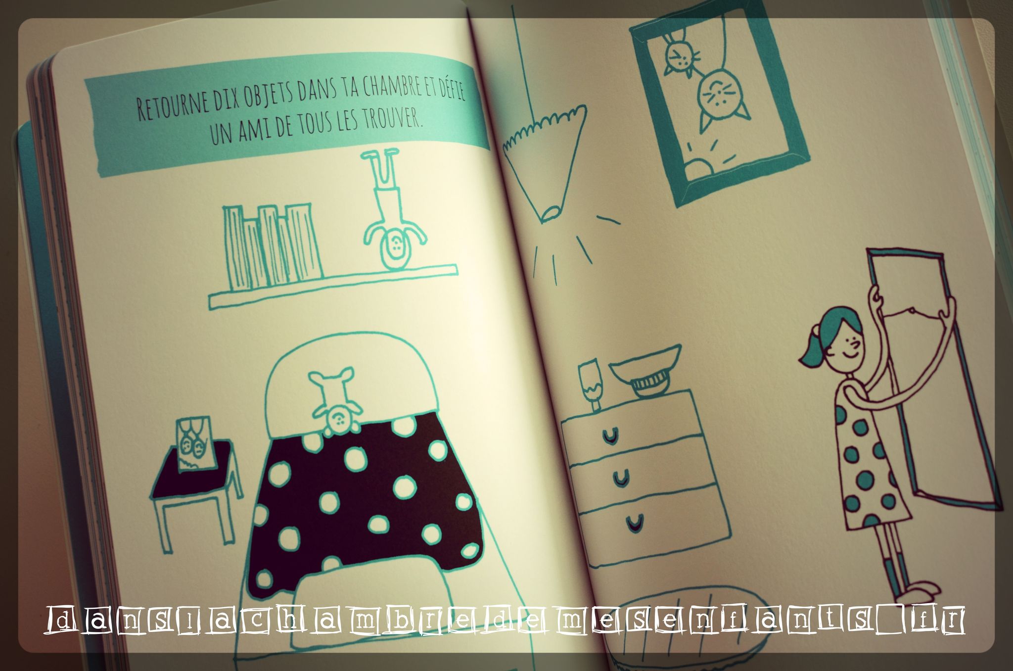 Dans la chambre de mes enfants, on aime les livres décalés et plein d’humour. Celui-ci est en fait un livre d’activités un peu à part. Pour commencer, il est taillé en biais (il a déjà l’esprit de contradiction) et il commence à l’envers, à partir de la dernière page. Il propose de nombreuses activités à savoir réaliser… à l’envers ou de façon farfelue car, attention, ce livre a du caractère et il est loufoque ! « Décode des consignes avec un miroir », « Colorie cette page… mais souviens-toi que tu dois penser à l’envers, alors laisse la page toute blanche et colorie les bords à la place », « Détache cette page, découpe un trou au milieu, puis scotche-la sur l’encadrement d’une porte ouverte. Tente de faire voler ton avion en papier (ndlr : précédement réalisé) », « Chronomètre le temps qu’il faut pour dessiner 3 fois ce tableau ! […] Maitenant, scotch 3 crayons de couleur ensemble et dessine le tableau 1 fois ! Es-tu plus rapide ? »