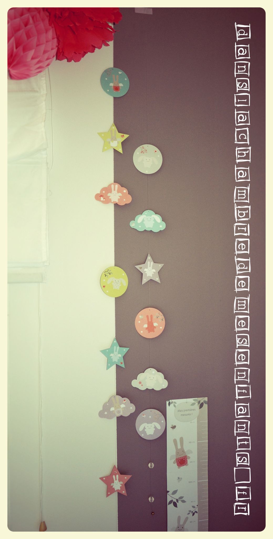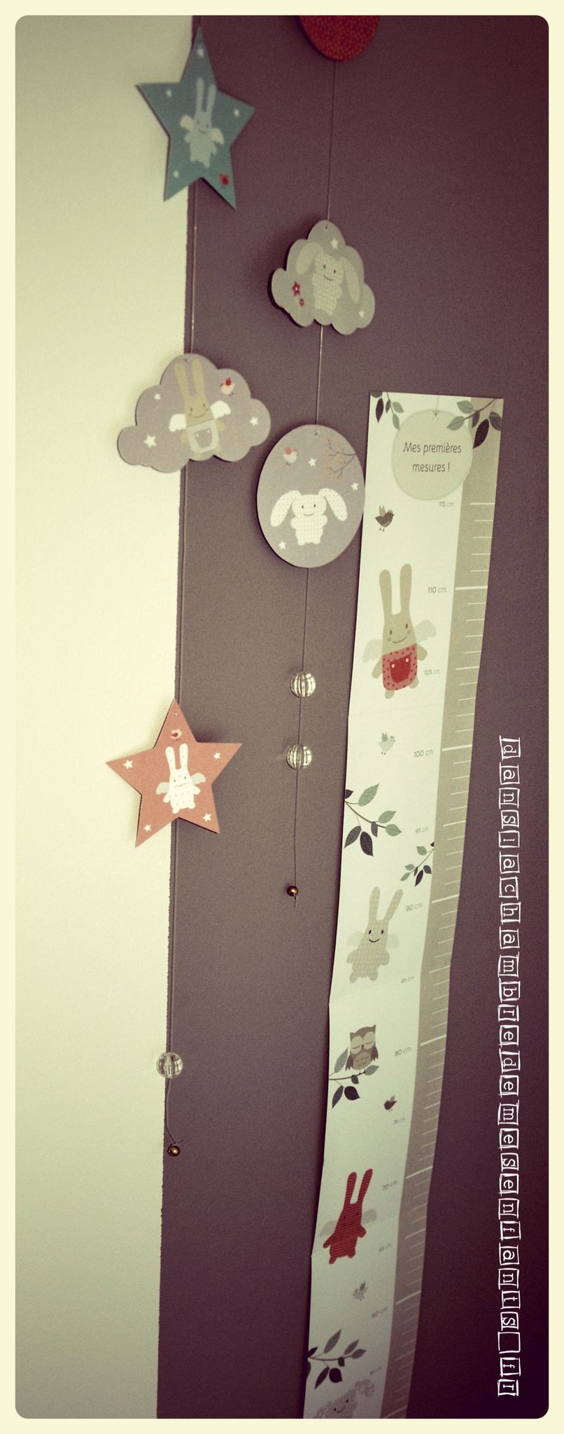 J’en ai profité pour assembler les pièces de la guirlande fournie dans Mon album de bébé du Trousselier à laquelle j’ai donné une forme différente. En effet, la toise de cet ouvrage était déjà installée au mur de ma fille mais elle était trop petite, à mon goût, pour un bon effet déco. Alors j’y ai donné de la hauteur en répartissant les pièces en deux suspensions maintenues bien droites grâce au poids de perles (récupérées de mon porte-clés cassé !) disposées en bout de suspension. Je les ai accrochées au mur tout simplement avec un bout de joli masking tape.