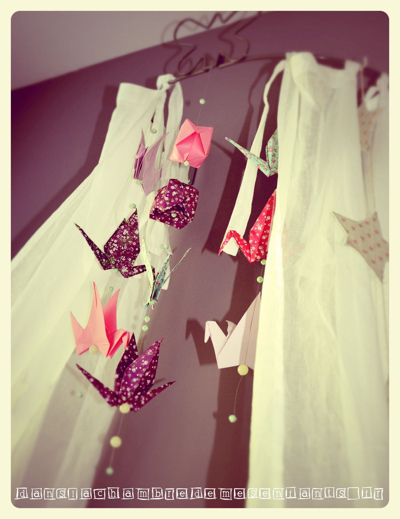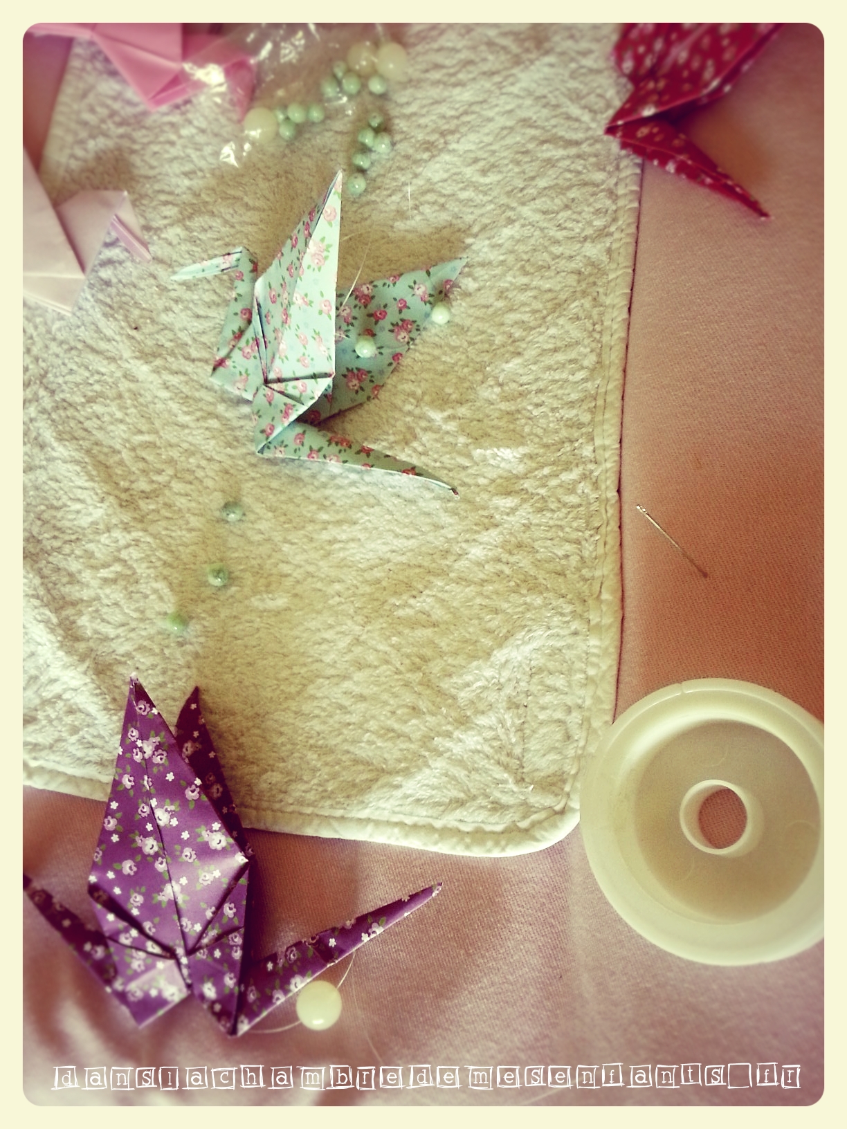 Lorsque j’étais enceinte d’Emi, je me suis essayée à l’origami. Pensant à aménager sa future chambre, j’ai réalisé des grues et des sphères avec du papier style Liberty, sûrement pour la réalisation prochaine d’un mobile mais sans vraiment définir la forme. J’ai choisi des perles en deux tailles pour fixer et agrémenter mon élément de décoration. Le temps passant (cela fait 2 ans quand même) et l’aménagement prenant forme différemment selon mes envies, tout cela est resté de côté (et sur ma « to do list » sans fin !).