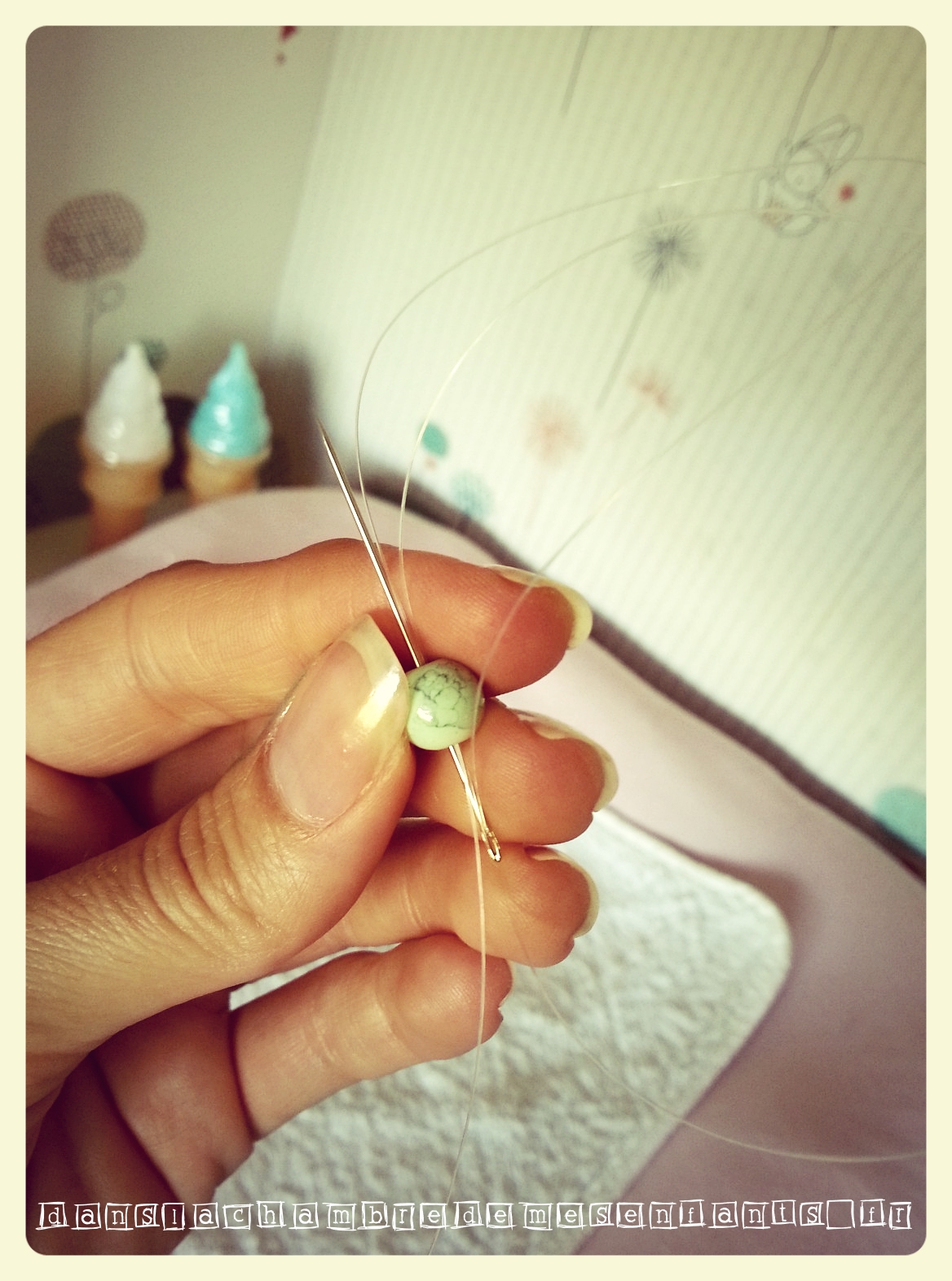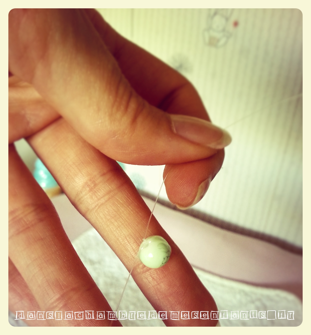 - A l’aide d’une longue aiguille, passer le fil de nylon dans une perle et renouveler le passage pour stabiliser le maintien de la perle. Réitérer avec une ou plusieurs perles comme souhaité.