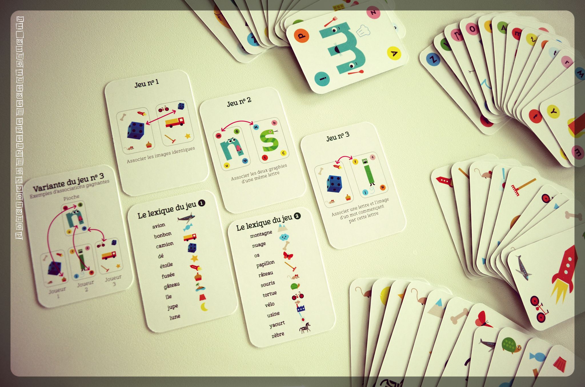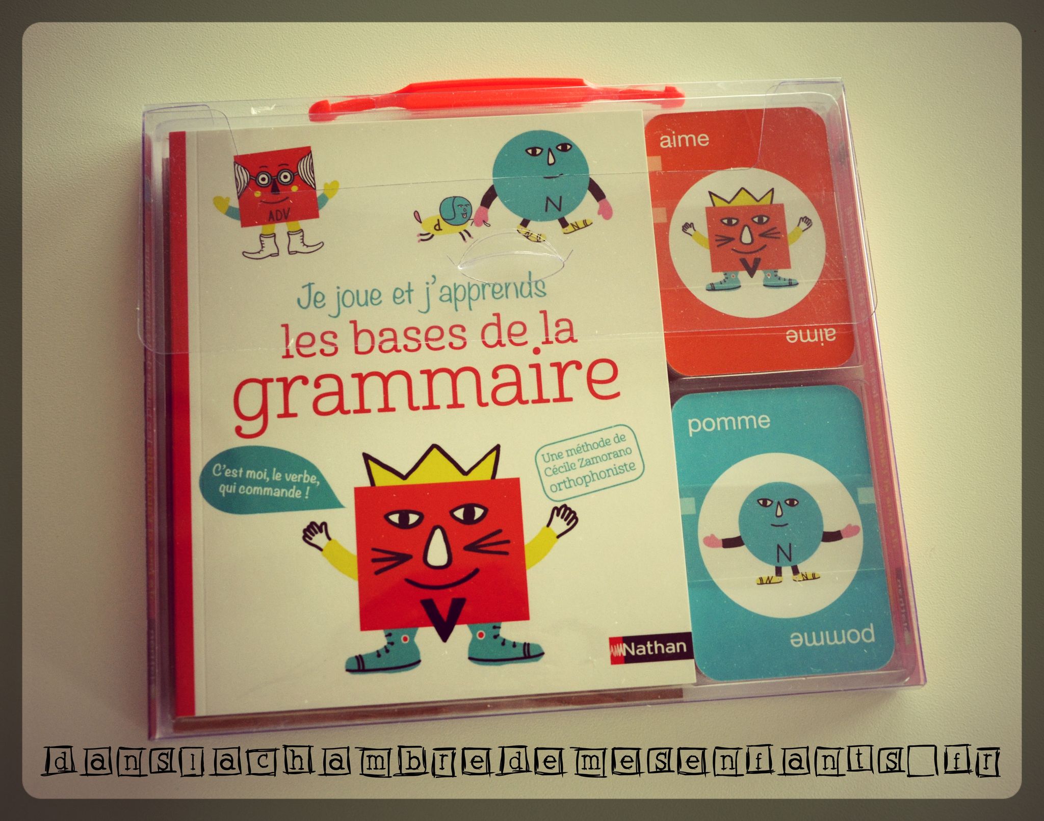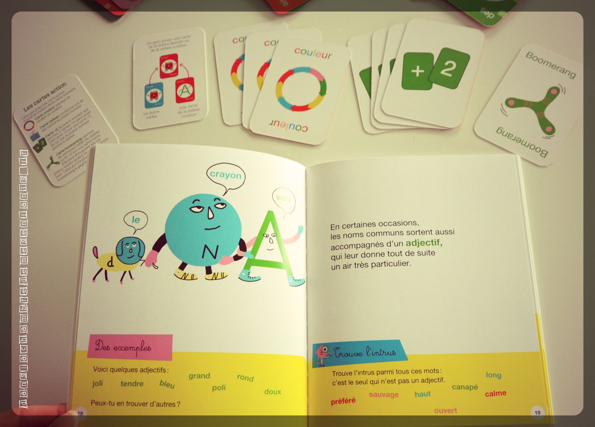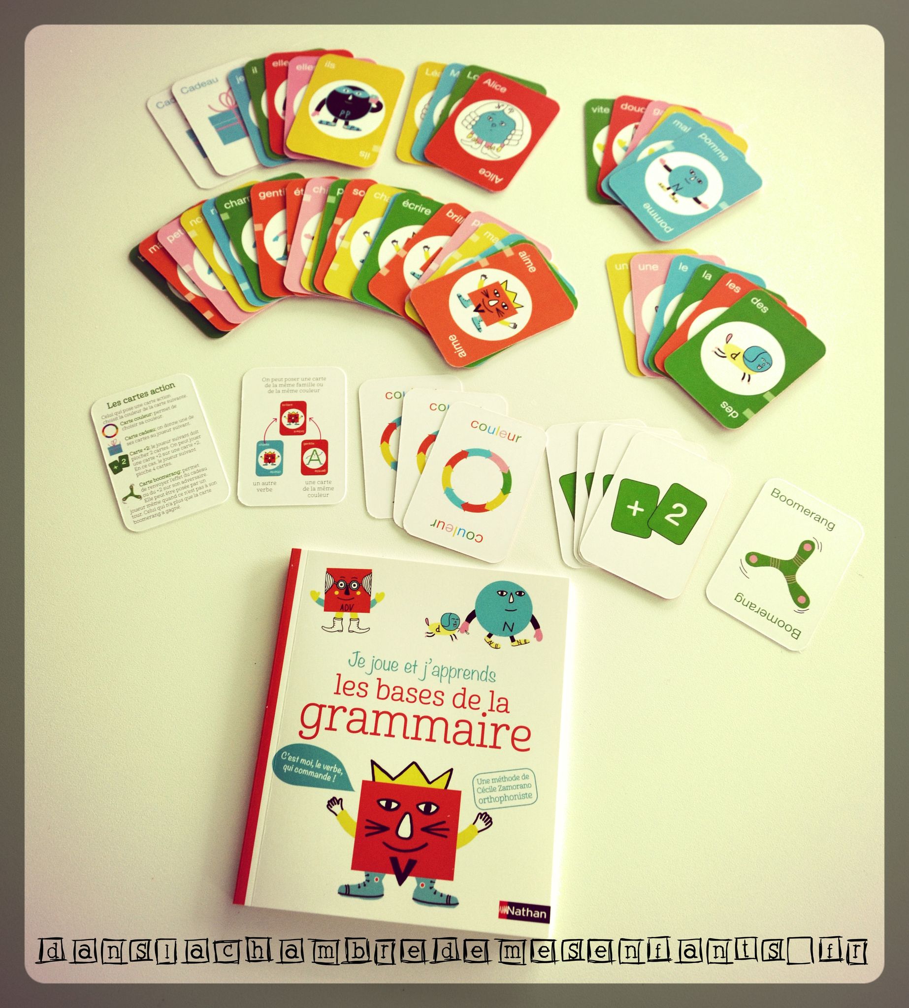 Le jeu de cartes présente les personnages (verbe, nom…) pour suivre le livret, notamment avec l’exercice « A toi de jouer ». Les dessins sont associés à un mot de leur catégorie grammaticale et un trait plus clair permet de vérifier si l’association de carte est correcte (les traits doivent être à la même hauteur pour faire une liaison). Un jeu est proposé avec des cartes complémentaires (couleur, cadeau, carte+2 et boomerang) en associant les couleurs ou les familles. Il est conseillé de jouer en annonçant la catégorie grammaticale et de lire le mot écrit sur la carte pour permettre à l’enfant de se familiariser plus facilement.