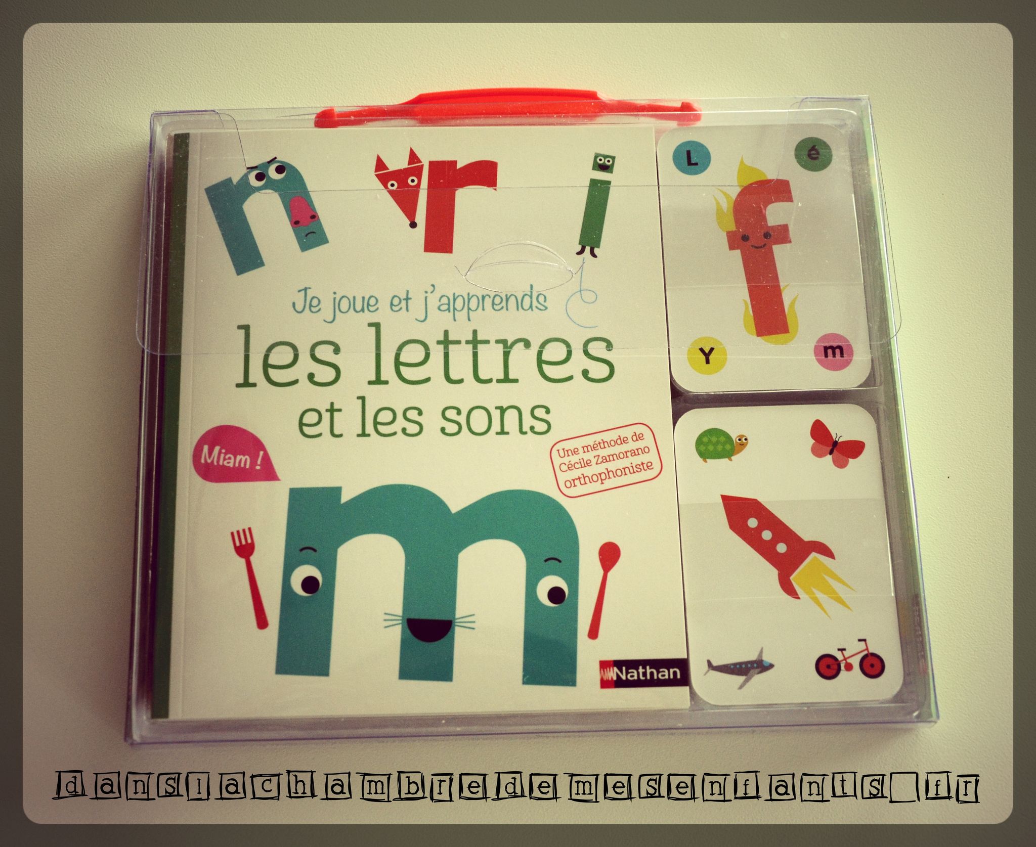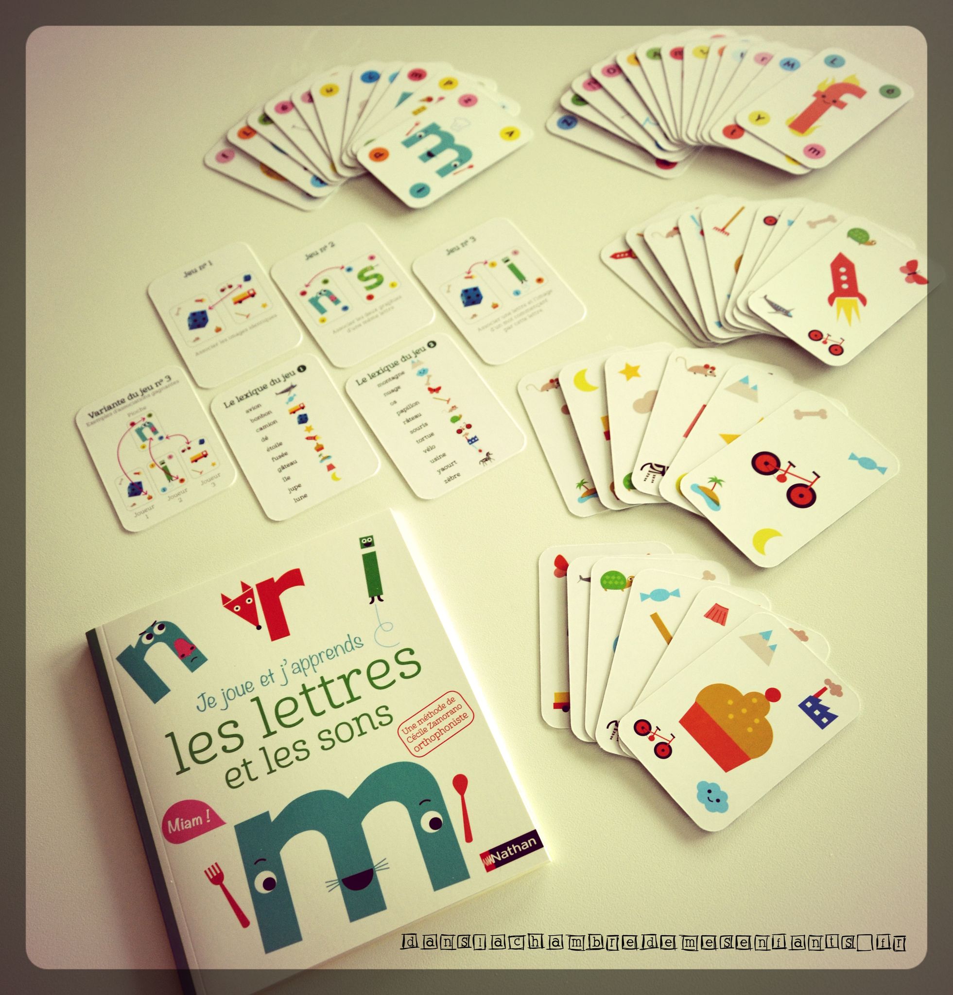 Il s’agit de coffrets, sous format plastifié, contenant des cartes et un petit livret. Ce dernier commence par une brève explication et des pages de leçons et d’exercices courts et illustrés par des personnages très colorés (avec leur petit caractère).Tous deux ont été élaborés par Cécile Zamorano, orthophoniste.