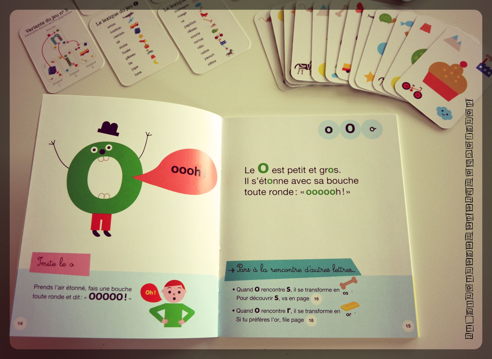 L’avis des enfants : Alex a déjà acquis l’apprentissage des sons cependant l’association de certaines lettres fait partie de la découverte actuelle et le jeu de cartes l’a intéressé. Il s’est laissé tenté par un essai. Le second ouvrage n’est pas encore au programme et il aura donc l’occasion de le parcourir dans un an.