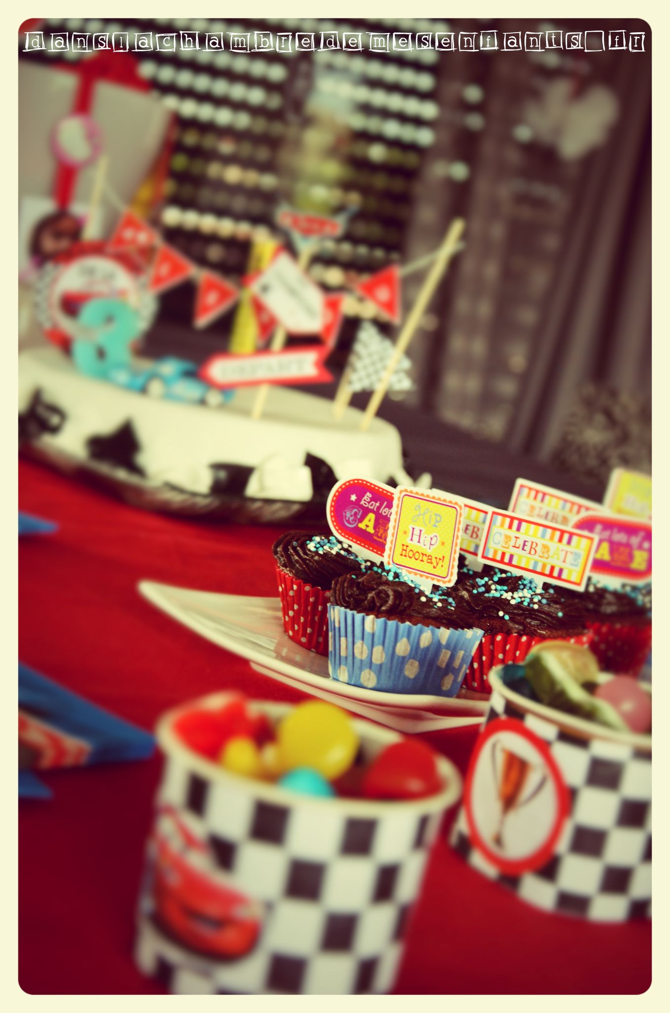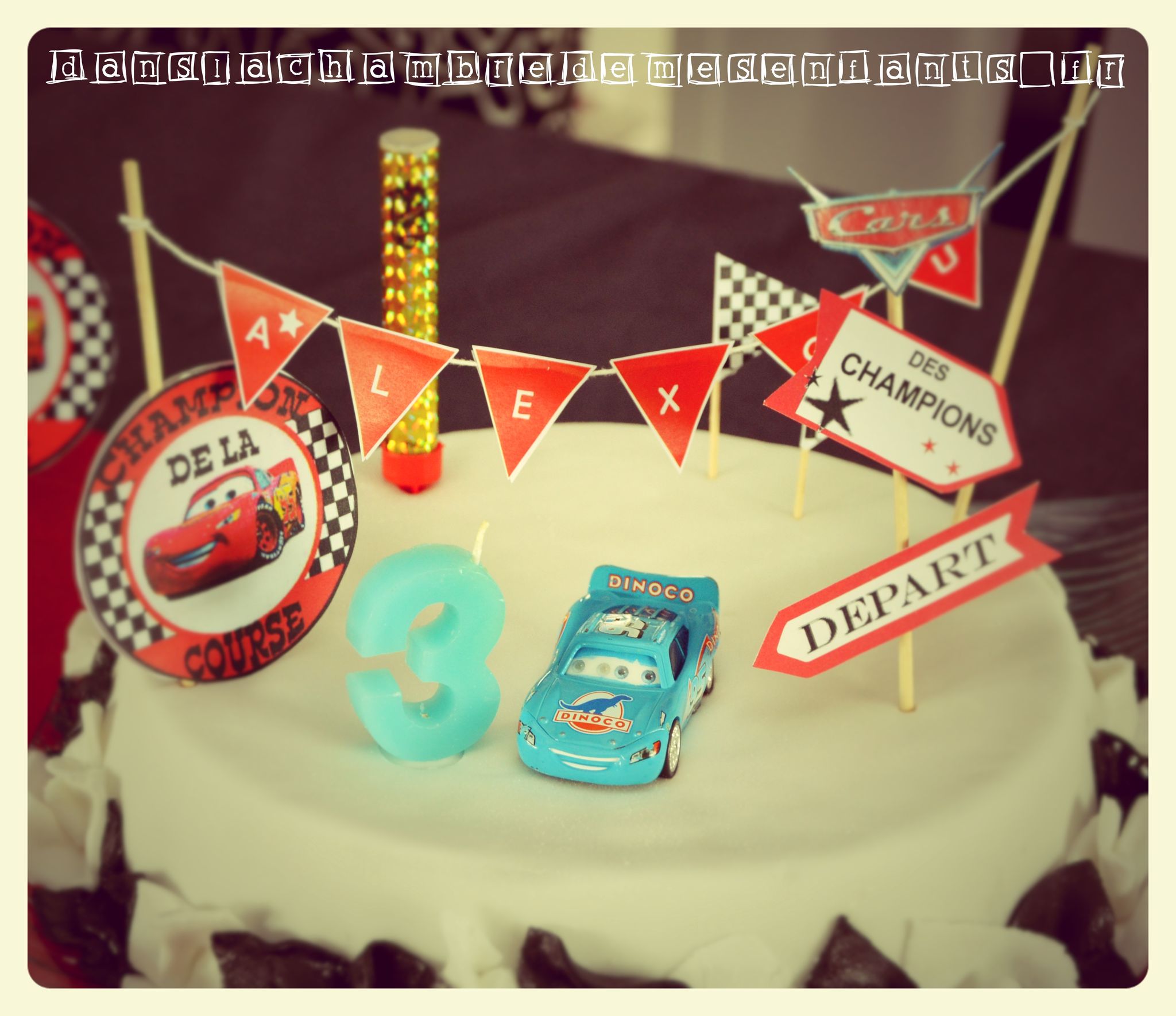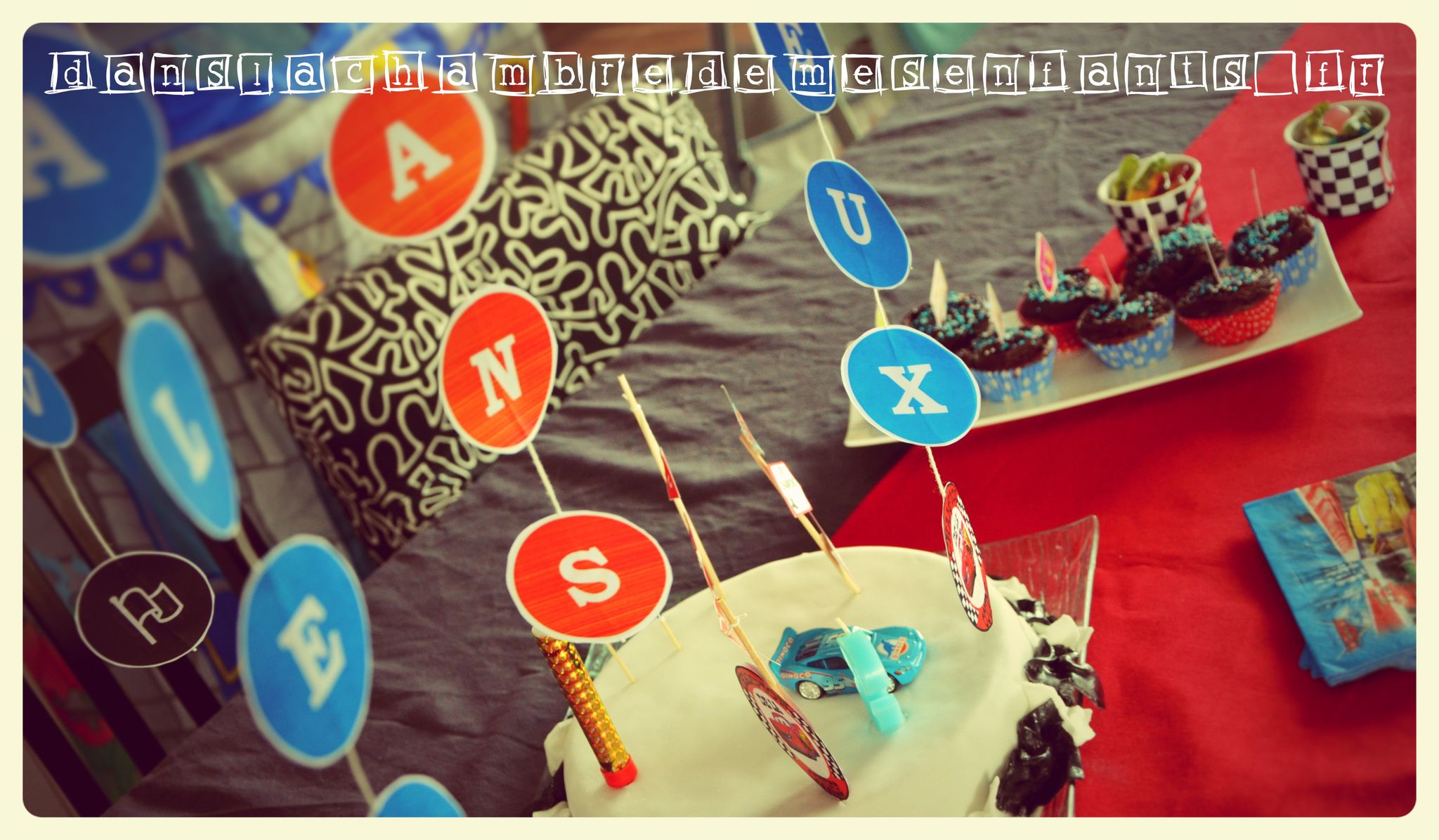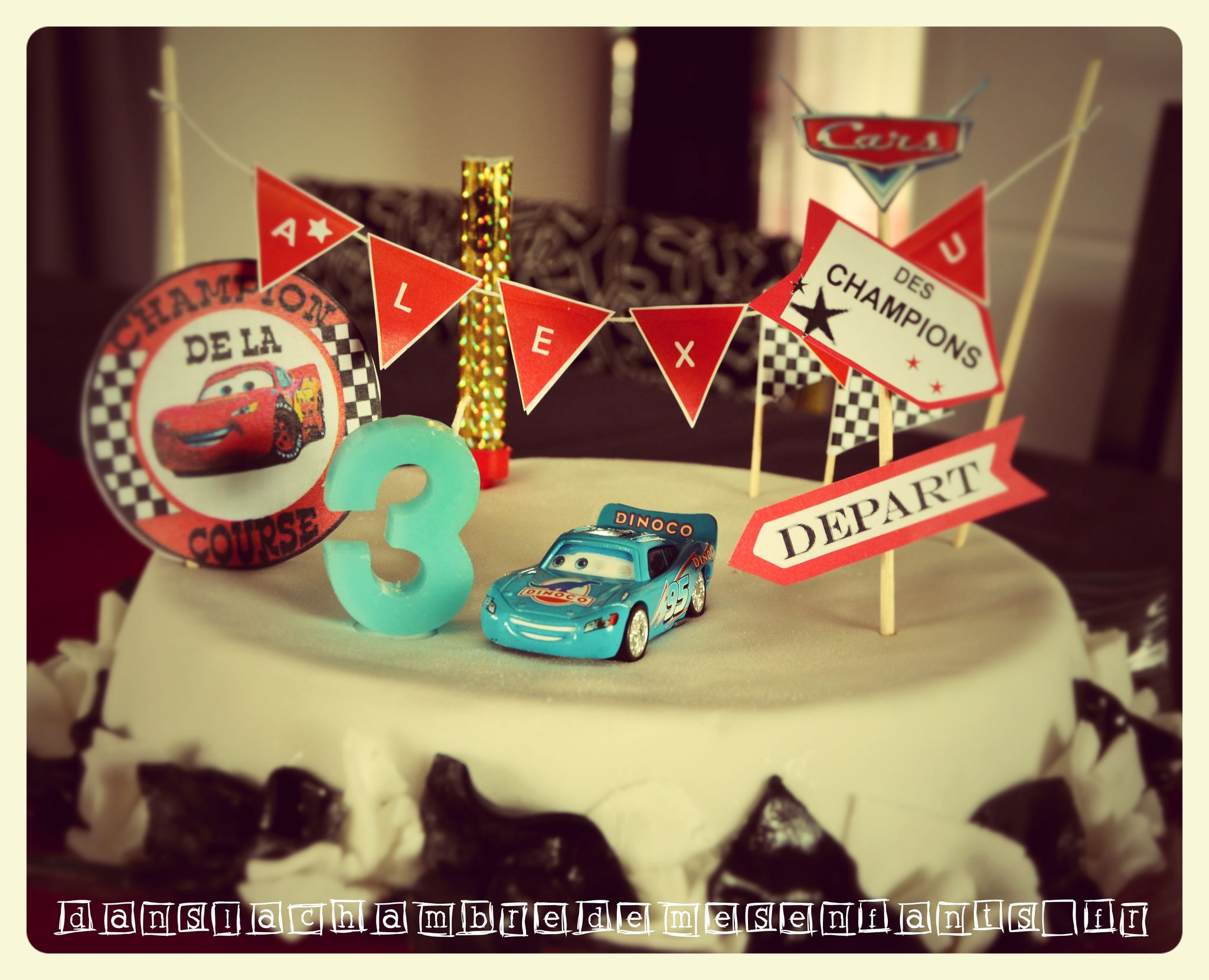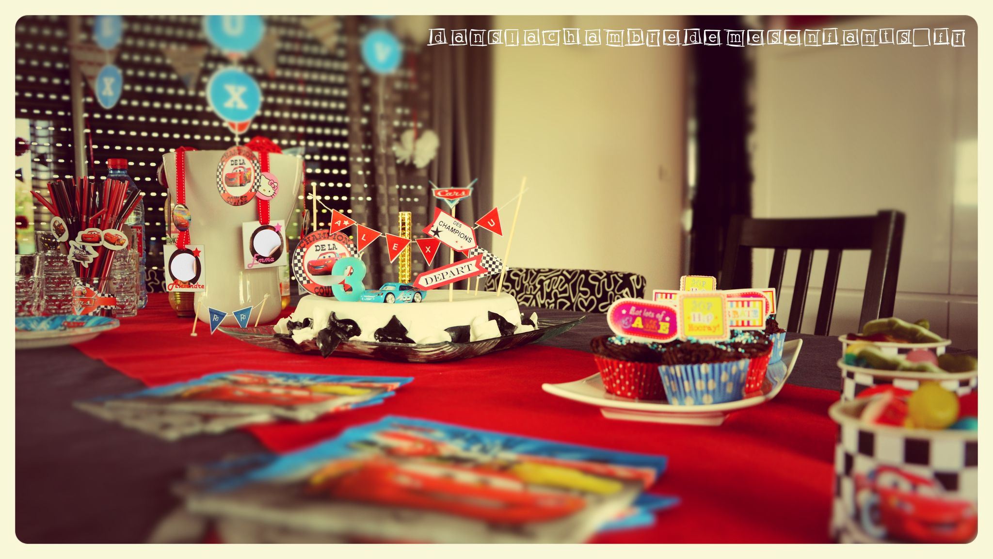 Le troisième anniversaire d’Alex a réellement été le premier pour lequel j’ai voulu préparer une décoration complète et plonger mon fils dans l’univers qu’il adorait alors. Cela a commencé par la définition d’un thème précis et un code couleurs pour un bon rendu de l’ensemble. Passionné de CARS, cela était vite décidé et les couleurs ont donc été noir et blanc (damier), rouge (comme Flash Mc Queen) rehaussées de bleu. Ce n’est pas la décoration la plus travaillée ni la plus réussie mais je joue ici le jeu de remonter le temps pour partager les idées du moment.