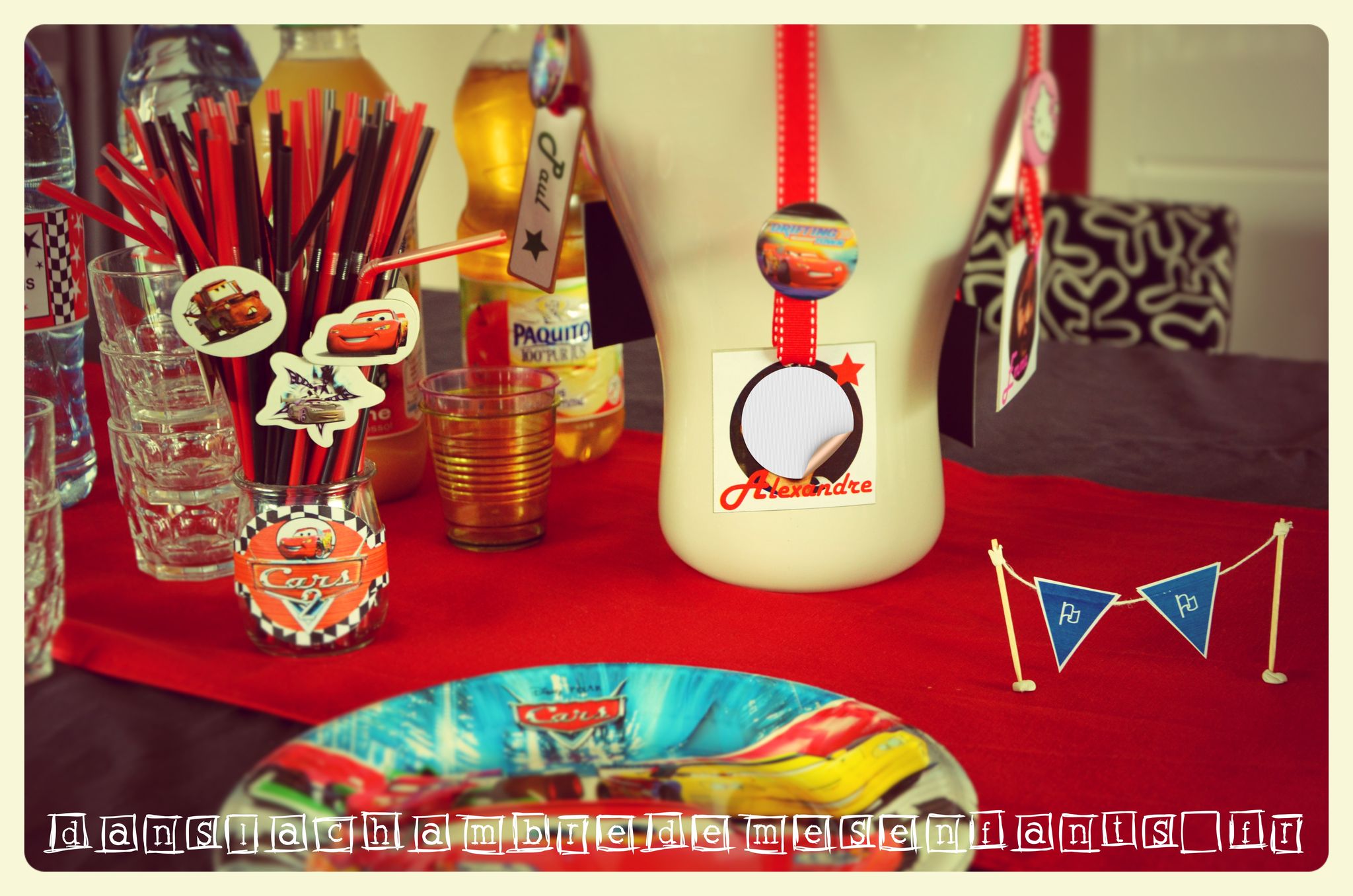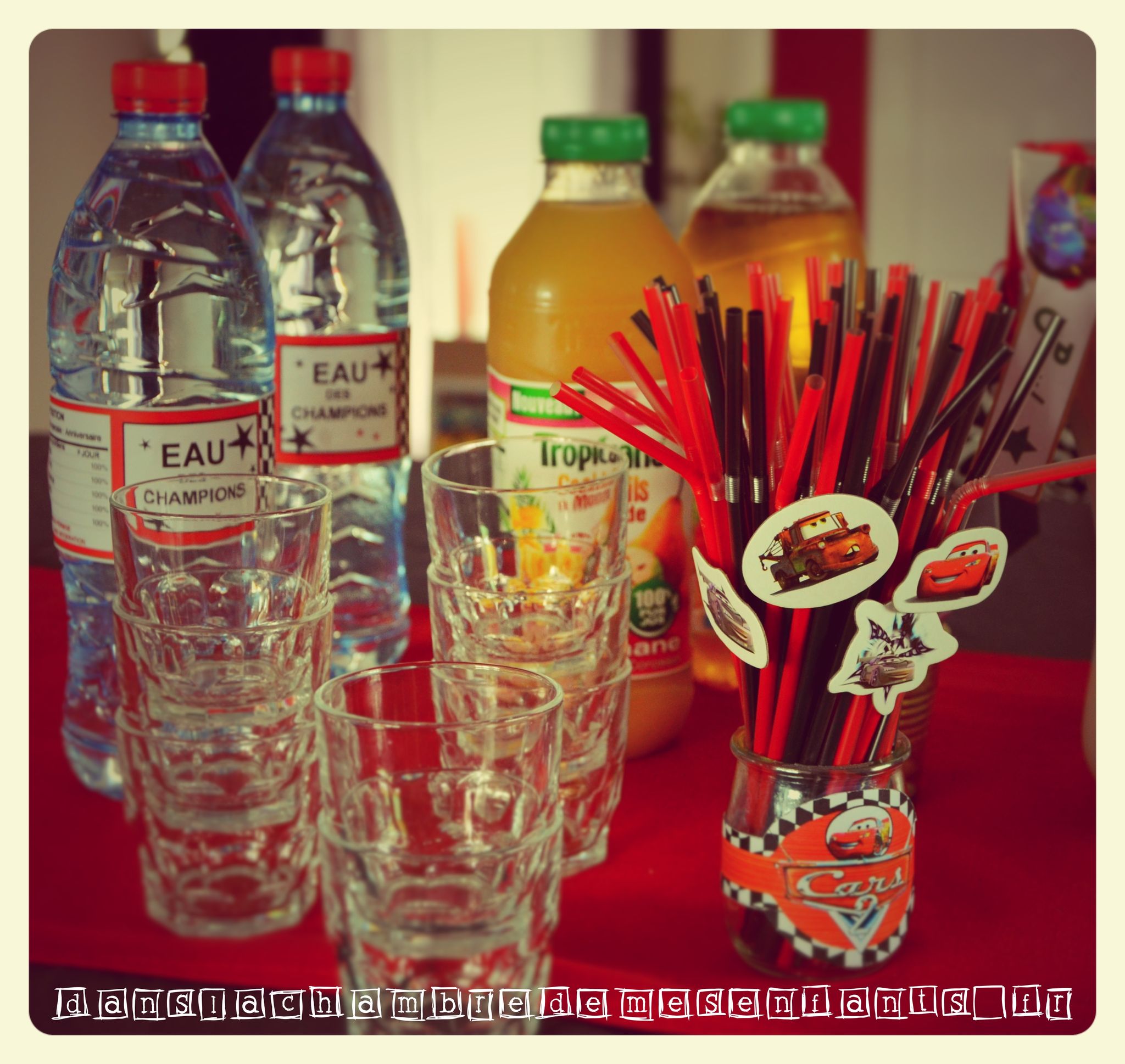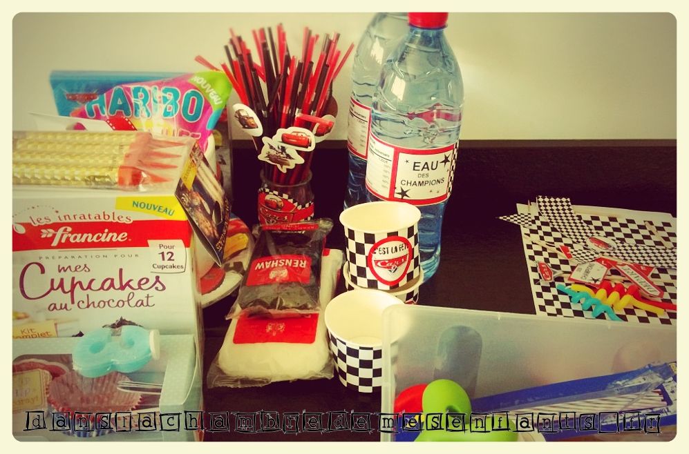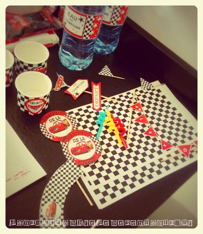 A partir de feuilles à damier (une simple feuille Excel avec remplissage d’une cellule sur deux) j’ai improvisé des décorations supplémentaires comme les pots à bonbons et j’ai réalisé une banderole de gâteau, décoration complétée par un exemplaire de Flash Mc Queen manquant à la collection d’Alex. Les autres enfants ont aussi eu une voiture à découvrir en tirant le ruban à leur nom, accompagné d’un badge (cadeaux invités). Les écussons et autres déco à l’effigie de Cars, comme celle du gâteau et des bouteilles, sont disponibles gratuitement sur un site qui fournit des décorations sur plein de thèmes différents. Il s’agit de 1 et 2 et 3 doudous. Il y en a pour tous les goûts et vous y trouverez certainement votre bonheur. J’ai aussi improvisé pour améliorer la table en détournant les ronds de serviettes pour décorer des pots en verre et des figures cartonnées (achetées en grand nombre chez Gifi) pour décorer des pailles.