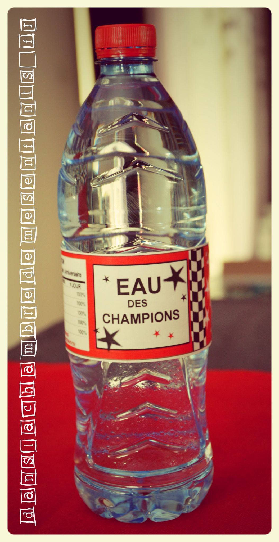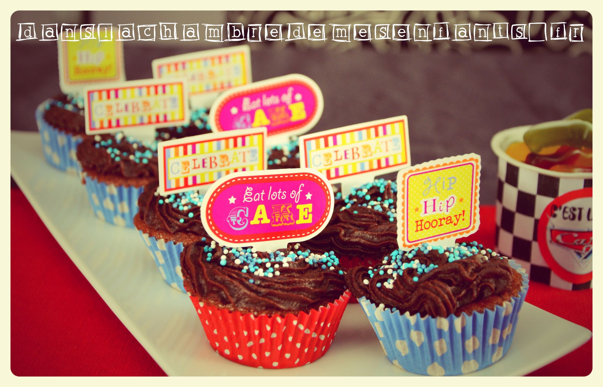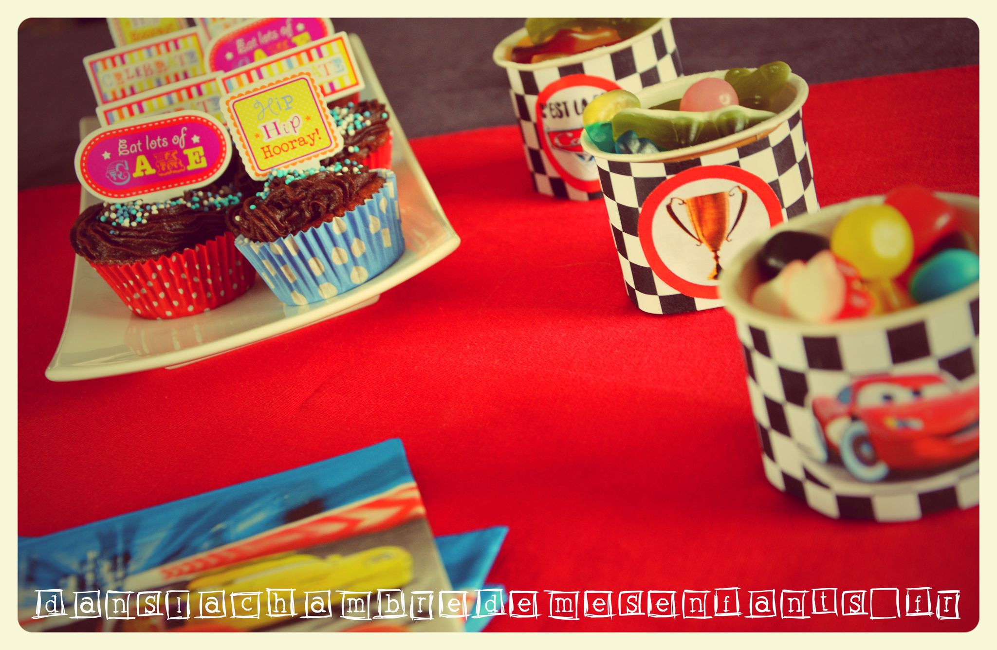 A partir de feuilles à damier (une simple feuille Excel avec remplissage d’une cellule sur deux) j’ai improvisé des décorations supplémentaires comme les pots à bonbons et j’ai réalisé une banderole de gâteau, décoration complétée par un exemplaire de Flash Mc Queen manquant à la collection d’Alex. Les autres enfants ont aussi eu une voiture à découvrir en tirant le ruban à leur nom, accompagné d’un badge (cadeaux invités). Les écussons et autres déco à l’effigie de Cars, comme celle du gâteau et des bouteilles, sont disponibles gratuitement sur un site qui fournit des décorations sur plein de thèmes différents. Il s’agit de 1 et 2 et 3 doudous. Il y en a pour tous les goûts et vous y trouverez certainement votre bonheur. J’ai aussi improvisé pour améliorer la table en détournant les ronds de serviettes pour décorer des pots en verre et des figures cartonnées (achetées en grand nombre chez Gifi) pour décorer des pailles.