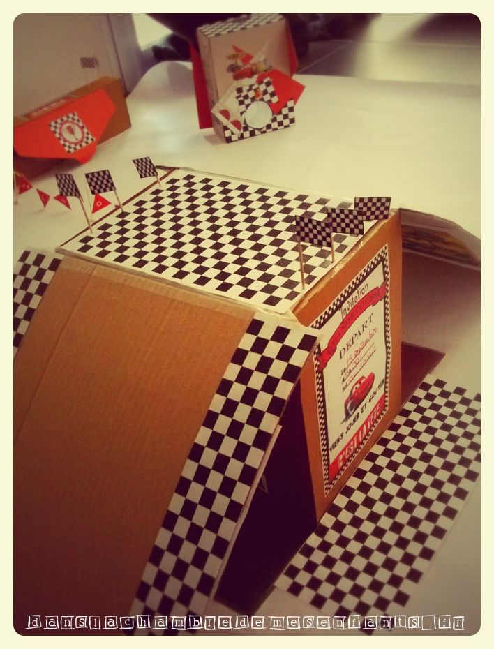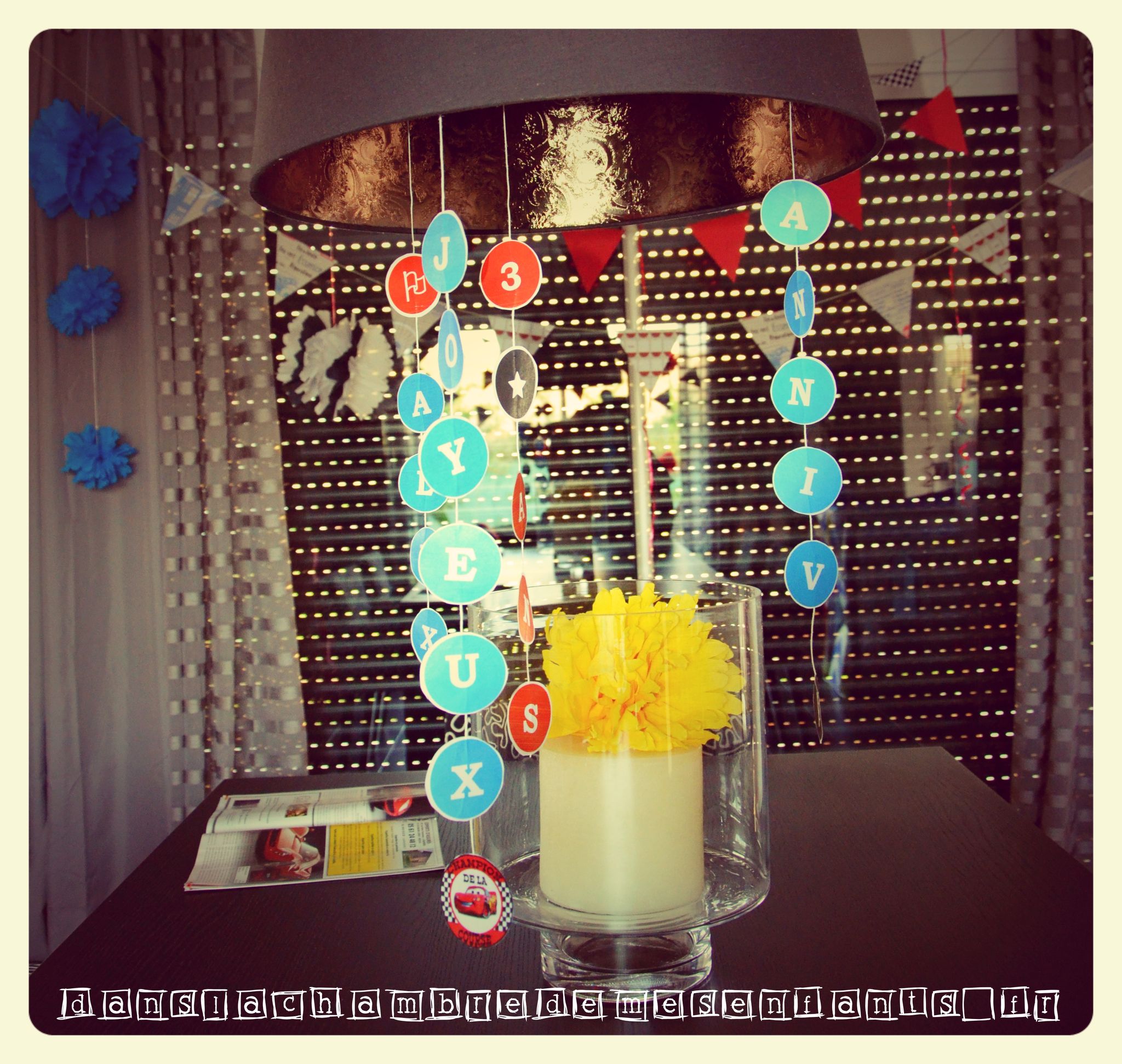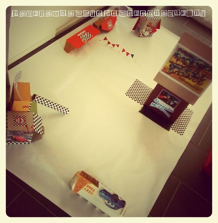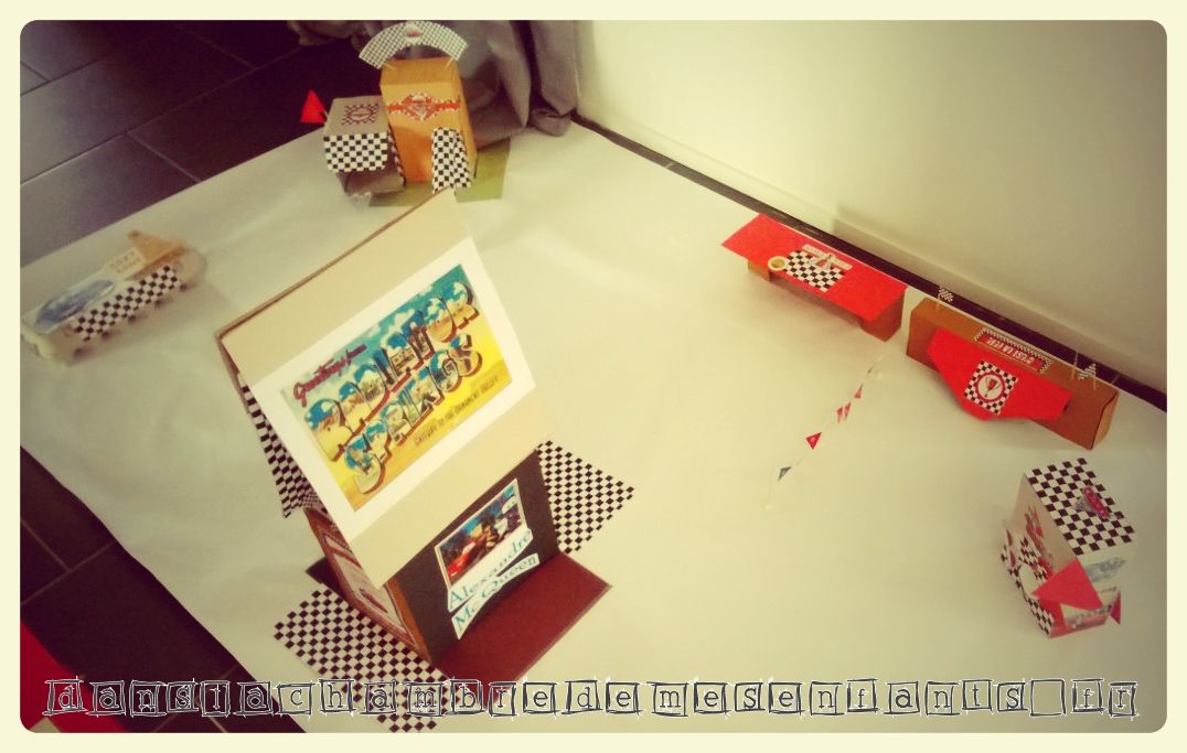 J’ai confectionné des guirlandes avec des Canson double face et du fil culinaire, des pompons, une suspension pour habiller le luminaire qui s’imposer au-dessus de la table et permettait de décorer en volume la pièce (désolé pour le rendu sur photos, le volet roulant de la baie était alors en panne). A la dernière minute, j’ai aussi recyclé de vieilles feuilles et des boîtes d’emballage pour réaliser un mini Radiator Springs avec un panneau publicitaire qui se dépliait pour se transformer en tremplin. Le tout était donc jetable pour que les enfants s’amusent avec un jeu éphémère, juste le temps de son anniversaire. J’ai aussi décoré la chambre de mon fils pendant son sommeil avec des guirlandes, des ballons et des affiches du film pour une belle surprise à son réveil le jour J.