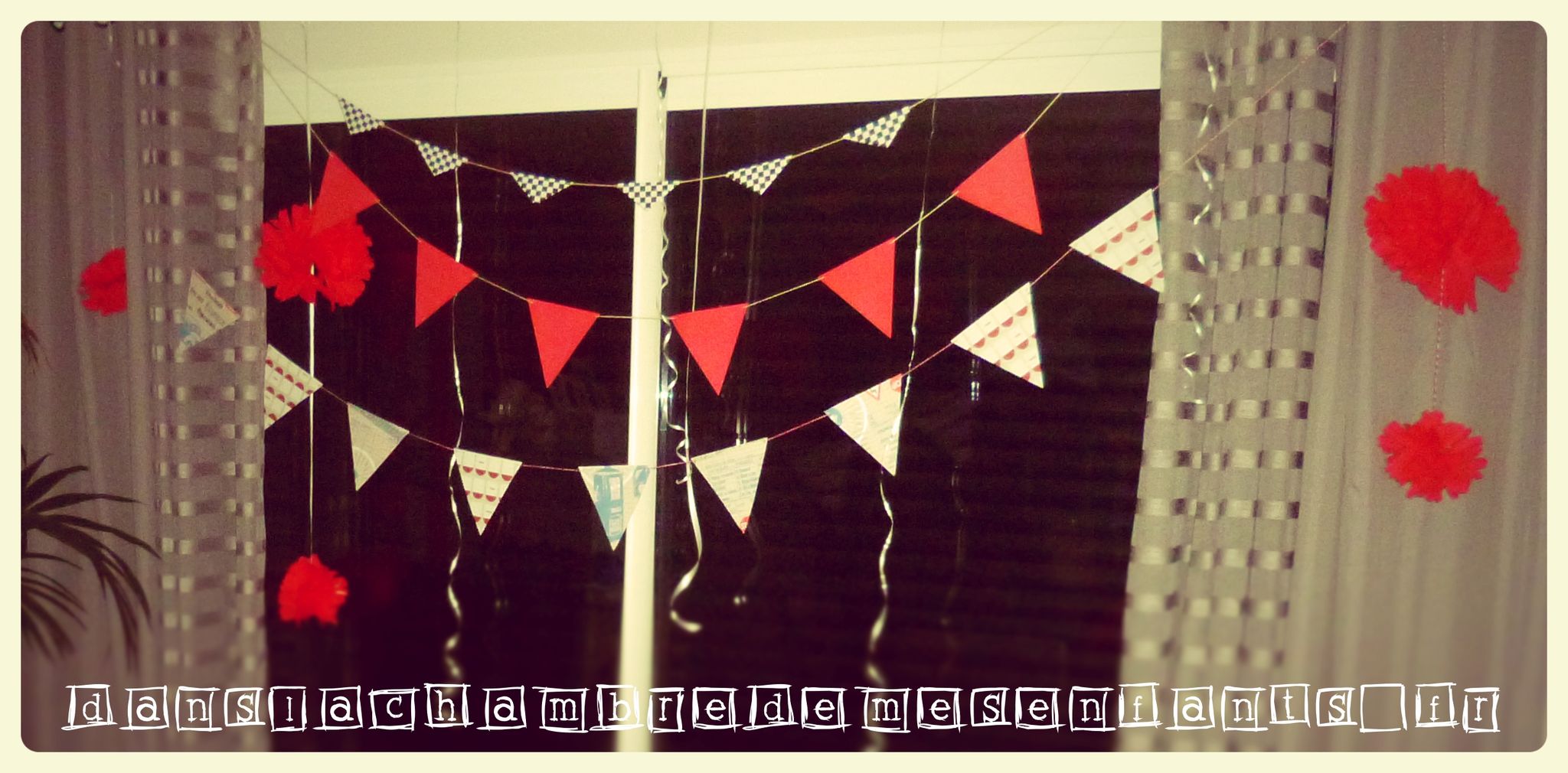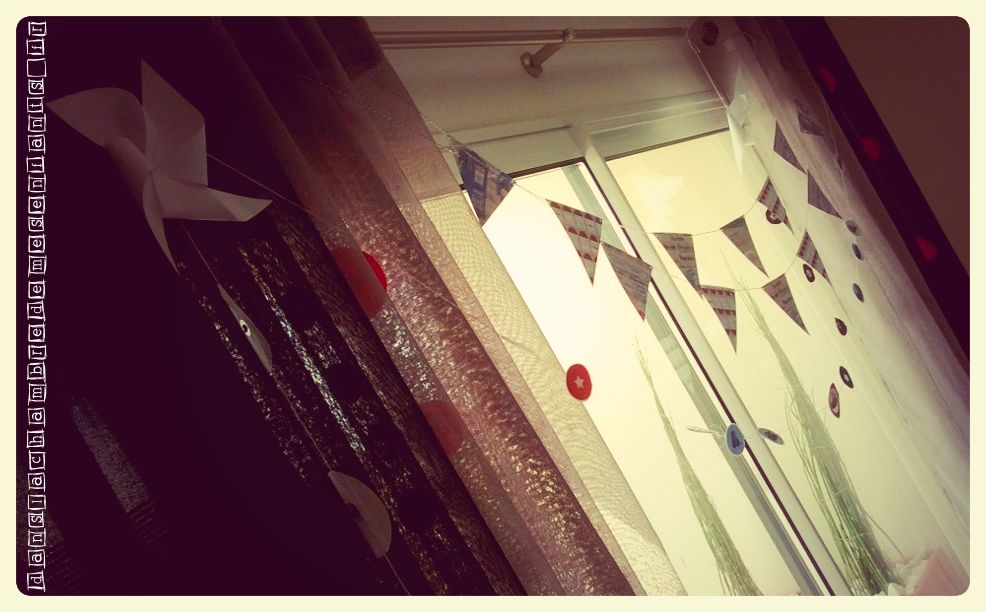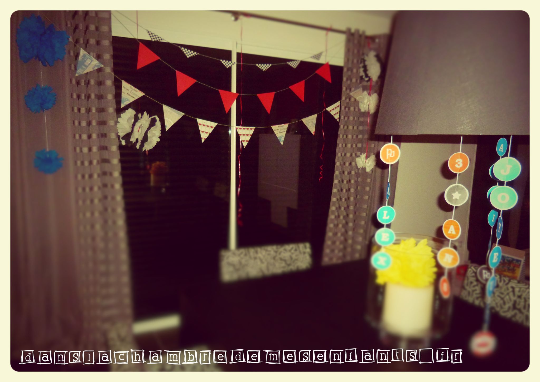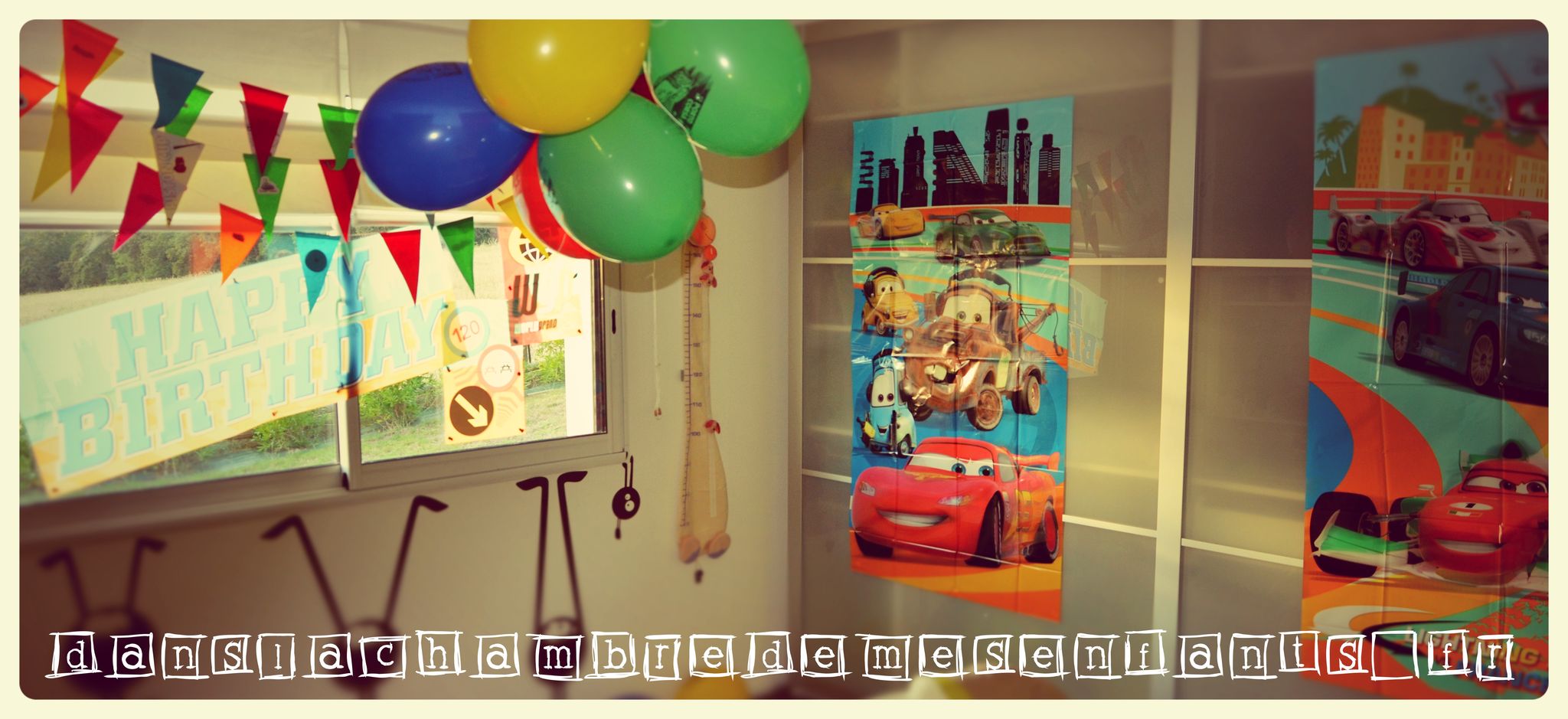 J’ai confectionné des guirlandes avec des Canson double face et du fil culinaire, des pompons, une suspension pour habiller le luminaire qui s’imposer au-dessus de la table et permettait de décorer en volume la pièce (désolé pour le rendu sur photos, le volet roulant de la baie était alors en panne). A la dernière minute, j’ai aussi recyclé de vieilles feuilles et des boîtes d’emballage pour réaliser un mini Radiator Springs avec un panneau publicitaire qui se dépliait pour se transformer en tremplin. Le tout était donc jetable pour que les enfants s’amusent avec un jeu éphémère, juste le temps de son anniversaire. J’ai aussi décoré la chambre de mon fils pendant son sommeil avec des guirlandes, des ballons et des affiches du film pour une belle surprise à son réveil le jour J.