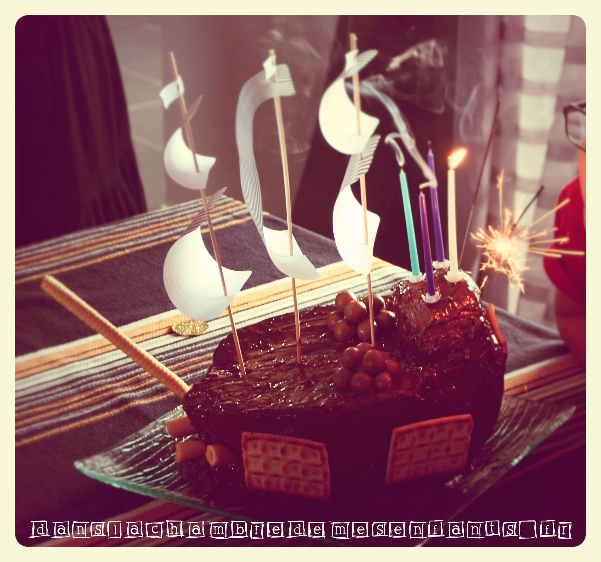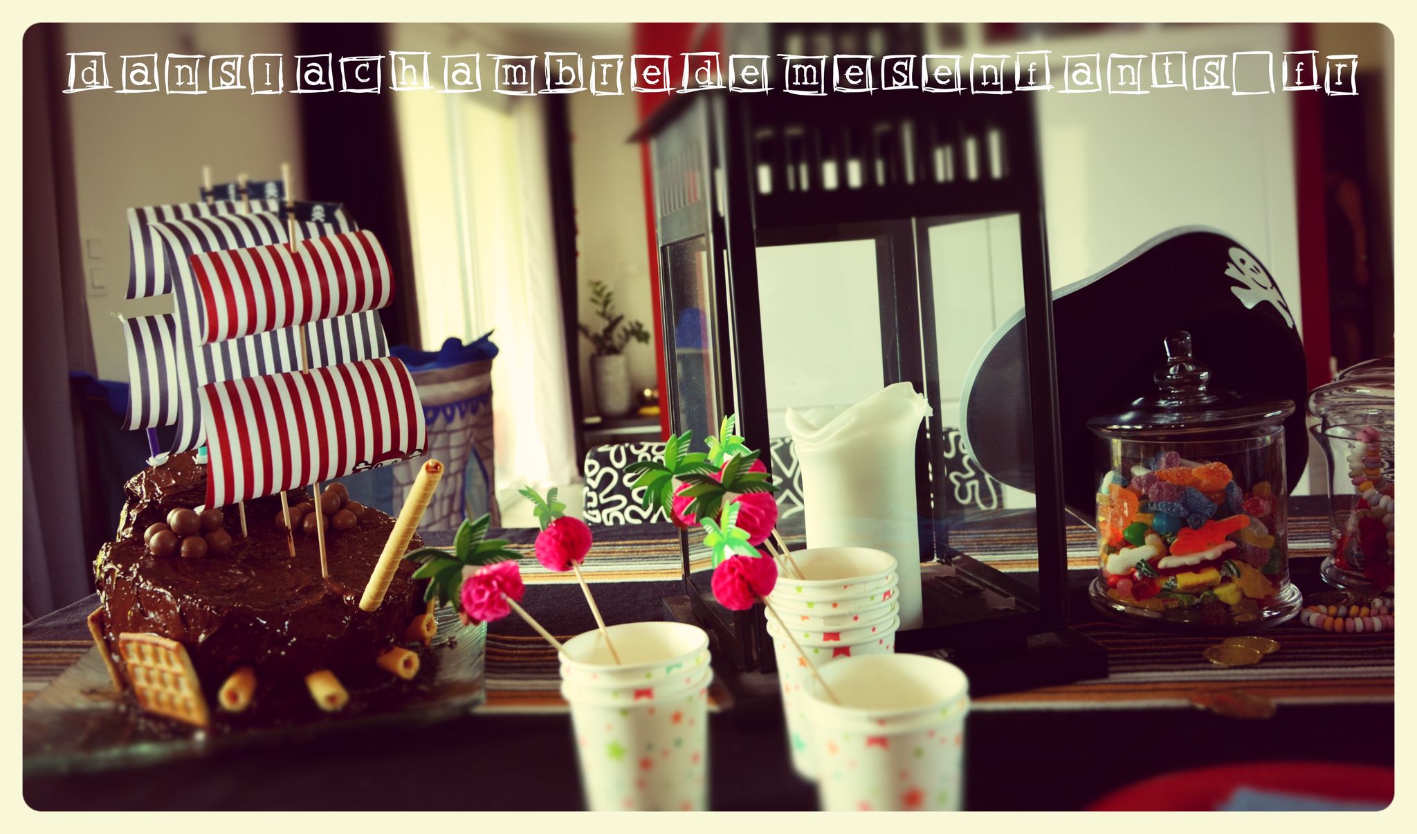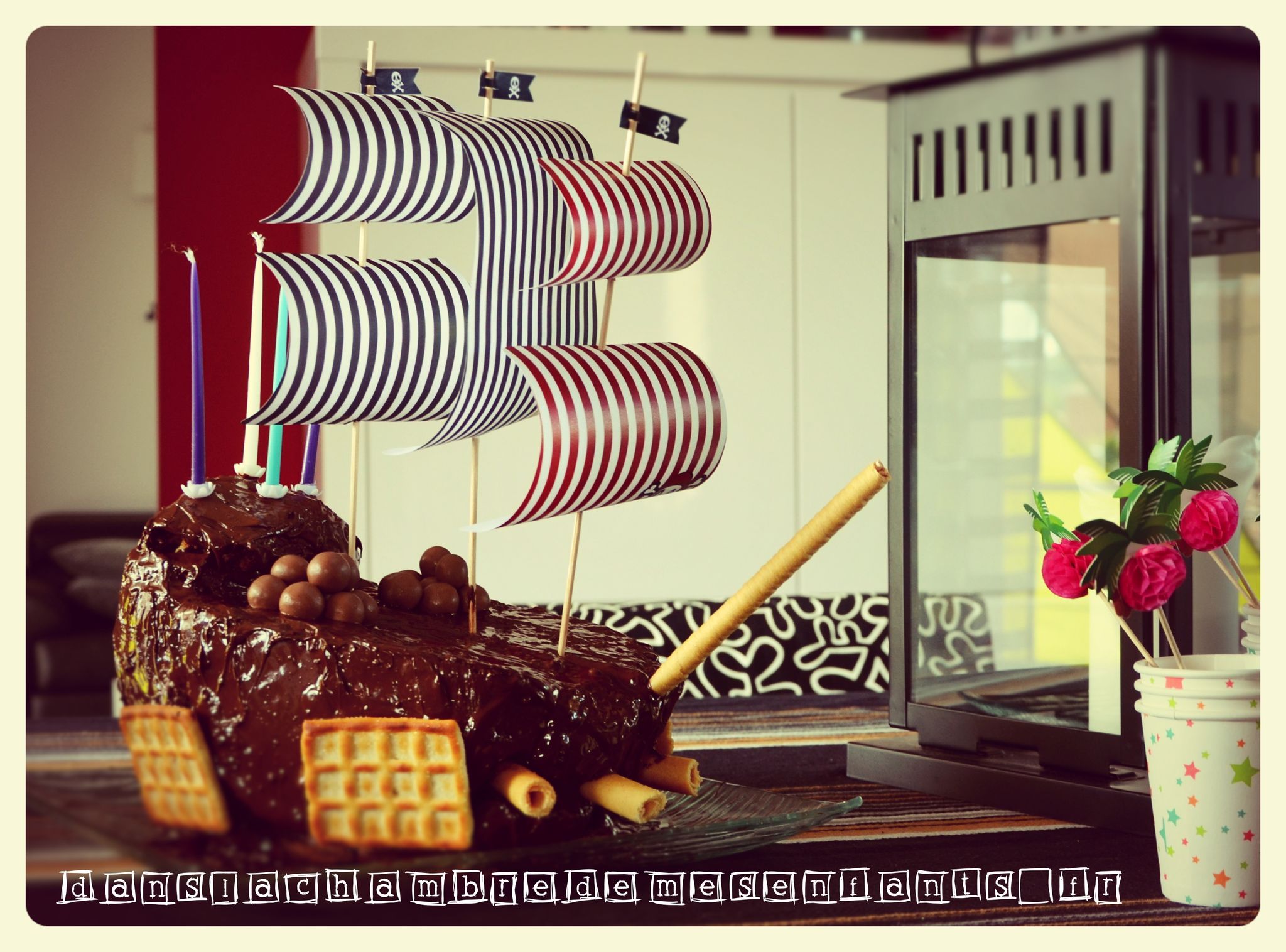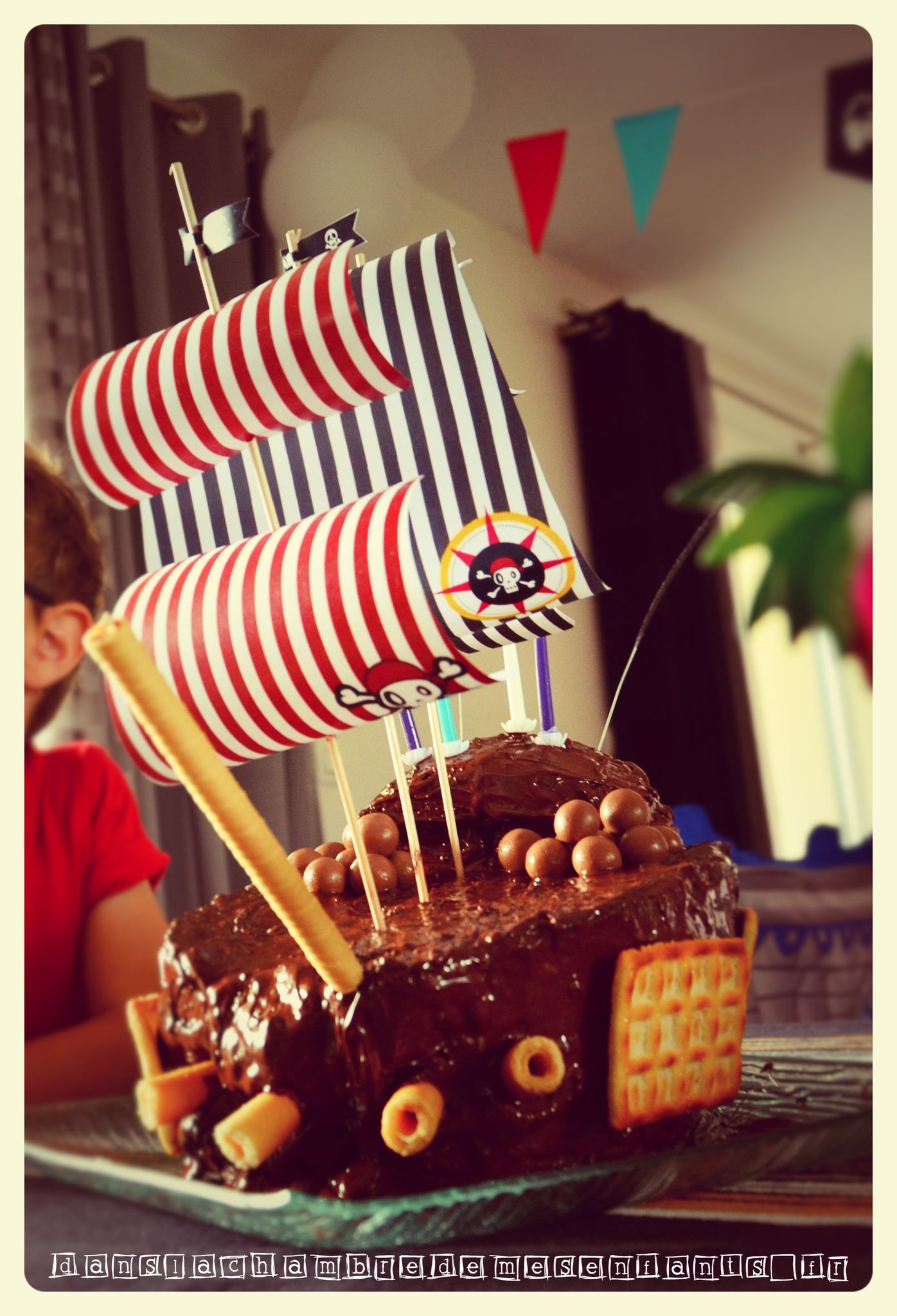 Pour ce dernier goûter en présence d’adultes, j’ai misé sur un grand gâteau au chocolat. Bien des parents se sont essayés à la réalisation du gâteau en forme de bateau de pirates et j’en fais partie ! Je ne suis pas fan des recettes avec une tonne de beurre alors j’ai gardé ma recette de gâteau aux yaourts (je ne suis pas pâtissière mais il fallait bien arriver à faire ce navire !) que j’ai décoré de biscuits et de voiles faites maison. Si vous ne trouvez pas de modèle à votre goût, utilisez un simple document Word et faites de grandes zones de texte (c’est mieux pour gérer les dimensions et les disposer) avec remplissage rayé (pourquoi faire compliqué…). Pour ajouter un écusson de pirate, il suffit de prévoir une zone supplémentaire avec une insertion d’image. Vous découpez ensuite ces pages en forme trapézoïdale que vous percez avec un pic à grillade (!).