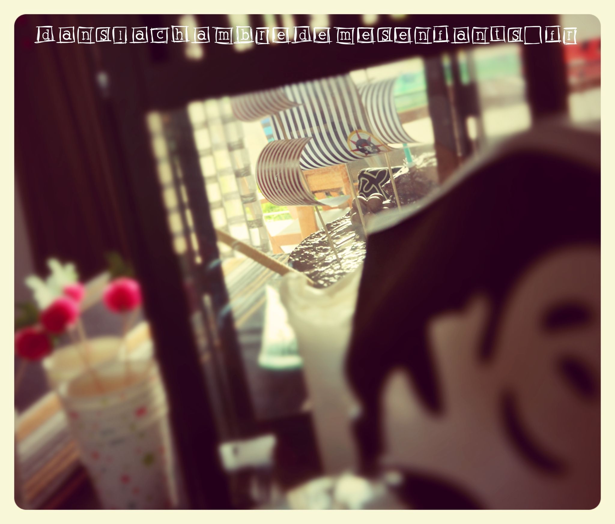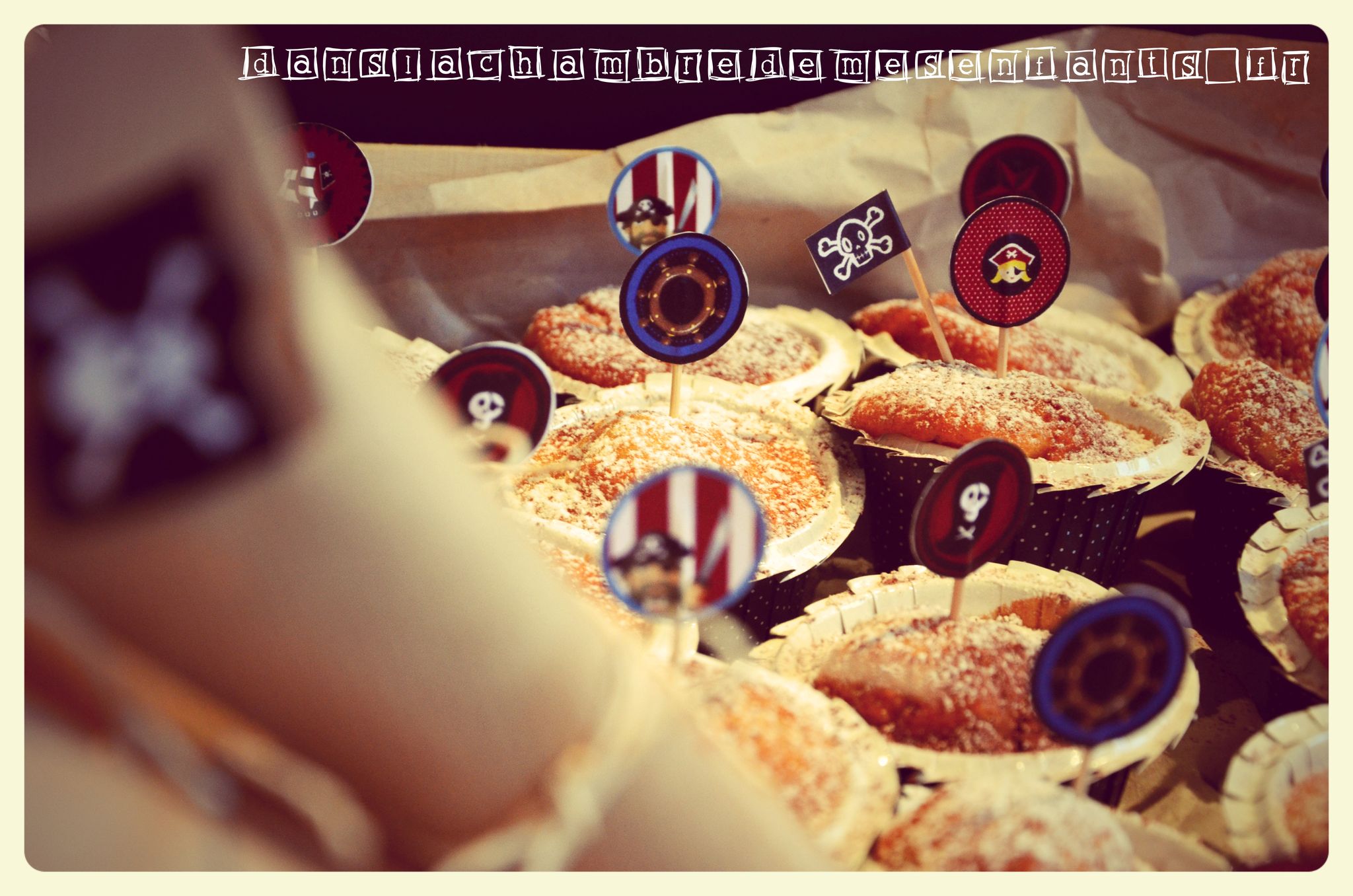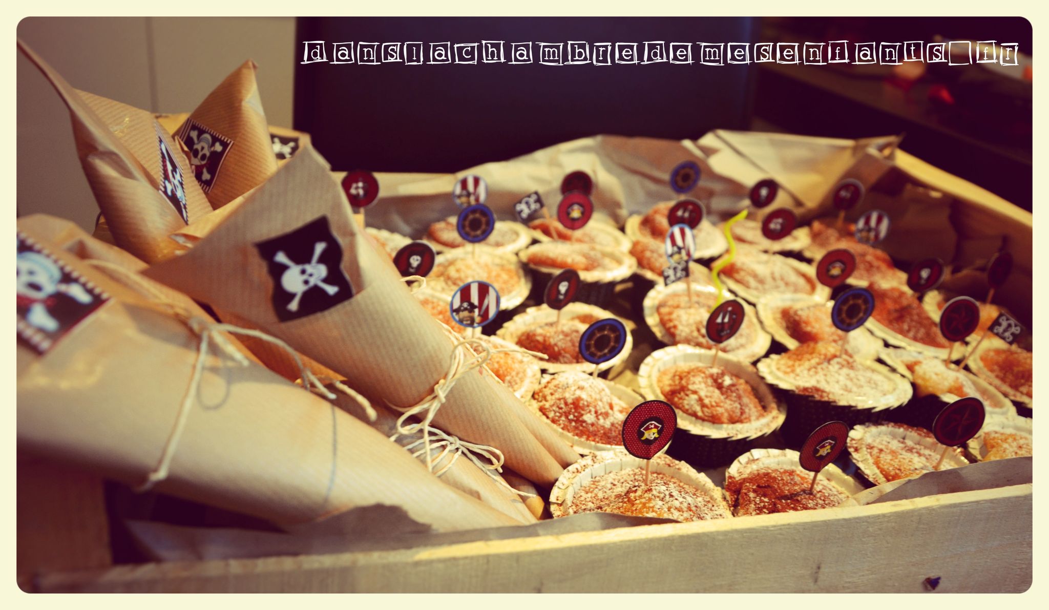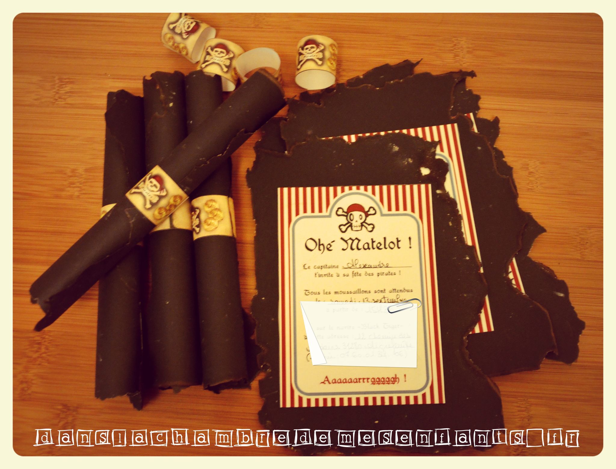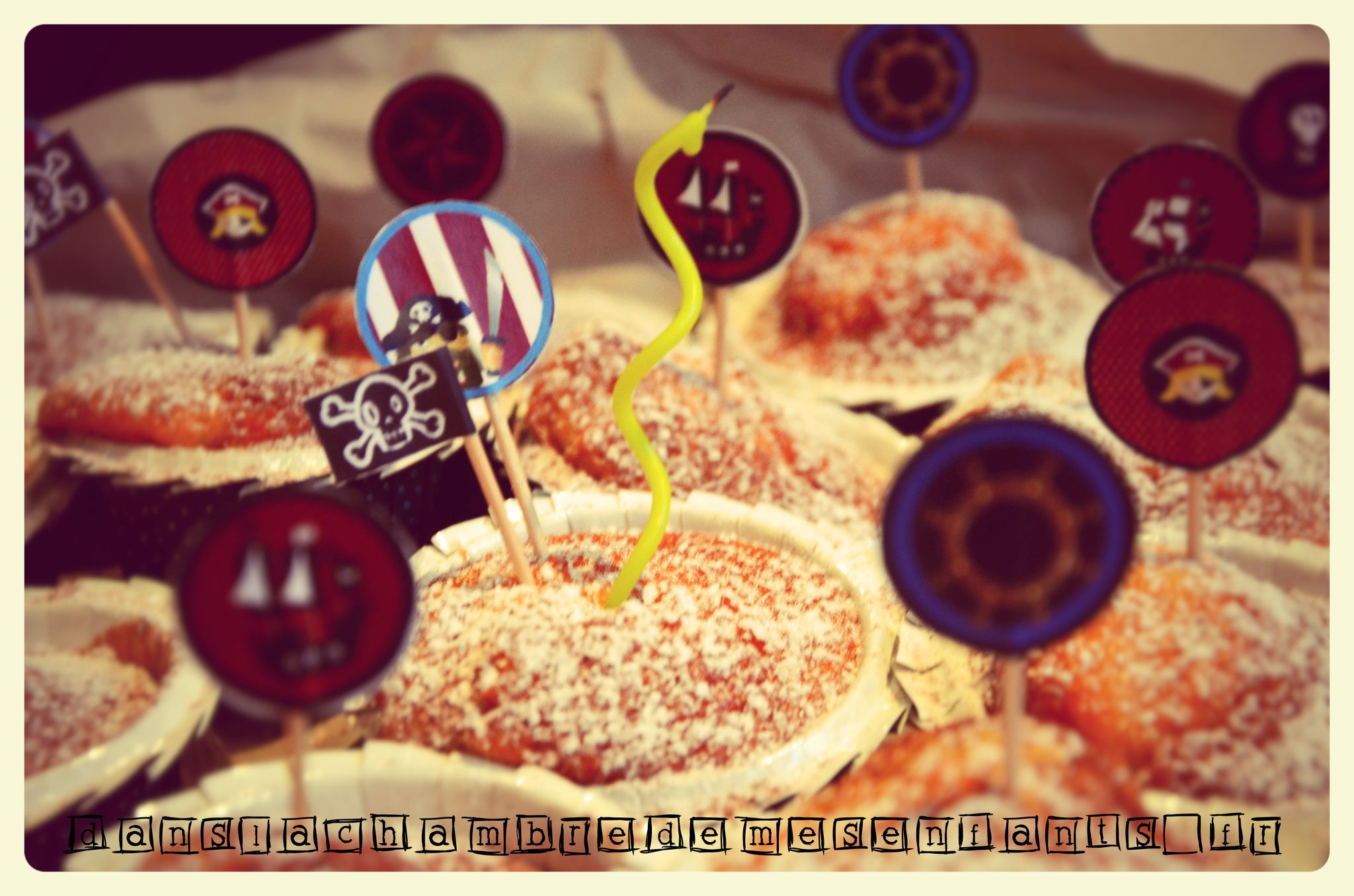 Pour ce dernier goûter en présence d’adultes, j’ai misé sur un grand gâteau au chocolat. Bien des parents se sont essayés à la réalisation du gâteau en forme de bateau de pirates et j’en fais partie ! Je ne suis pas fan des recettes avec une tonne de beurre alors j’ai gardé ma recette de gâteau aux yaourts (je ne suis pas pâtissière mais il fallait bien arriver à faire ce navire !) que j’ai décoré de biscuits et de voiles faites maison. Si vous ne trouvez pas de modèle à votre goût, utilisez un simple document Word et faites de grandes zones de texte (c’est mieux pour gérer les dimensions et les disposer) avec remplissage rayé (pourquoi faire compliqué…). Pour ajouter un écusson de pirate, il suffit de prévoir une zone supplémentaire avec une insertion d’image. Vous découpez ensuite ces pages en forme trapézoïdale que vous percez avec un pic à grillade (!).