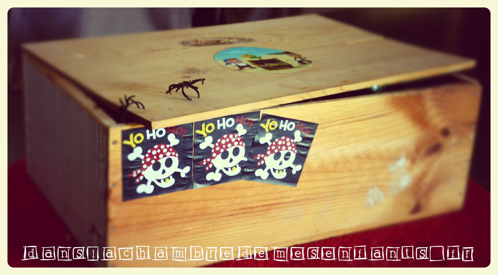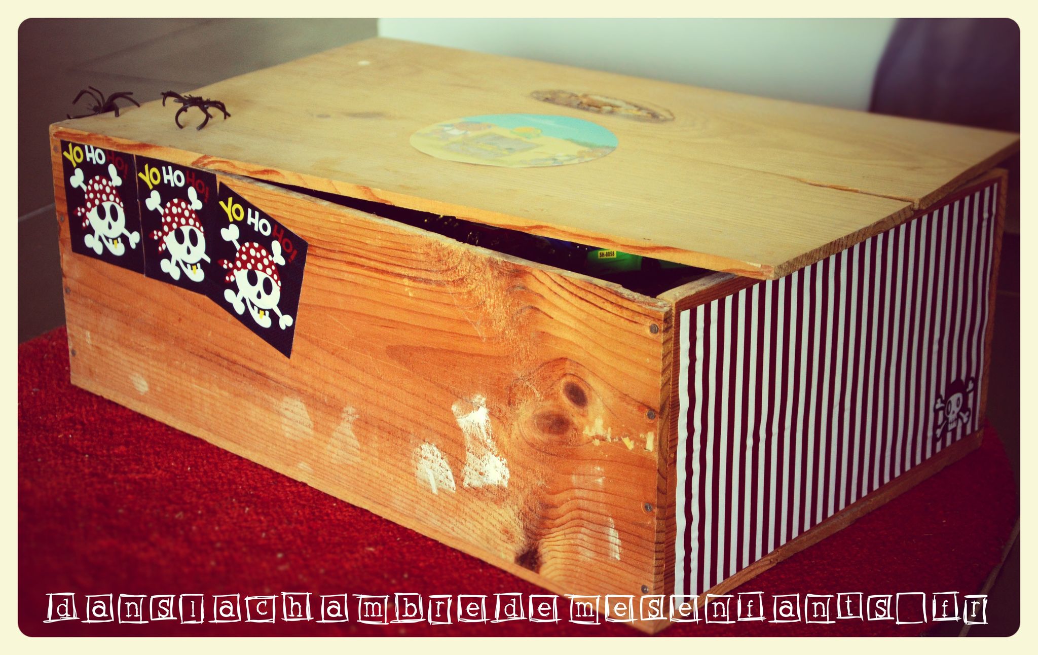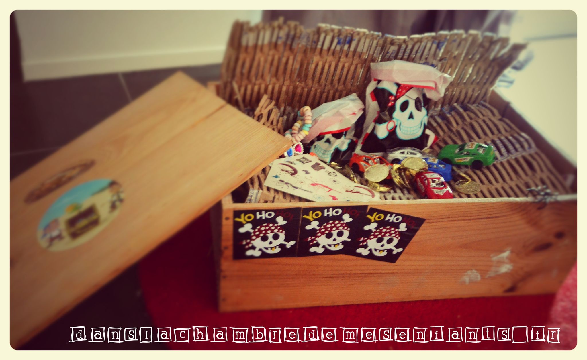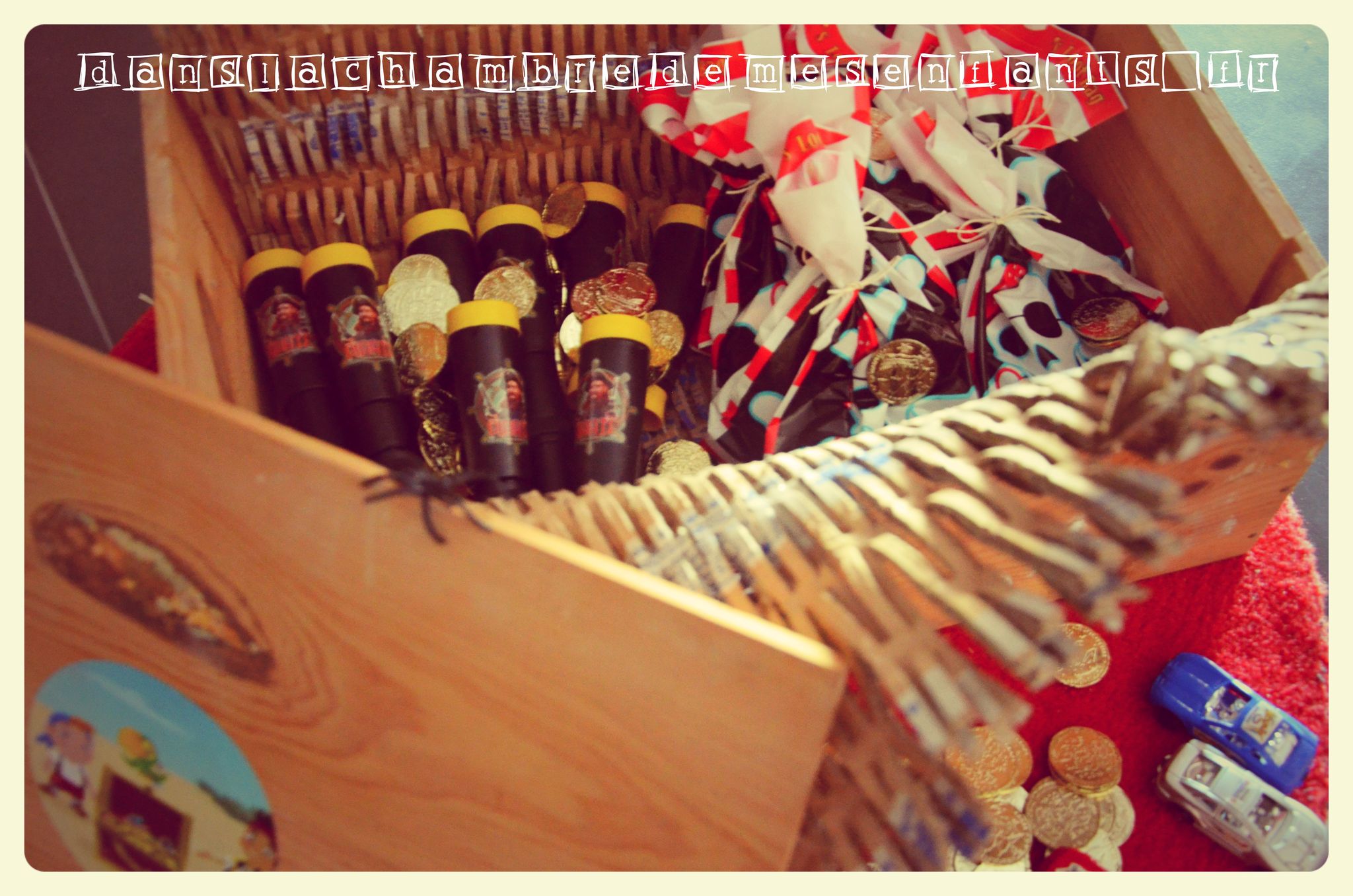 Le coffre au trésor a été improvisé à partir d’une caisse à vin (dont les vieilles étiquettes ont été masquées) : des jouets de kermesse et des sachets de bonbons pour chacun les attendaient !