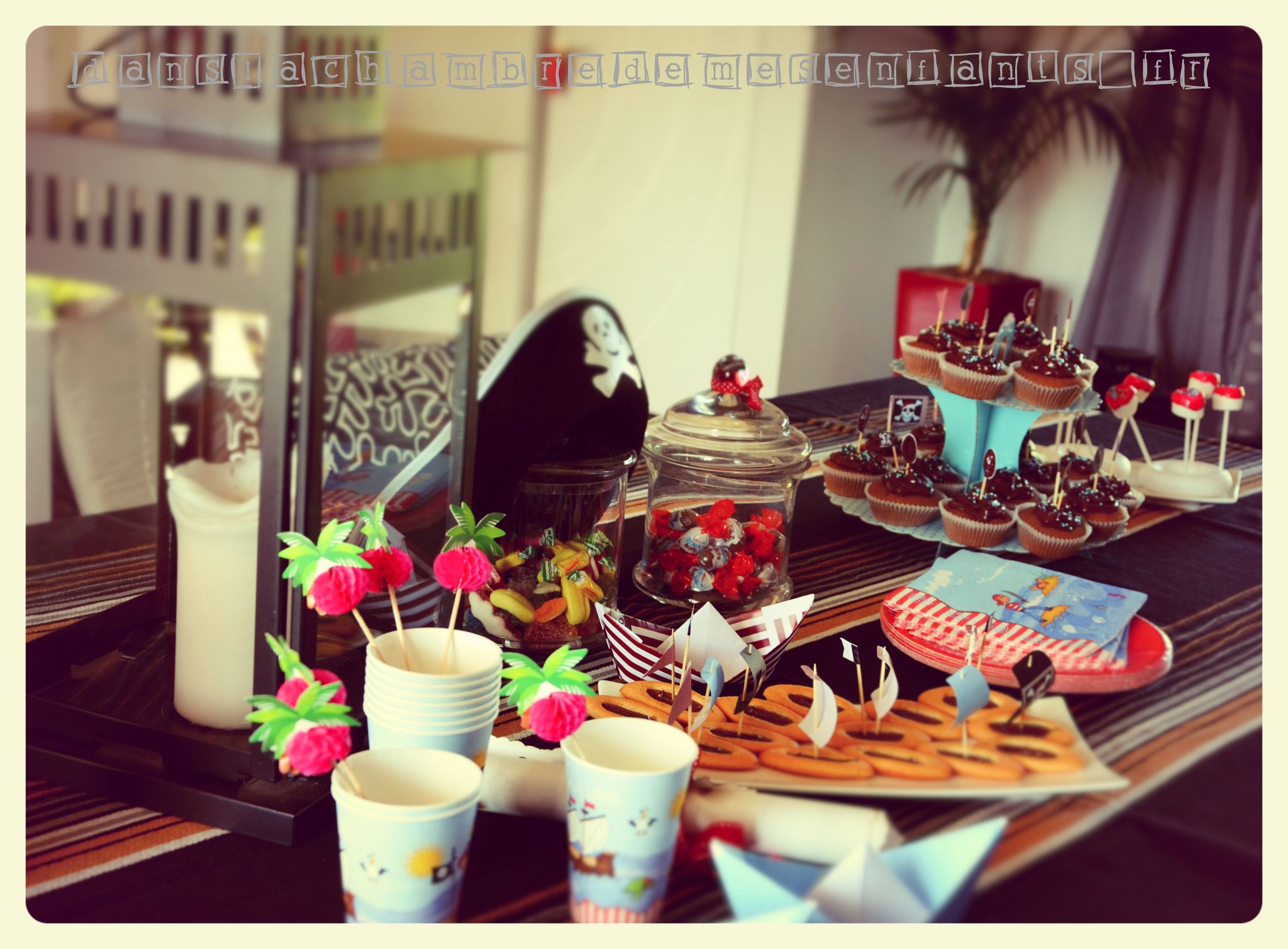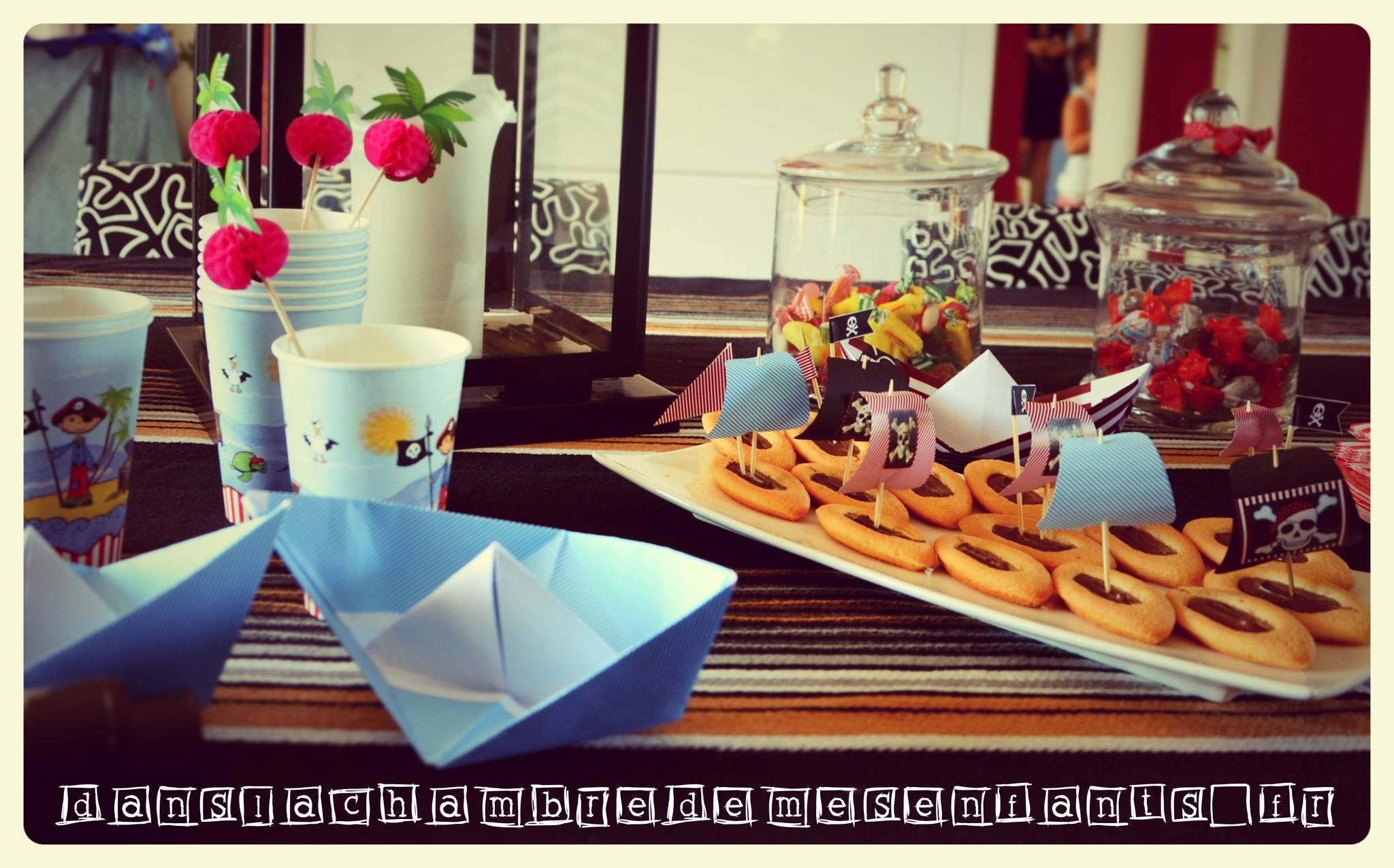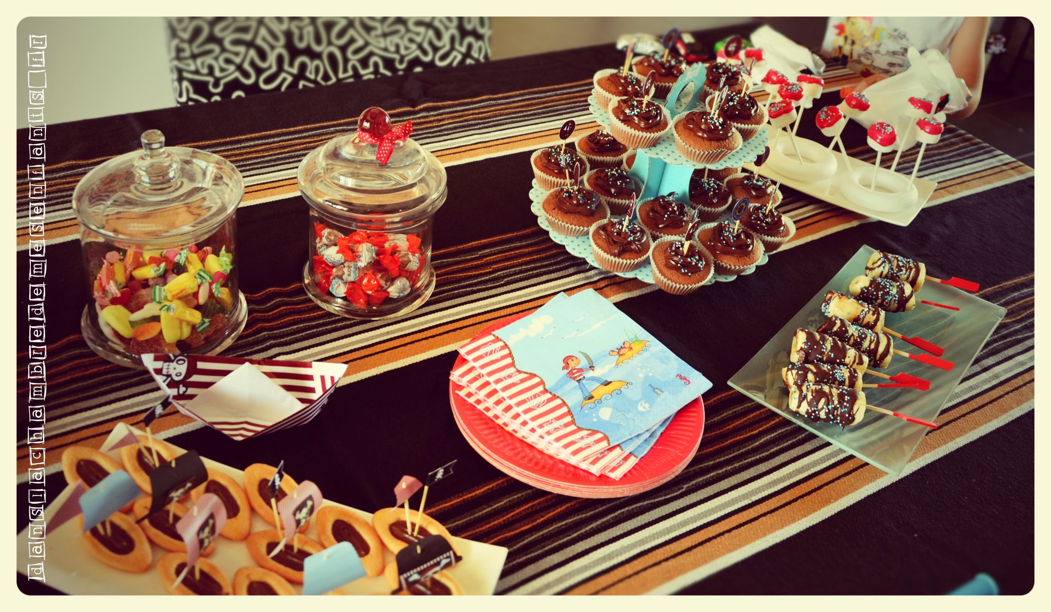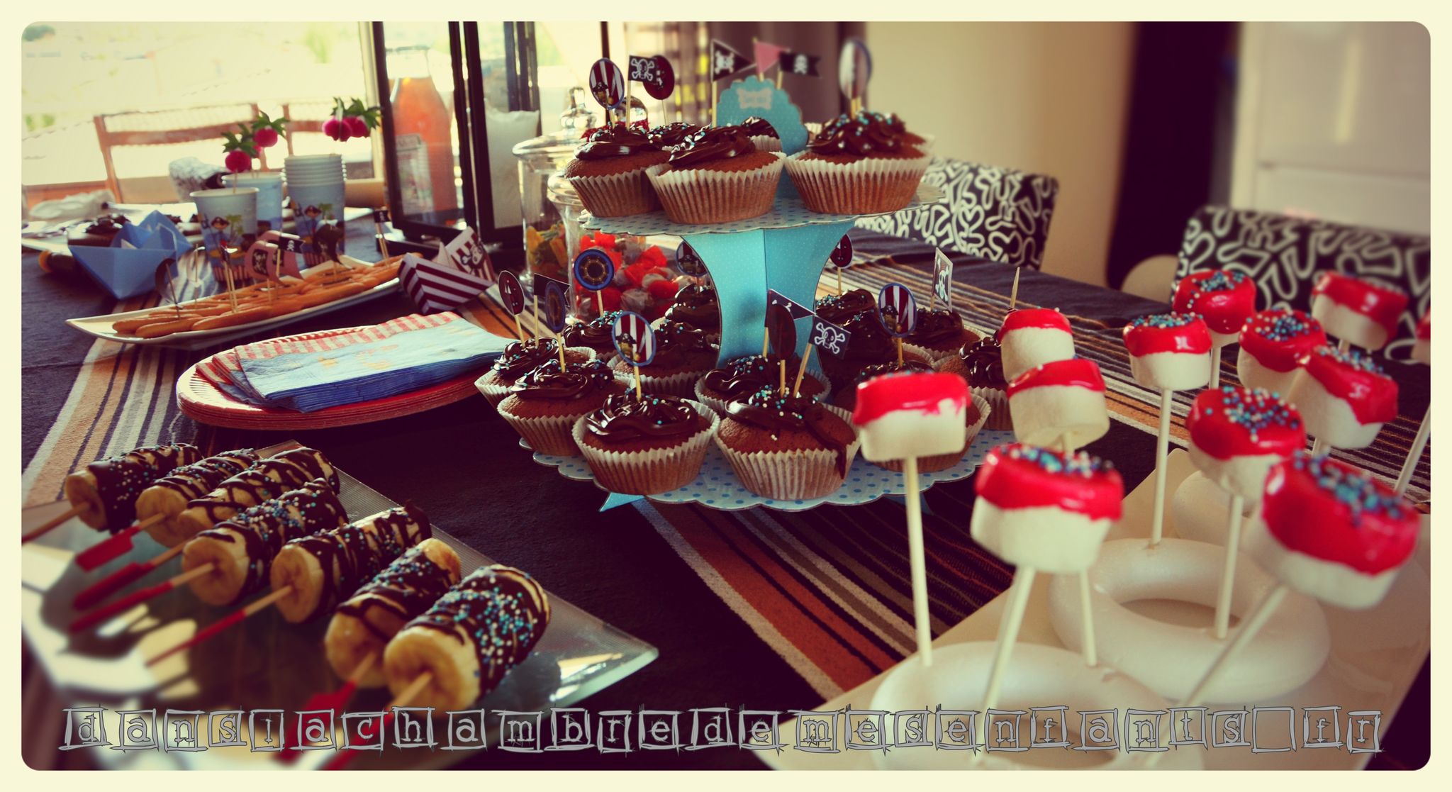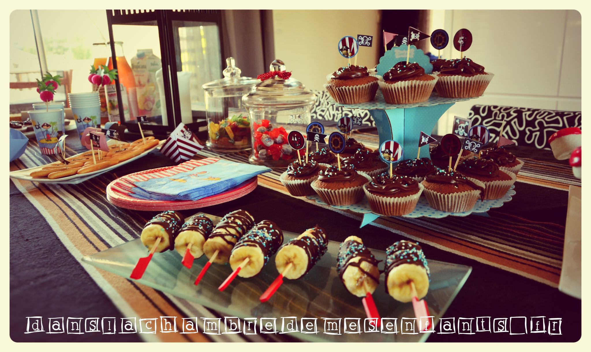 Les cup-cakes ont été décorés de la même façon que les gâteaux du goûter de classe (prévoyez du temps de découpage !). J’ai réalisé des bateaux en origami à partir de feuille à imprimé rayé et j’ai complété la table avec des décorations déjà prêtes (décoration pour gobelets, chapeau de pirate, lanterne et vaisselle jetable). Pour le côté ludique et tenter les enfants, j’ai décoré des biscuits « barquette », disposé des bonbonnières, préparé des sucettes en marshmallows décorés de sucre et des bananes trempées dans du chocolat fondu (à faire sécher avant de les présenter) et des billes de sucre (j’ai oublié de disposer les singes qui vont avec… dommage).