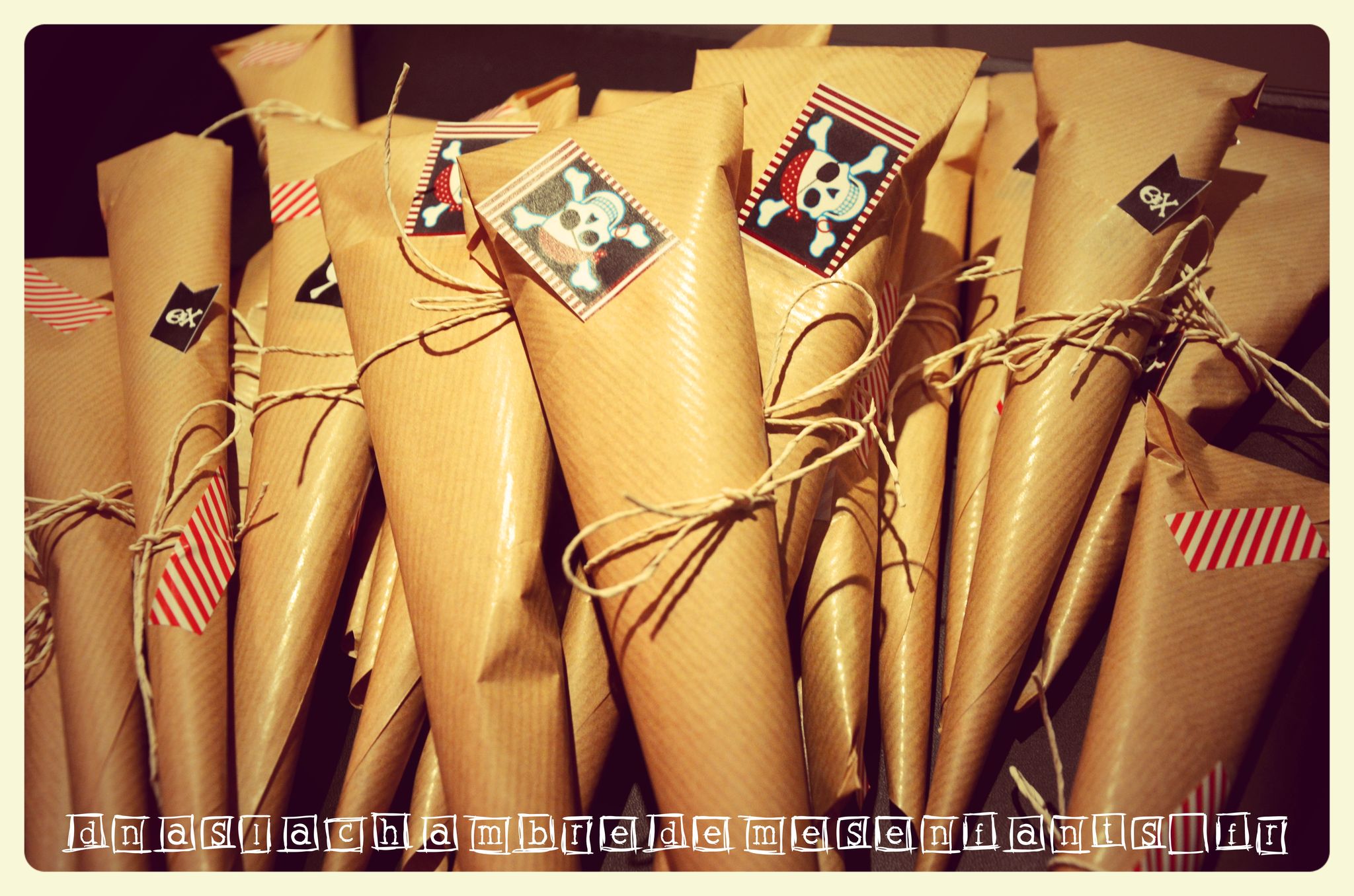 Pas de grandes recettes, non, faisons simple : j’ai doublé la recette du gâteau aux yaourts dont la pâte à été répartie dans des ramequins. Une fois refroidis, les petits gâteaux ont été saupoudrés de sucre glace puis décorés en mode DIY*. Pour cela, j’ai utilisé des modèles en ligne de forme ronde pour permettre de faire des déco double face en collant ensemble deux médaillons, avec un cure-dent entre les deux feuilles (complétés, parfois, par des drapeaux à tête de mort) . Pour les bonbons, j’ai utilisé du papier kraft, roulé en cônes puis décorés avec les chutes (les déco de 1 et 2 et 3 doudous et du fil). Pour les fermer, j’ai utilisé du masking tape rayé en rouge et blanc (ce sont les détails qui font la différence).
