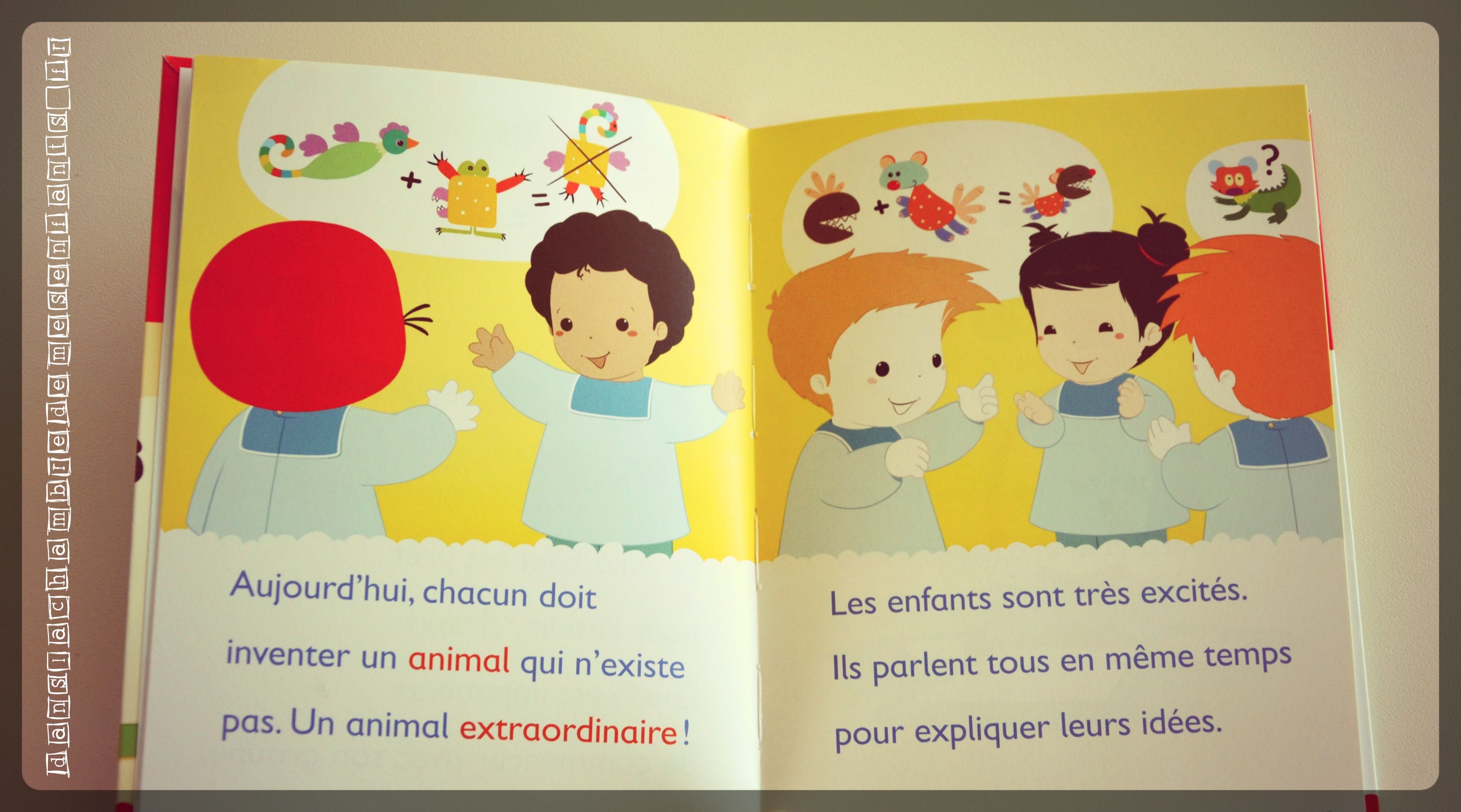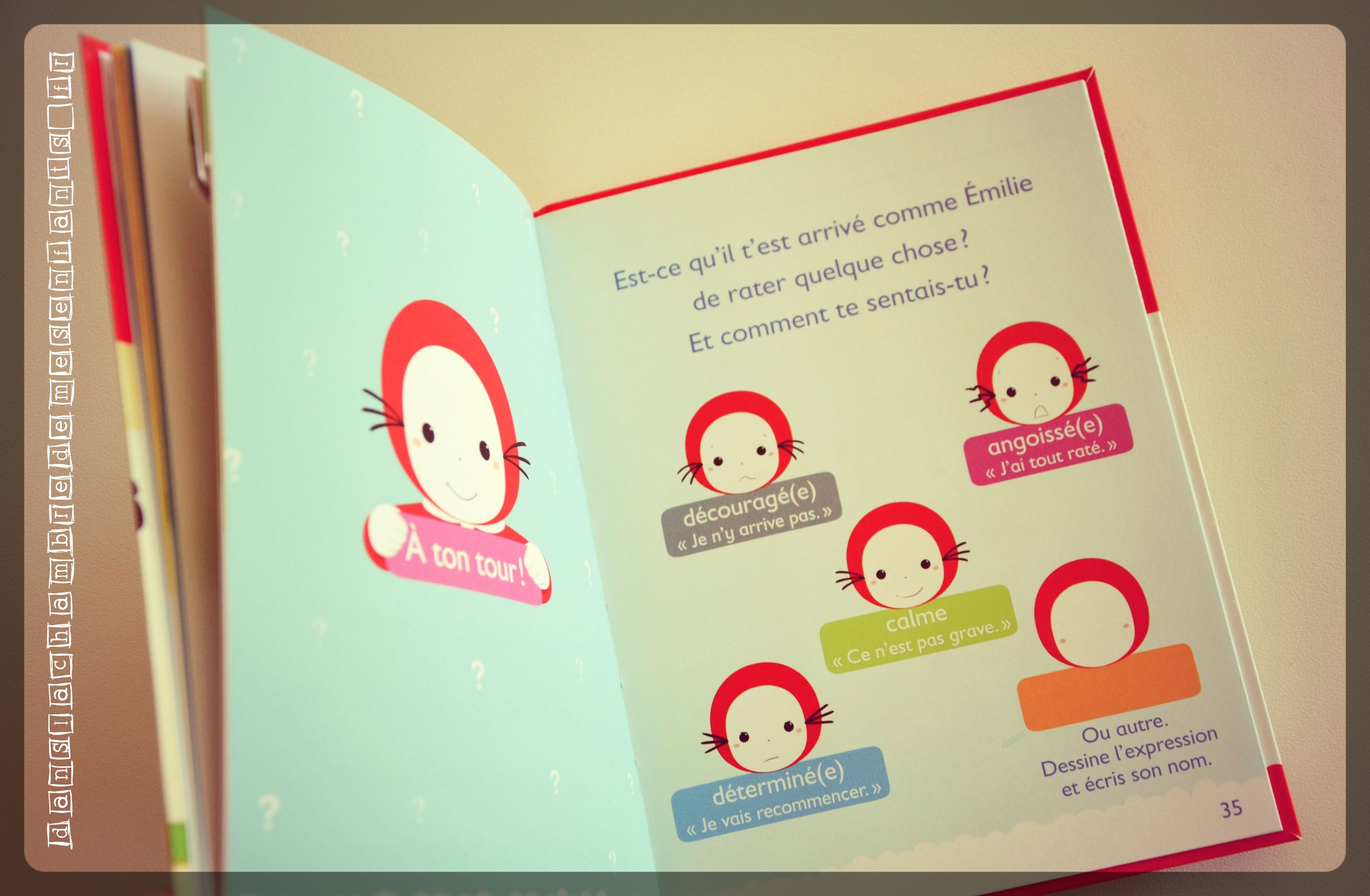 Côté histoire, Emilie fait partie d’élèves qui sont mécontents de leurs dessins. La maîtresse propose que ceux qui le souhaitent collent une partie de leur animal imaginaire sur une feuille commune. Ils finiront par vouloir poursuivre l’œuvre de l’institutrice ensemble car la participation au groupe prendra le dessus sur l’appréciation personnelle. Lorsque l’on est enfant, c’est l’épreuve de l’apprentissage qui se mêle à l’expression et cela peut facilement donner lieu à un débordement d’émotions. A cet égard, le jeune lecteur est invité, en fin d’ouvrage, à exprimer ce qu’il a ressenti lors d’une même expérience, sa façon d’apporter une solution et de se comporter.