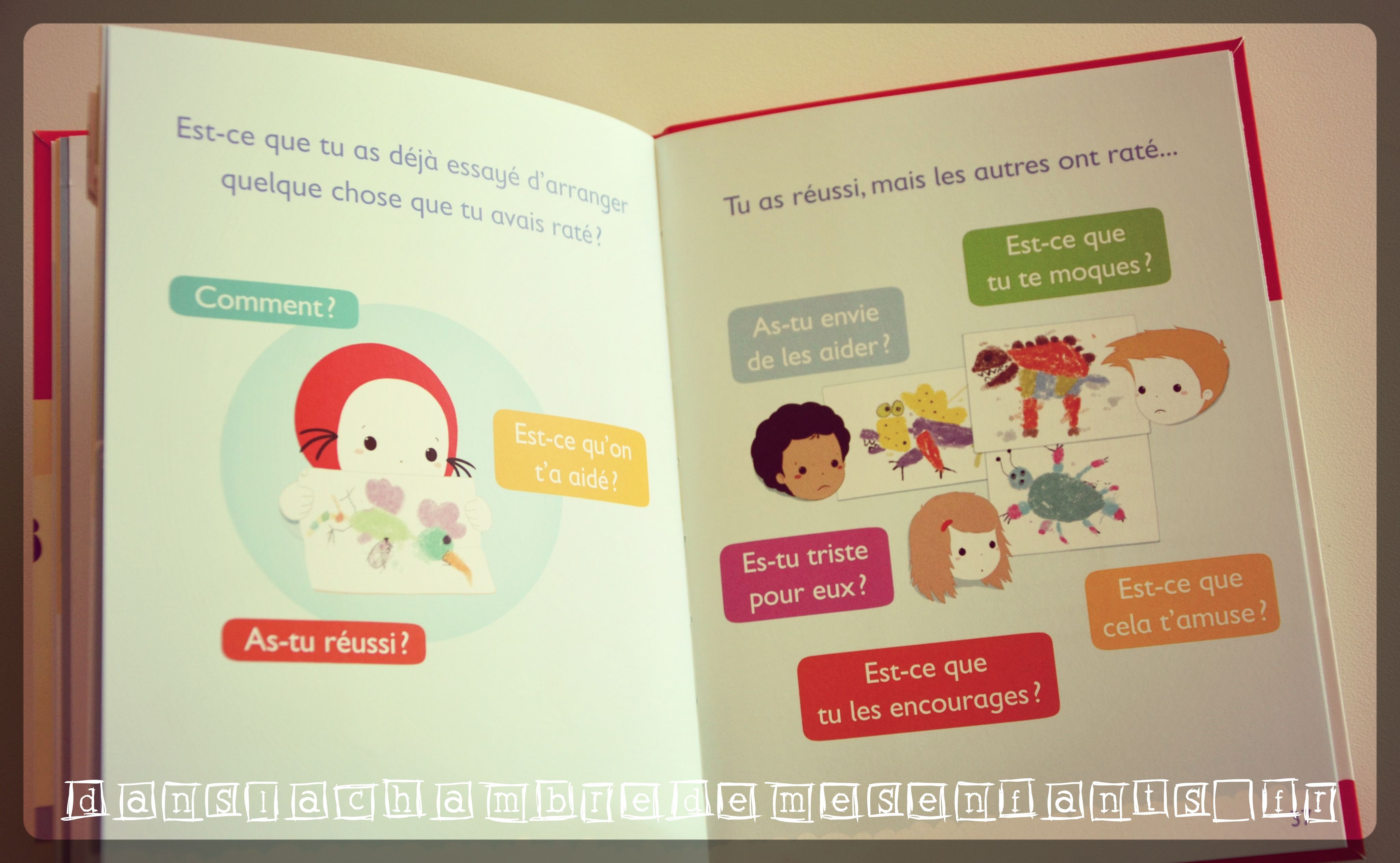L’avis des enfants : Alex, 6 ans, est au CP et lit en autonomie. Il a aussi eu l’expérience du dessin « tout raté », c’est pourquoi le sujet l’a intéressé. Le texte lui paru un peu long, même en plusieurs fois, alors j’ai poursuivi la lecteur en lui confiant celle des mots de couleurs différentes. La dernière partie permet de constater, avec son propre récit, que les réactions des enfants ne sont pas les mêmes. J’ai poursuivi en discutant avec lui des différences entre chacun, surtout en situation de groupe.