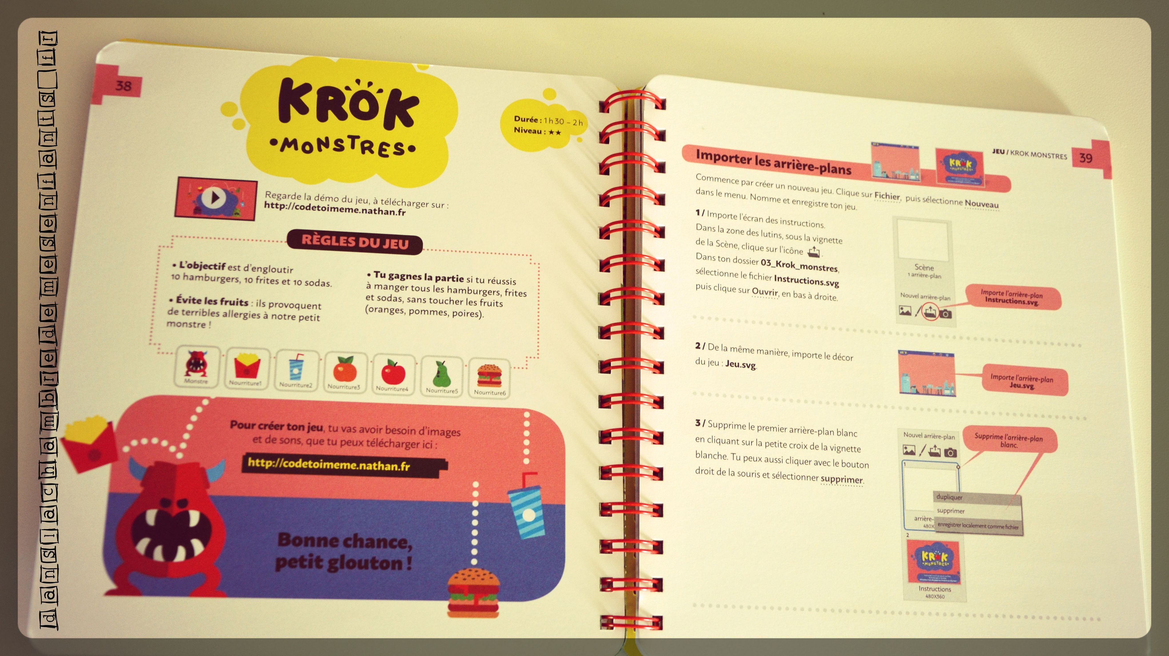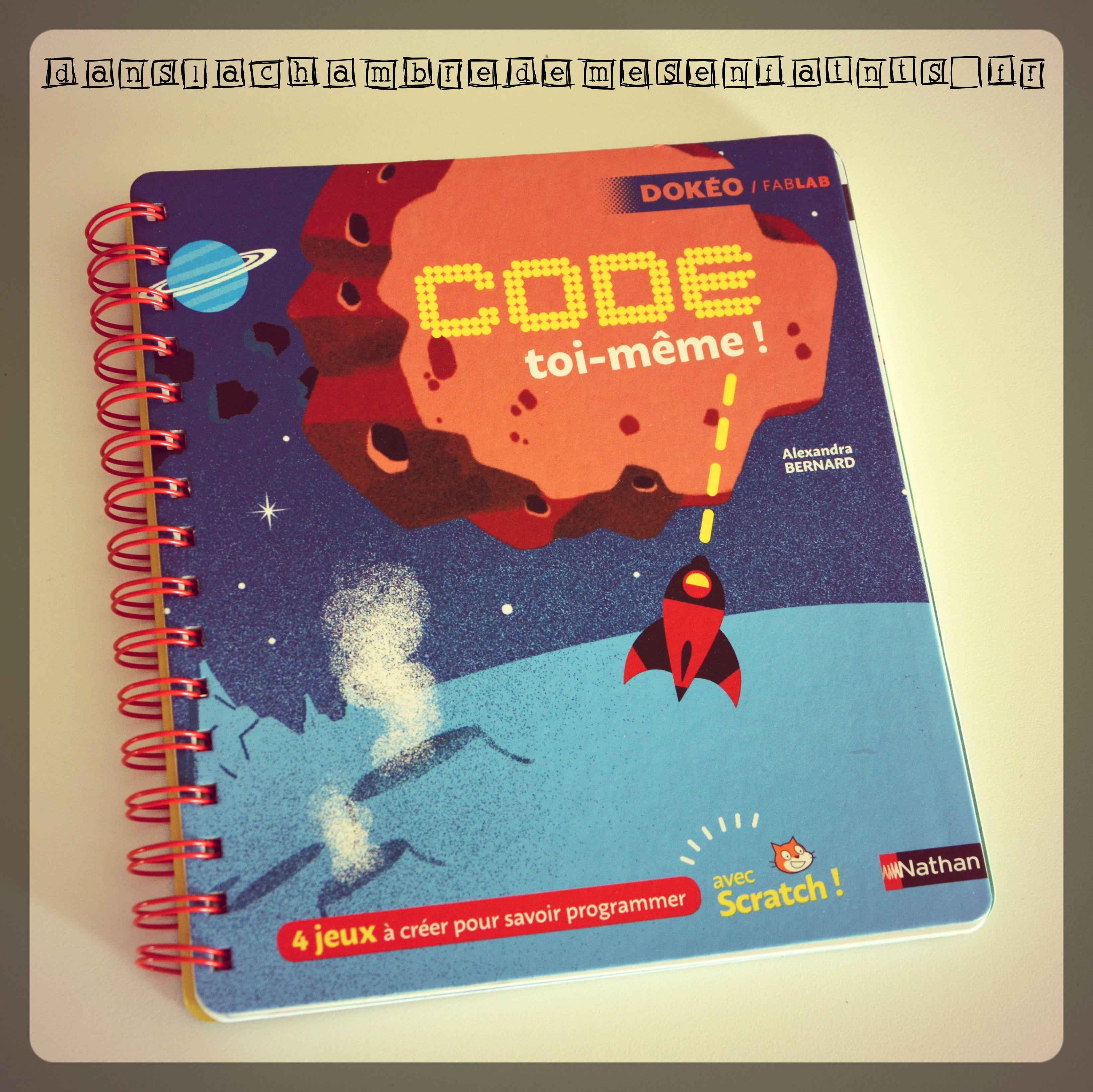 Il s’agit uniquement du code expliqué à la façon d’un manuel mais avec une mise en pratique à travers 4 jeux à créer. Tout commence ici où vous trouverez une démo et le logiciel à télécharger (gratuitement). Pas à pas l’enfant participera au codage des jeux « Le diamant maudit », « Krok monstres », « Basket Banzaï », ou encore « Mission ZX 80 » correspondant à 4 niveaux de réalisation (2h en moyenne par jeu).