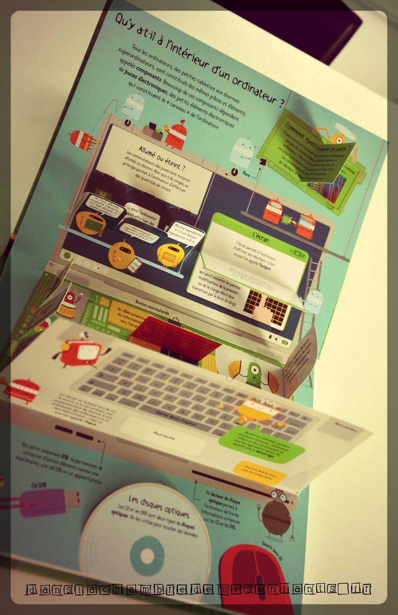 Ce sujet est pertinent, notamment avec l’omniprésence de l’informatique dans notre quotidien. Cet ouvrage reprend l’animation à volets multiples présents dans « Découvrons ensemble : fractions et nombres décimaux ». Les explications sont ainsi bien présentées, de façon imagées. L’animation rend la lecture dynamique et les illustrations modernes et colorées facilite l’approche.