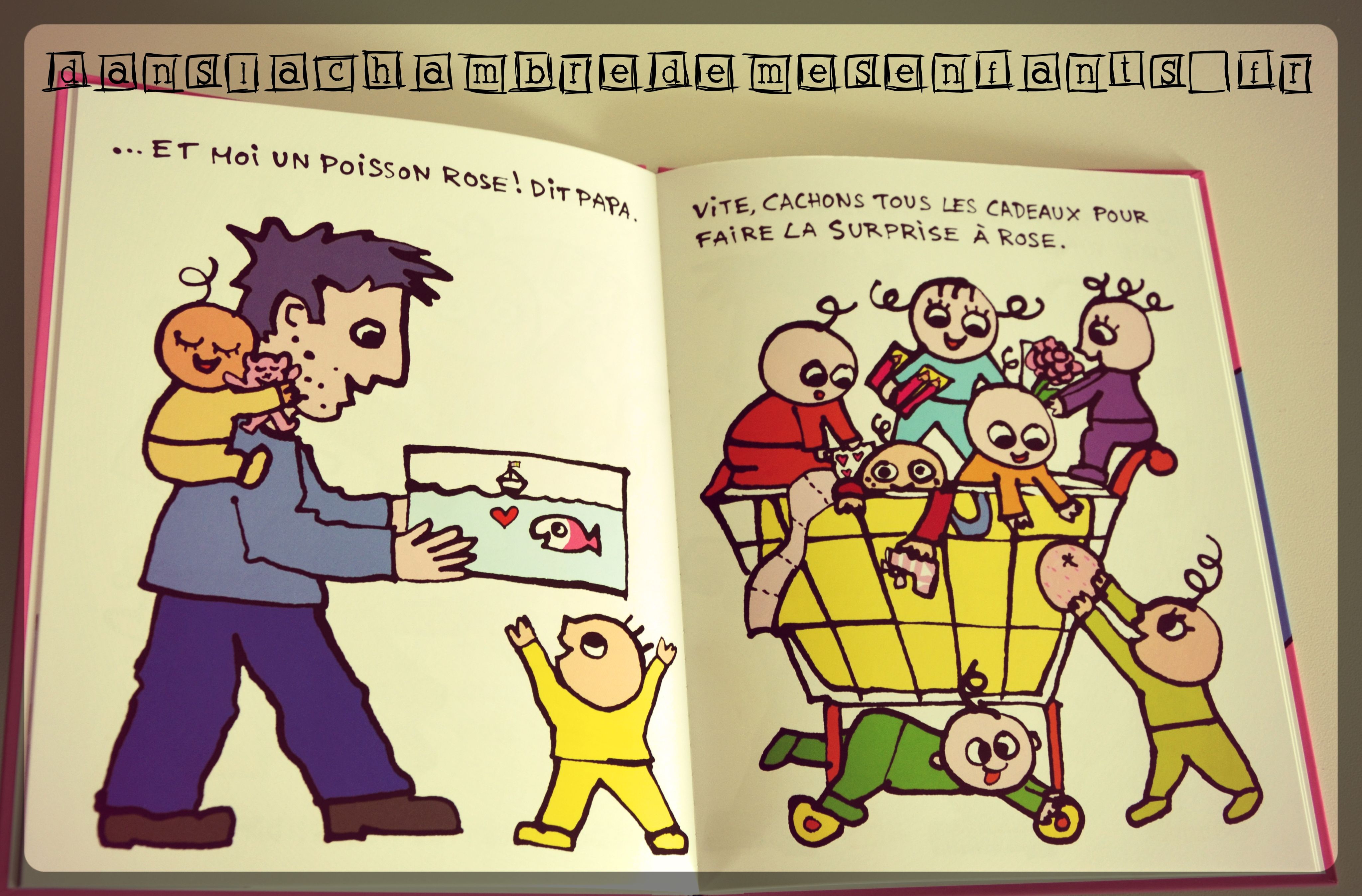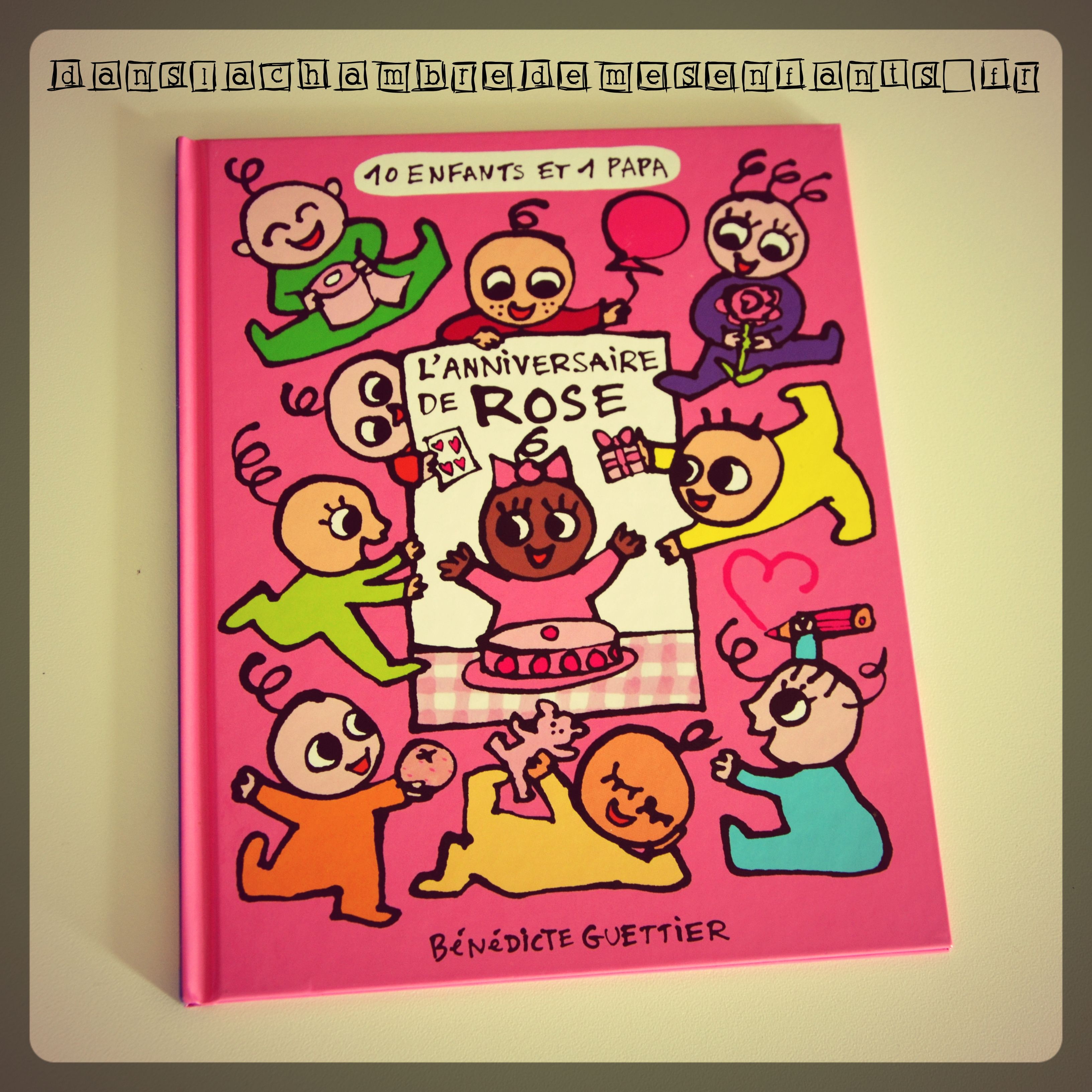 Voici l’aventure d’une famille composée d’un papa et de 10 enfants, dont chacun désigne une couleur et en porte le nom. Les dessins et l’histoire sont simples, orientés autour de l’aventure de l’un des enfants, ici, l’anniversaire de Rose.