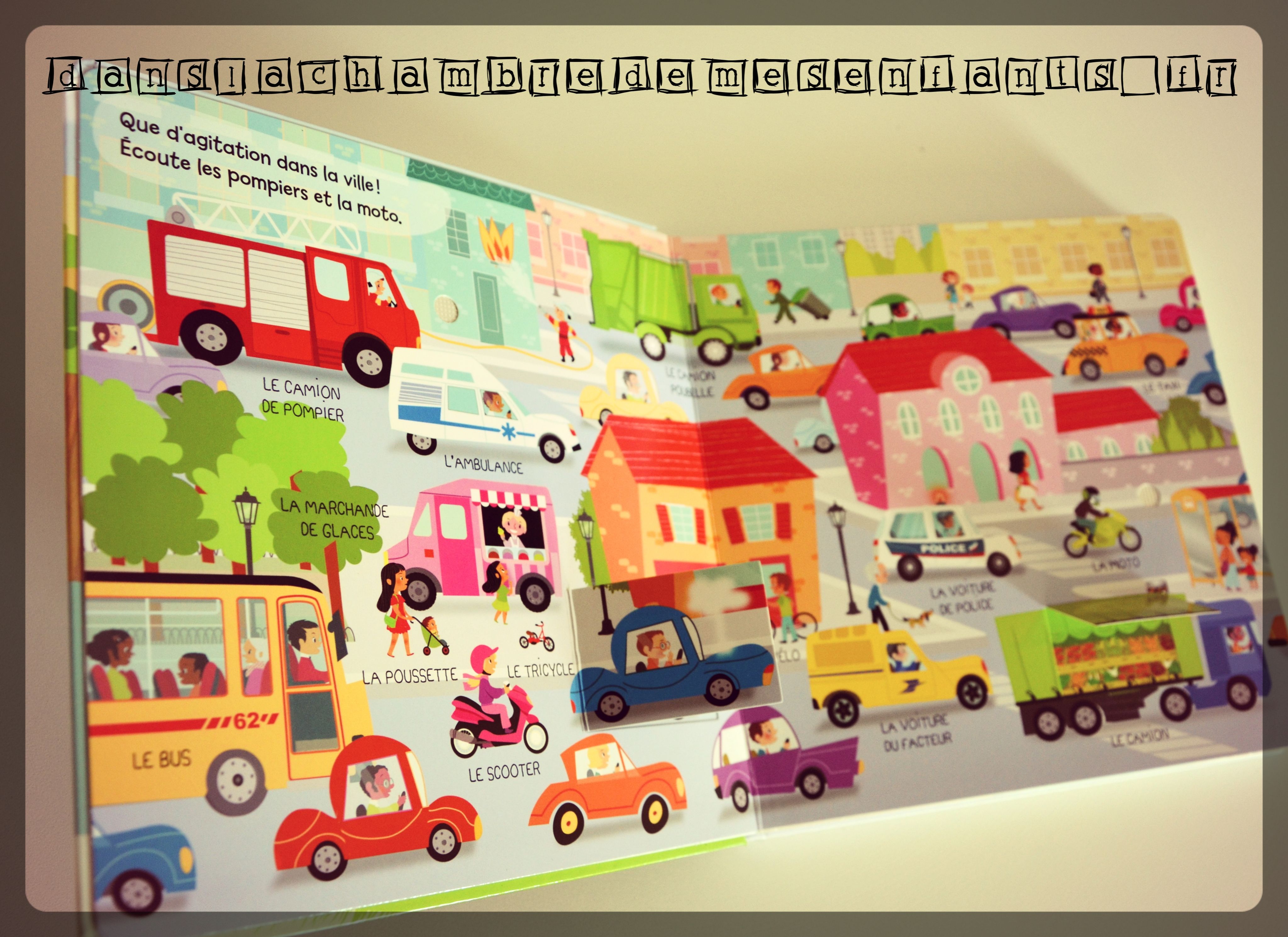 Ce documentaire pertinent s’adresse aux plus jeunes, à partir de 2 ans, de façon animée à l’aide de puces sonores et de rabats. Plusieurs tableaux (ville, port, ferme, aéroport…) mettent en scènes des véhicules, sous légende. Les illustrations, rondes et agréables, ont la première place.