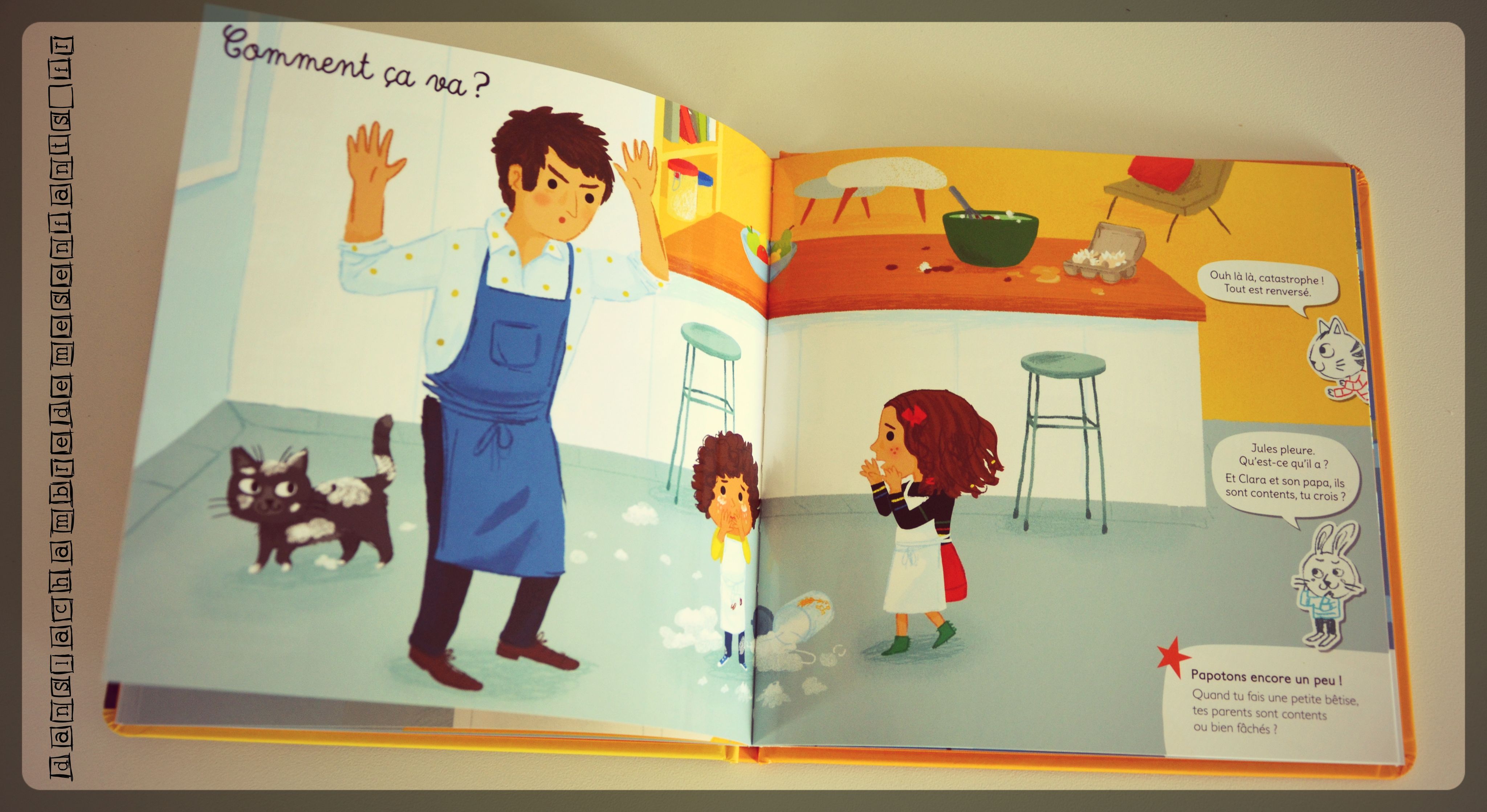 - Clara et Jules cuisinent avec leur père mais le pot de farine tombe par terre et se casse. Tout sera rangé et le gâteau d’anniversaire sera prêt pour le retour de leur mère ;
