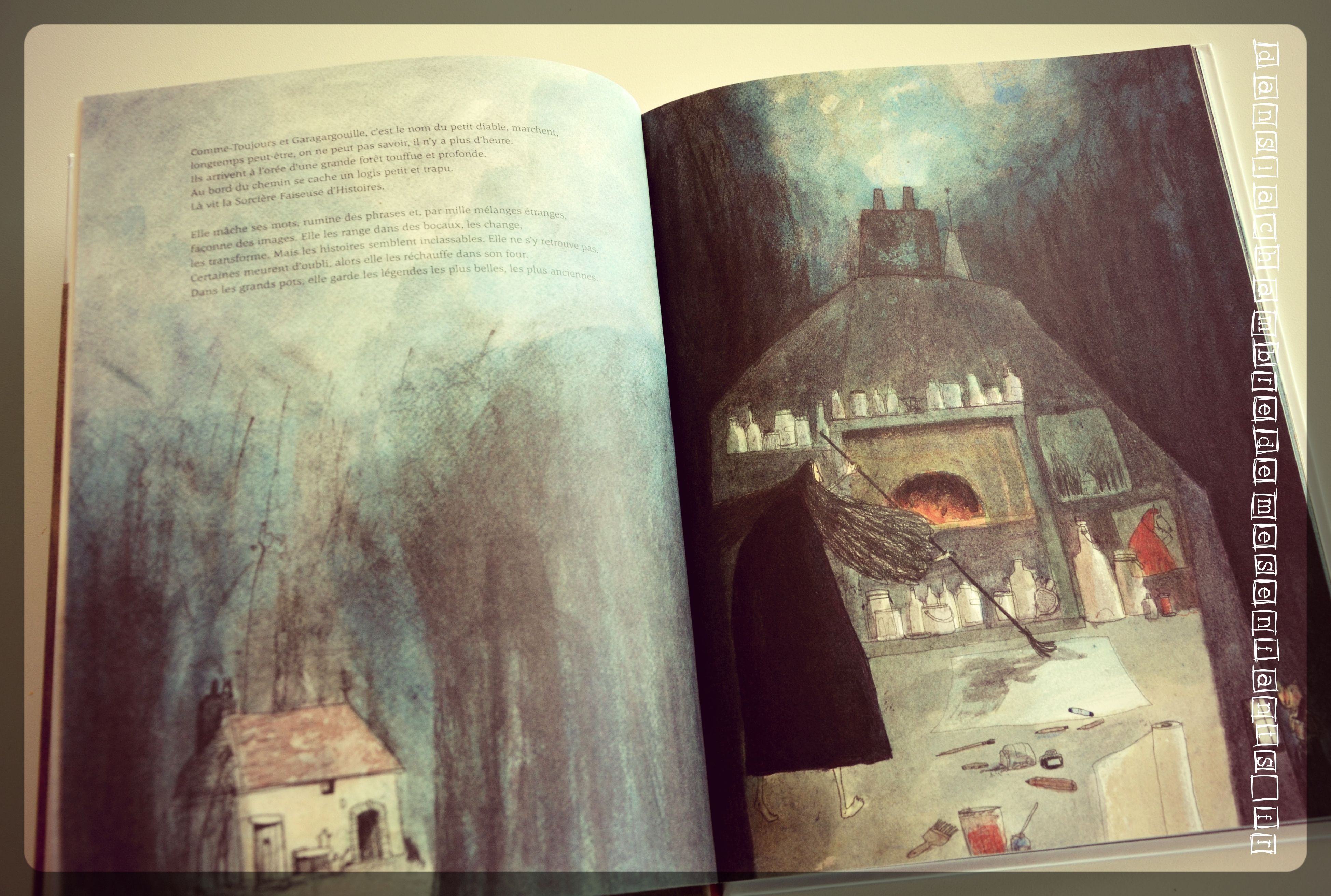 Un conte pour enfants, celui de Monsieur Comme-Toujours qui se décide à bousculer sa petite maison en ne poursuivant pas sa journée comme à son habitude. De là, vient Garagargouille, un petit diable, qui l’emmène faire un tour et dérobe une bobine de fil à la sorcière, celui d’une histoire. Leur chemin se poursuit jusqu’à un arbre auquel sont suspendus 5 objets énigmatiques. Les univers sont changeants et forts en contraste. Vous aurez compris qu’il s’agit d’images sur la construction du soi, les métamorphoses de l’être (ou sinon je n’ai pas tout suivi !).