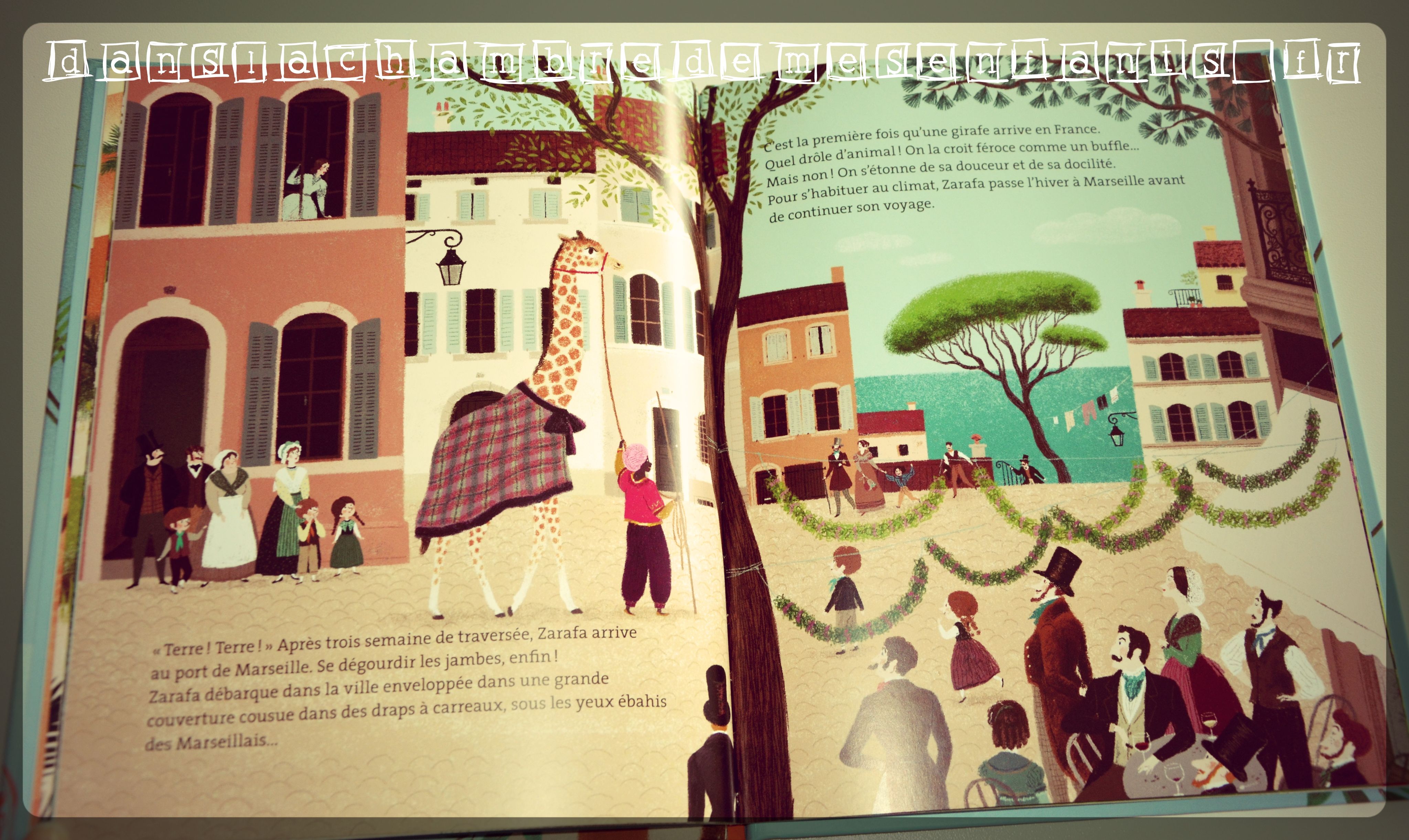 On découvre dans ce titre l’aventure réelle et étonnante de la girafe Zarafa qui a fait un long voyage depuis l’Afrique pour rejoindre la France, où elle a été offerte au roi Charles X. Le livre se termine par une petite explication (« D’où venait Zarafa ? » « Est-elle restée longtemps à Paris ? » […] sa renommée).