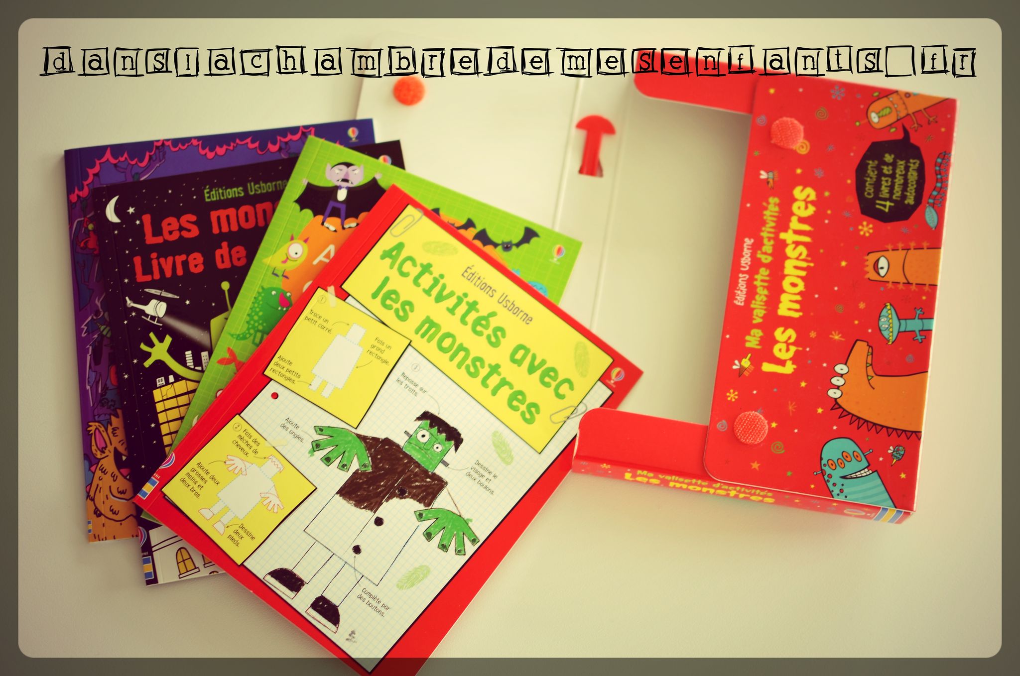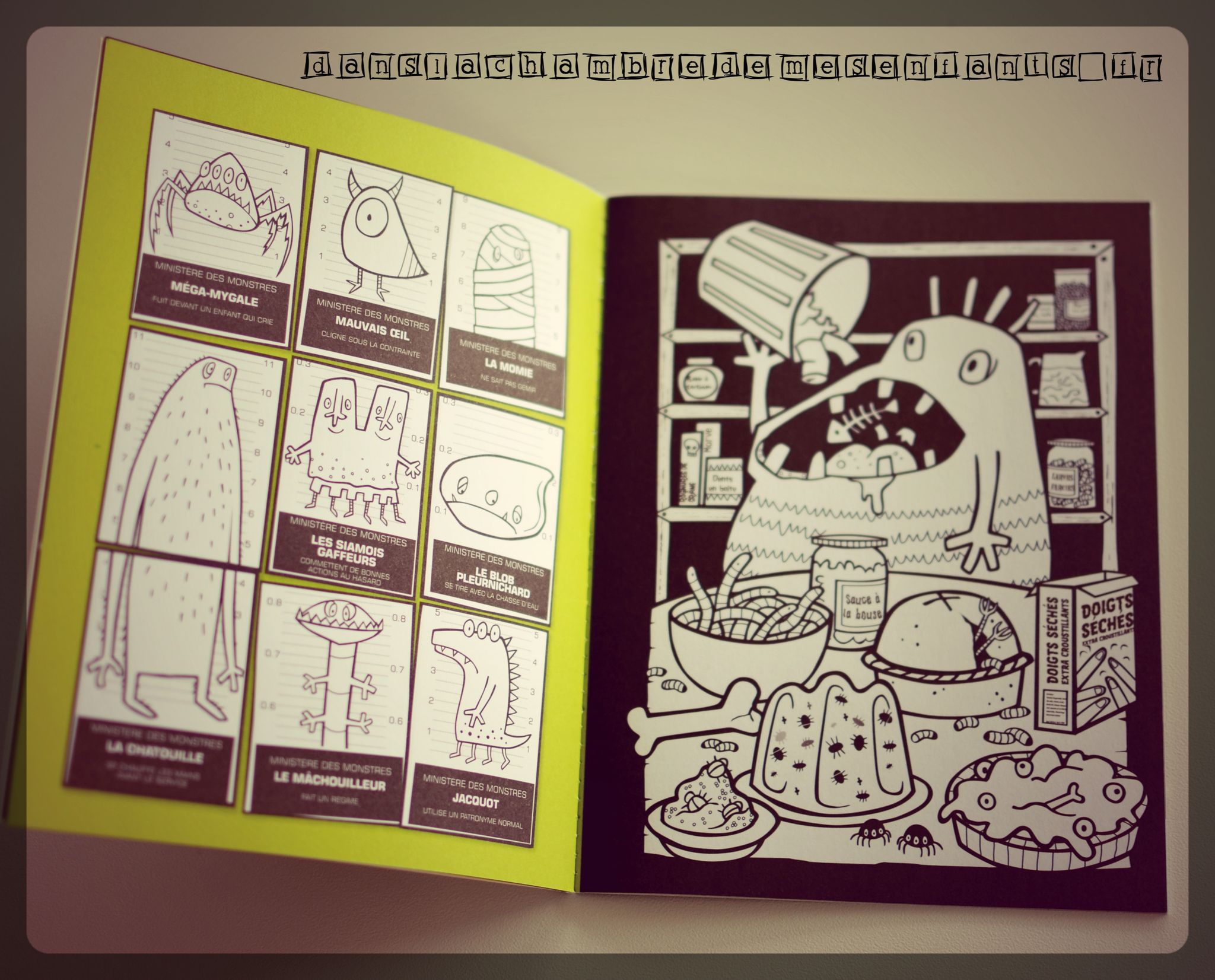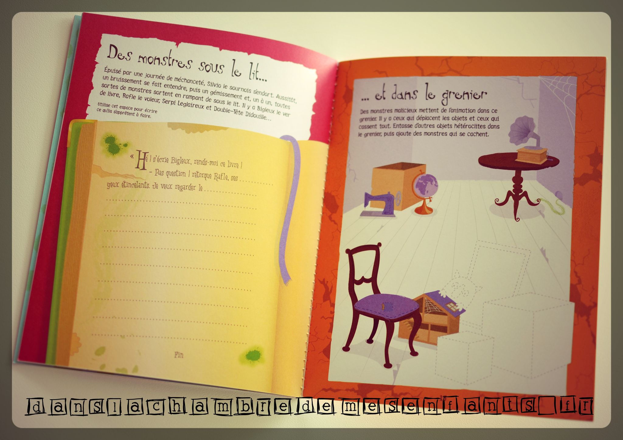 - « Activités avec les monstres » : un cahier propose des ateliers divers tels que le dessin par étape, selon des pointillés ou en complétant des tableaux, des labyrinthes, l’écriture d’une histoire entamée…