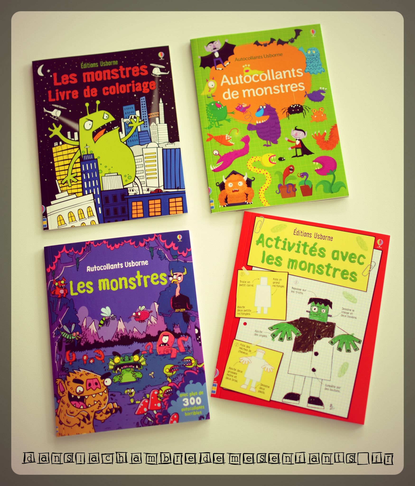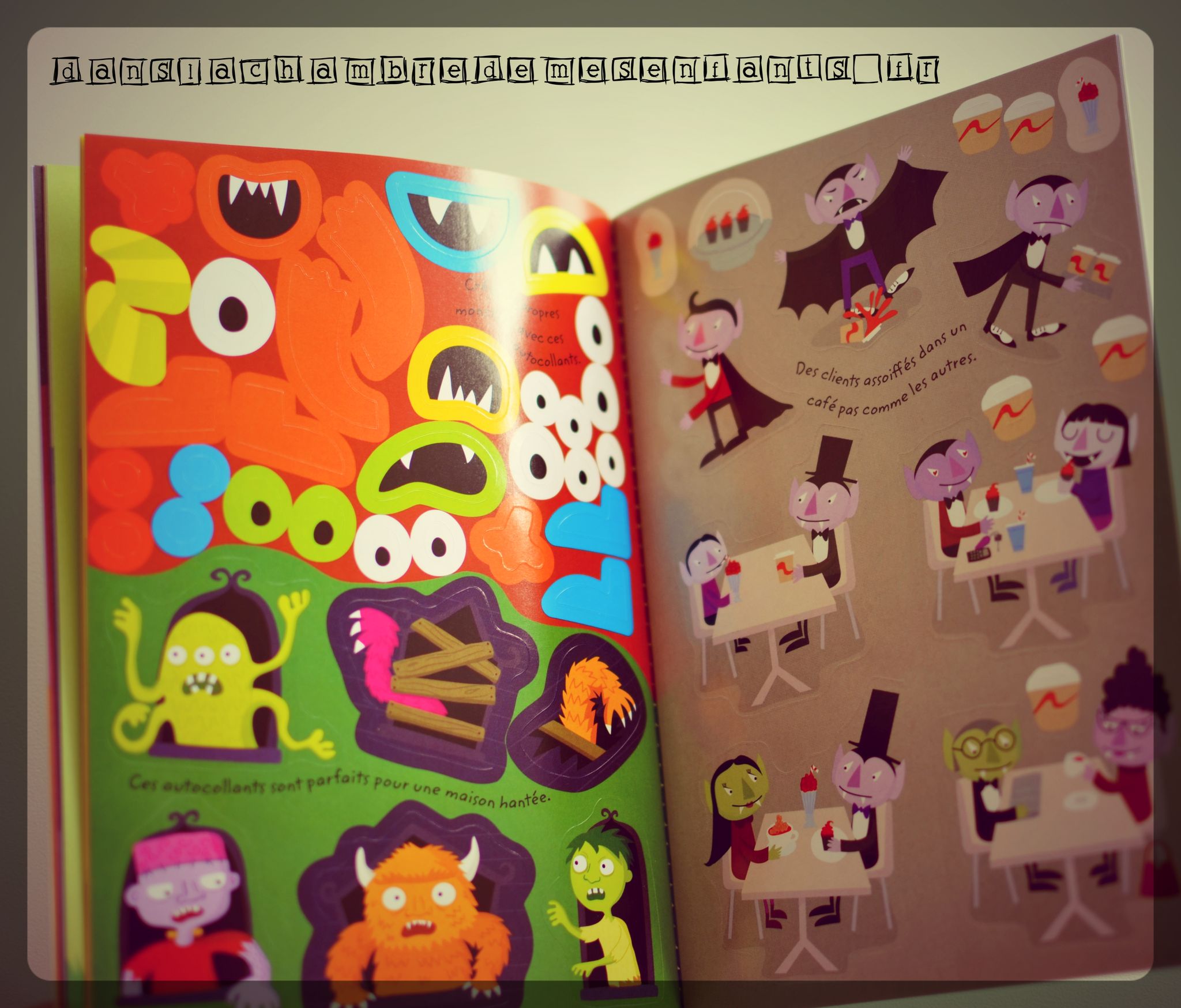 - « Autocollants de monstres » : des scènes (ex : maison hantée, animalerie pour monstres) très colorées sont à compléter avec 130 autocollants (ex : chauves-souris, monstres poilus) ;