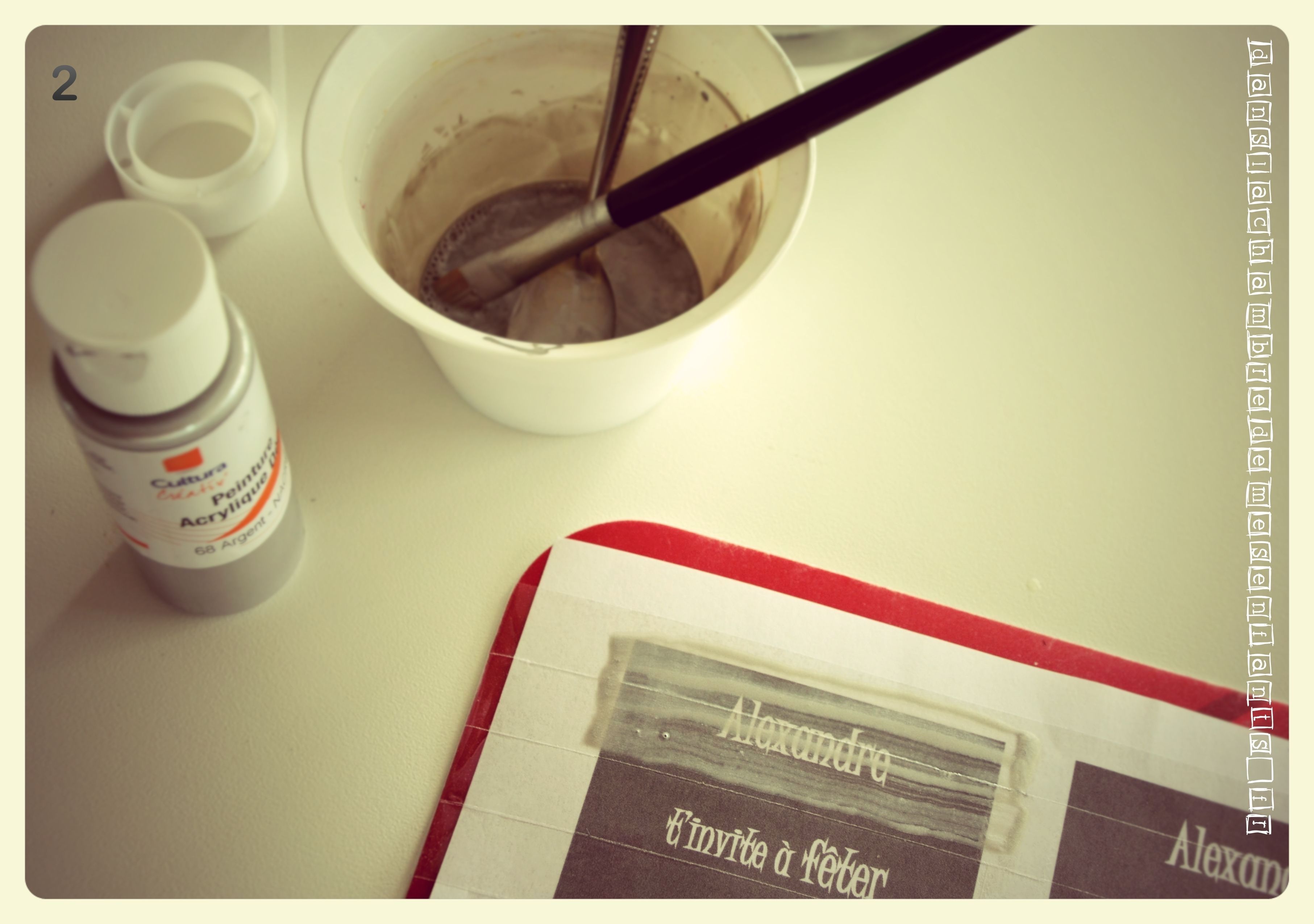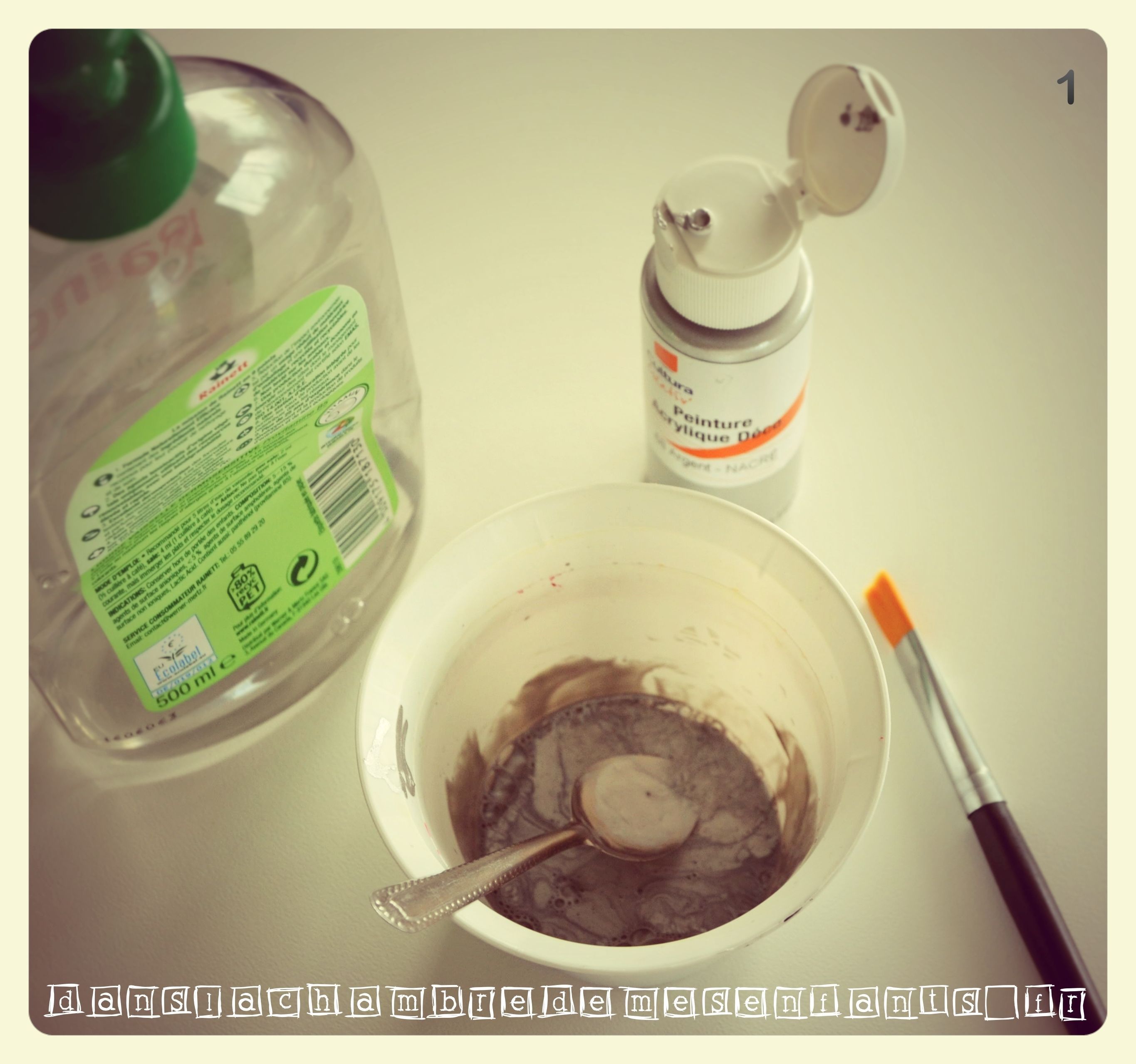 1 – Préalablement, inscrivez le texte sur le support choisi. Mélangez la peinture et le liquide vaisselle : 2 doses de peinture (voire un peu plus) pour 1 dose de liquide vaisselle