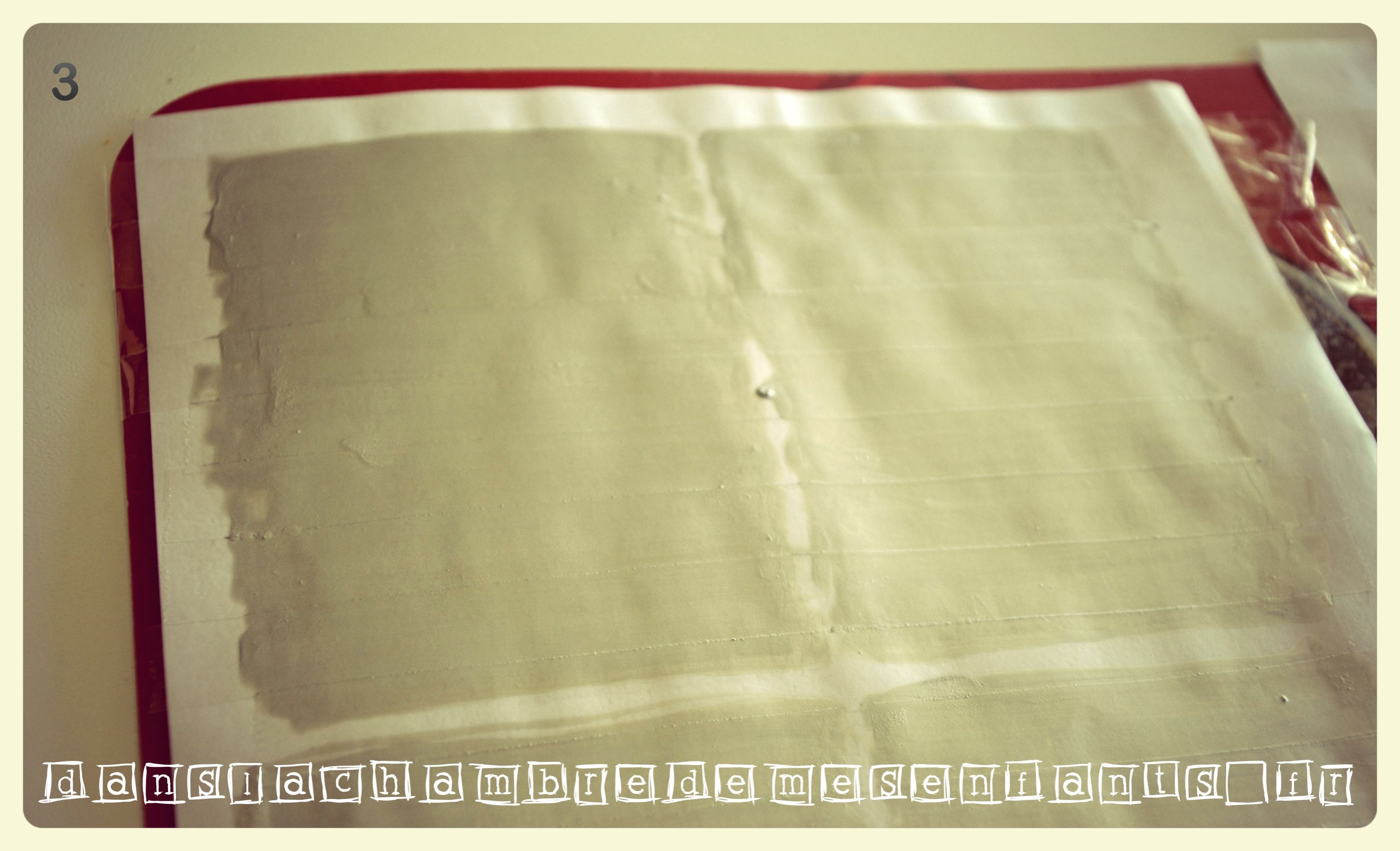 Systématiquement, je travaille sur un set de table plastifié que j’ai détourné comme support aux ateliers (cela supporte même les tracés de cutter). Pour faciliter cette étape, j’ai carrément scotché la page comportant le texte au set. Ainsi, j’ai pu travailler dessus et transporter pour le séchage la planche sans qu’elle ne bouge.
