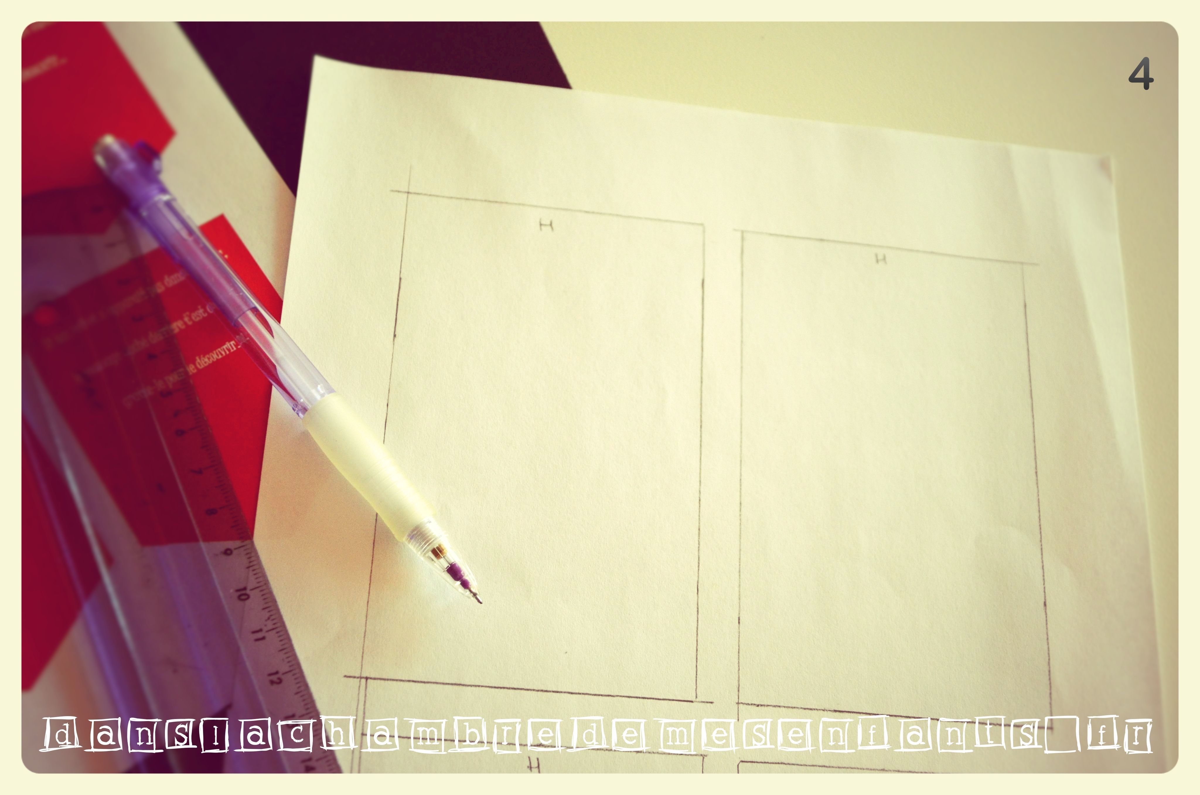 4 – S’il s’agit d’un texte imprimé, dessinez le contour des zones de texte au verso de la feuille et inscrivez (au crayon à papier, sans appuyer) un « H » dans la partie haute du texte (ou l’inscription que vous souhaitez pour signaler le haut du texte pour le coller dans le bon sens à l’étape 5).