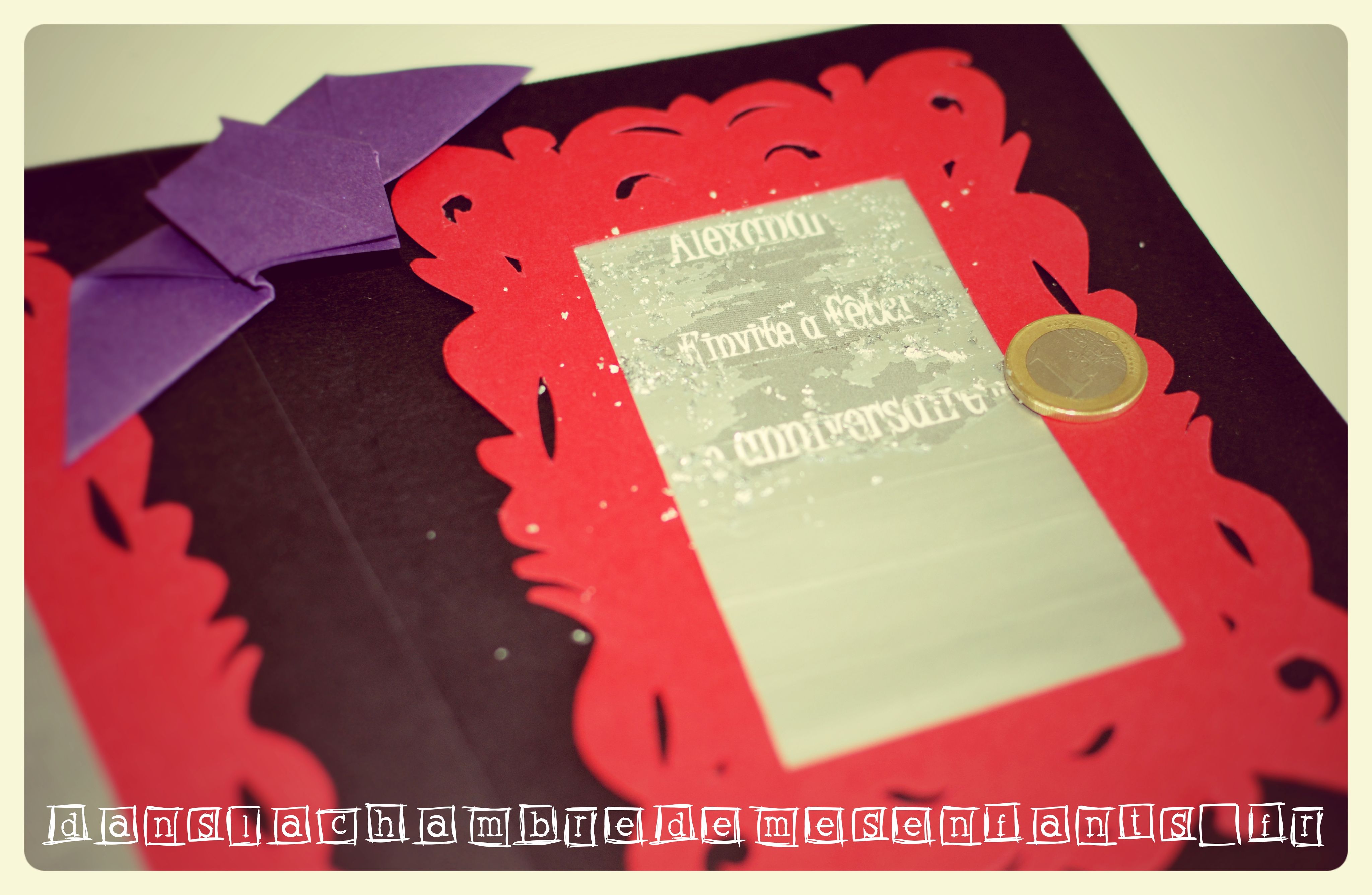 Conseil : Je ne vous cache pas que le visuel est bien différent de celui que j’avais prévu (notamment l’inscription du 1er volet) mais j’ai eu quelques soucis techniques de dernière minute (ça ne serait pas amusant sinon) donc j’ai fait des modifications. L’inscription « Invitation » devrait ressortir davantage avec un feutre argenté plus chargé en encre (si le vôtre n’est pas aussi fainéant que le mien) et la police plus marquée dans le thème (sans faire trop gothique pour que les enfants s’amusent à lire) ne serait-ce qu’en ajoutant des « pics » par endroits en surépaisseur.