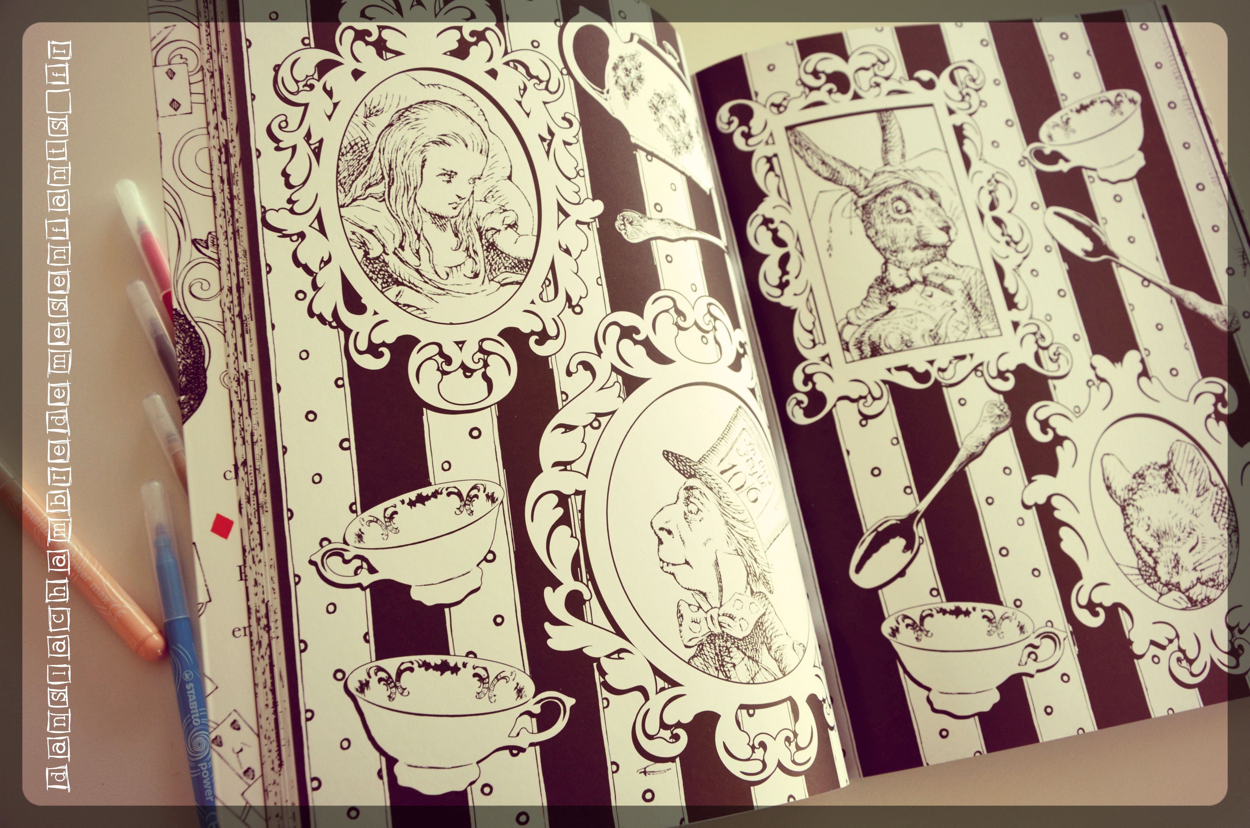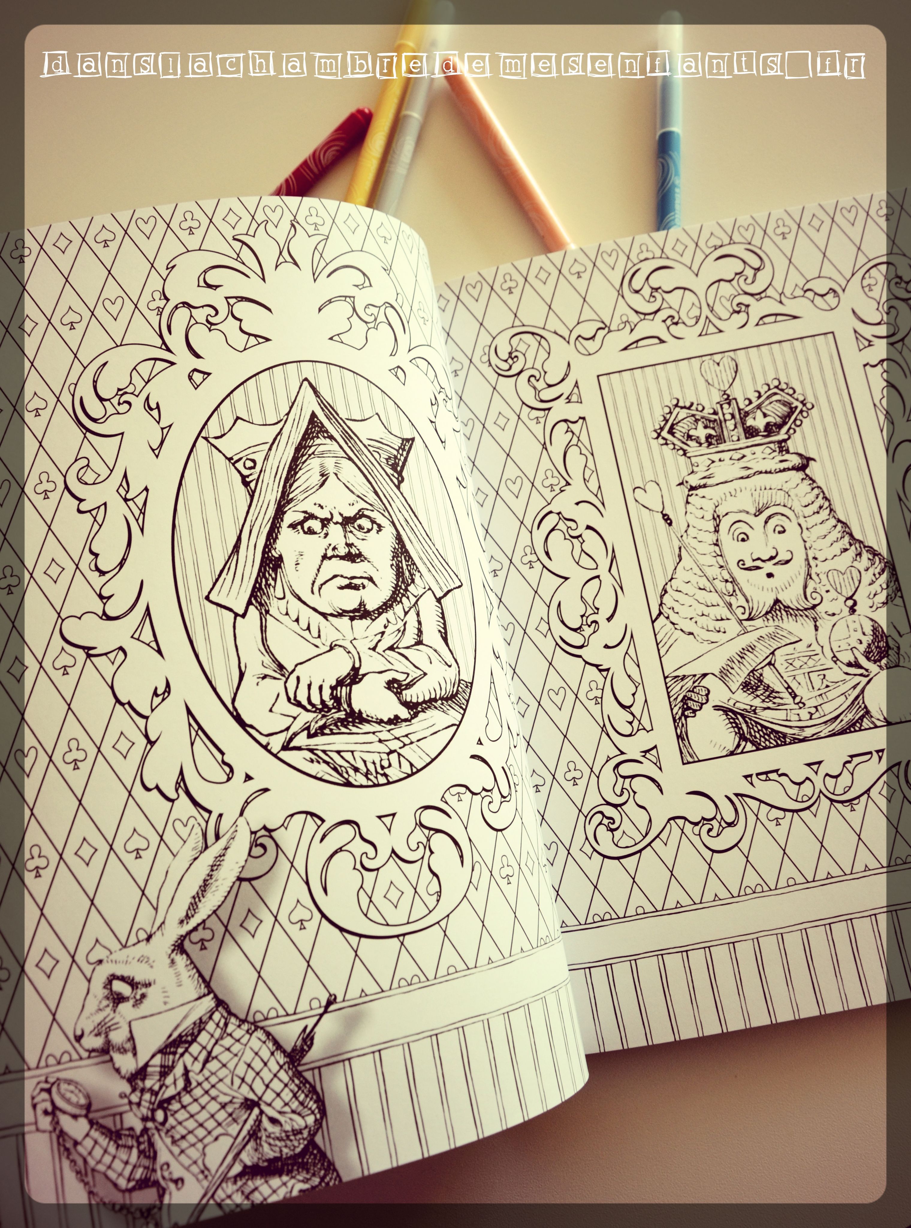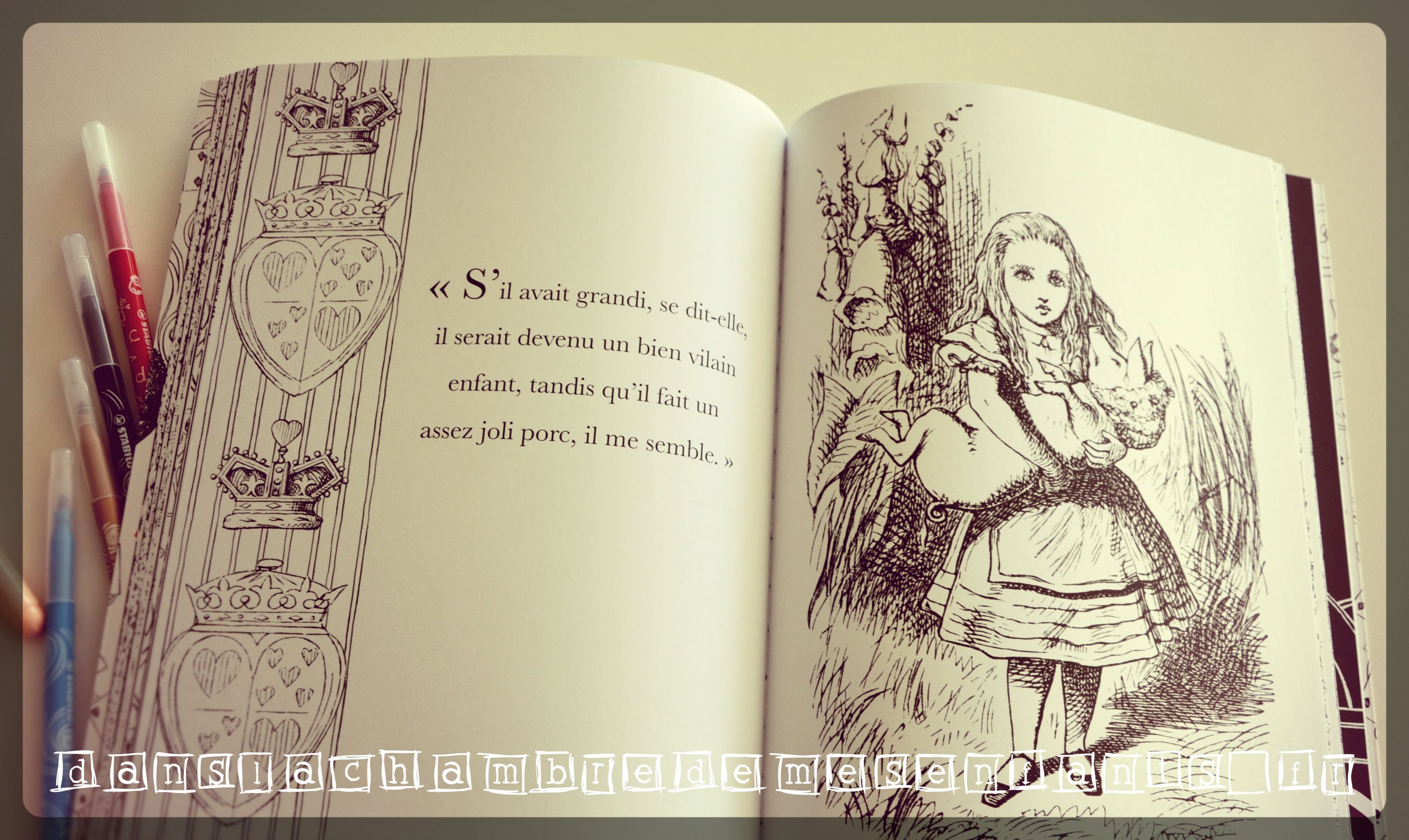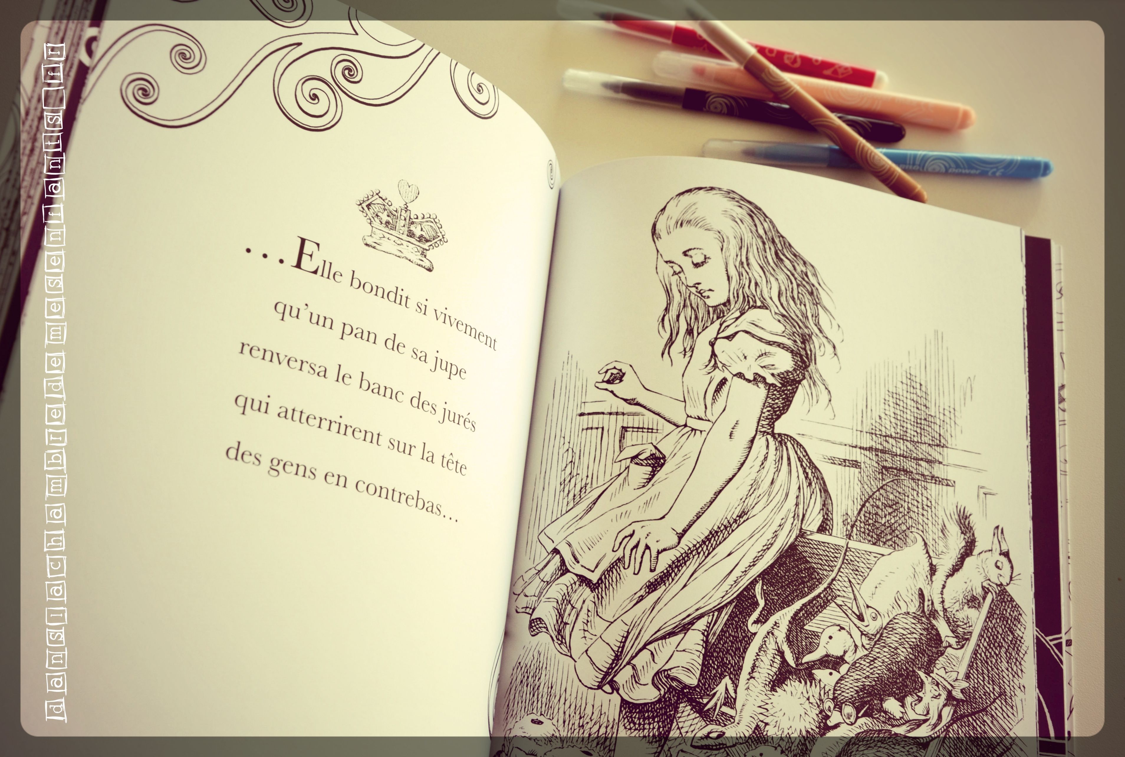 Les scènes nous replongent dans des univers un peu loufoques, ou dans des pages à sublimer par le choix de couleurs (ex : mur de portraits, montres à gousset) parfois avec un travail de fourmi pour traiter de petites zones (ex : double page à imprimé de petites Alice avec le flamand rose). Les illustrations authentiques marquent le caractère de cet ouvrage, telles qu’elle avaient plu à l’auteur pour donner du relief à ce pays merveilleux.