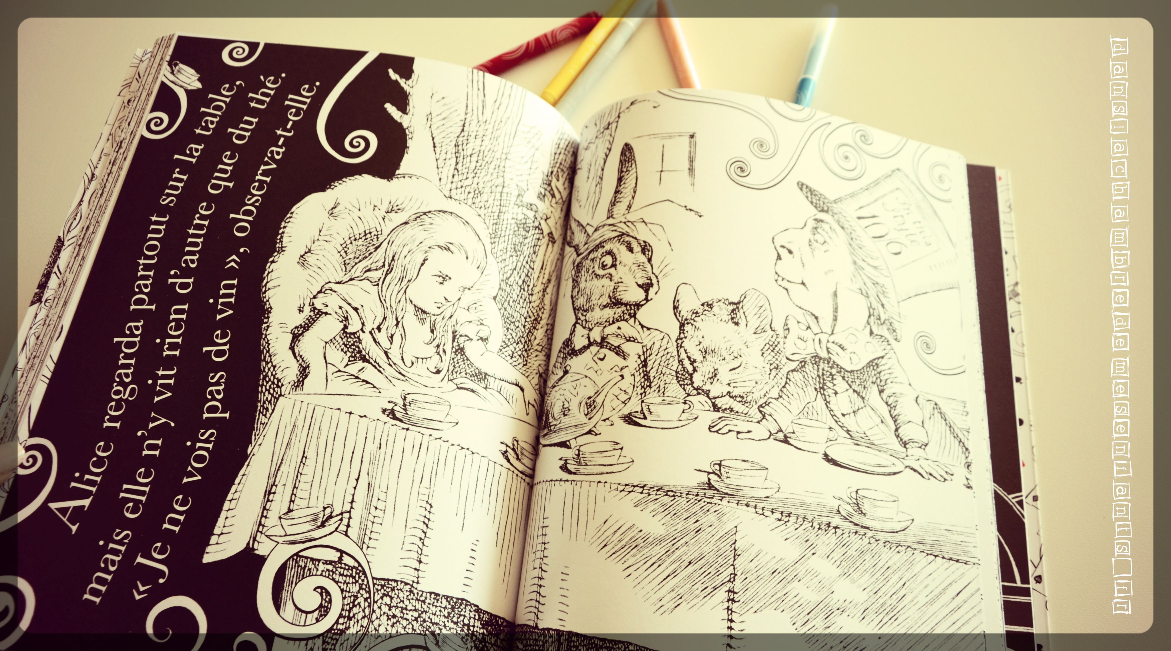 Dans la même lignée que « Le livre de la jungle », cet ouvrage reprend des scènes cultes, régulièrement accompagnées d’extraits de l’œuvre, parfois avec des pages à graphismes divers, mais surtout avec les illustrations originales de Sir John Tenniel, illustrateur du conte de Lewis Carroll.