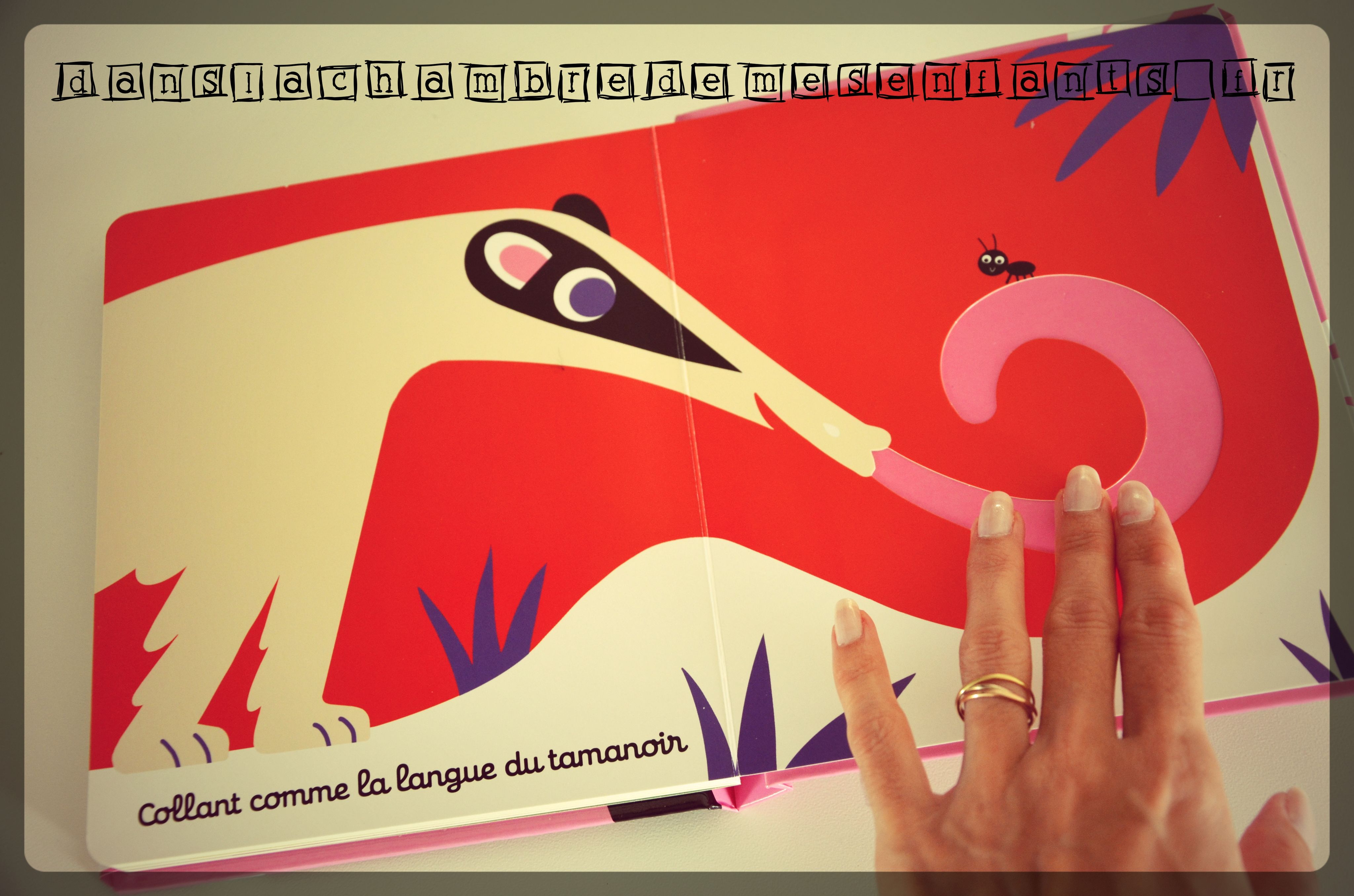 L’avis des enfants : Emi connaît déjà le principe des livres sensoriels et elle commence à être un peu grande pour eux. Elle s’amuse tout de même à toucher les dessins en faisant parfois la grimace (la langue collante du tamanoir est son préféré !) et à reconnaître les animaux.