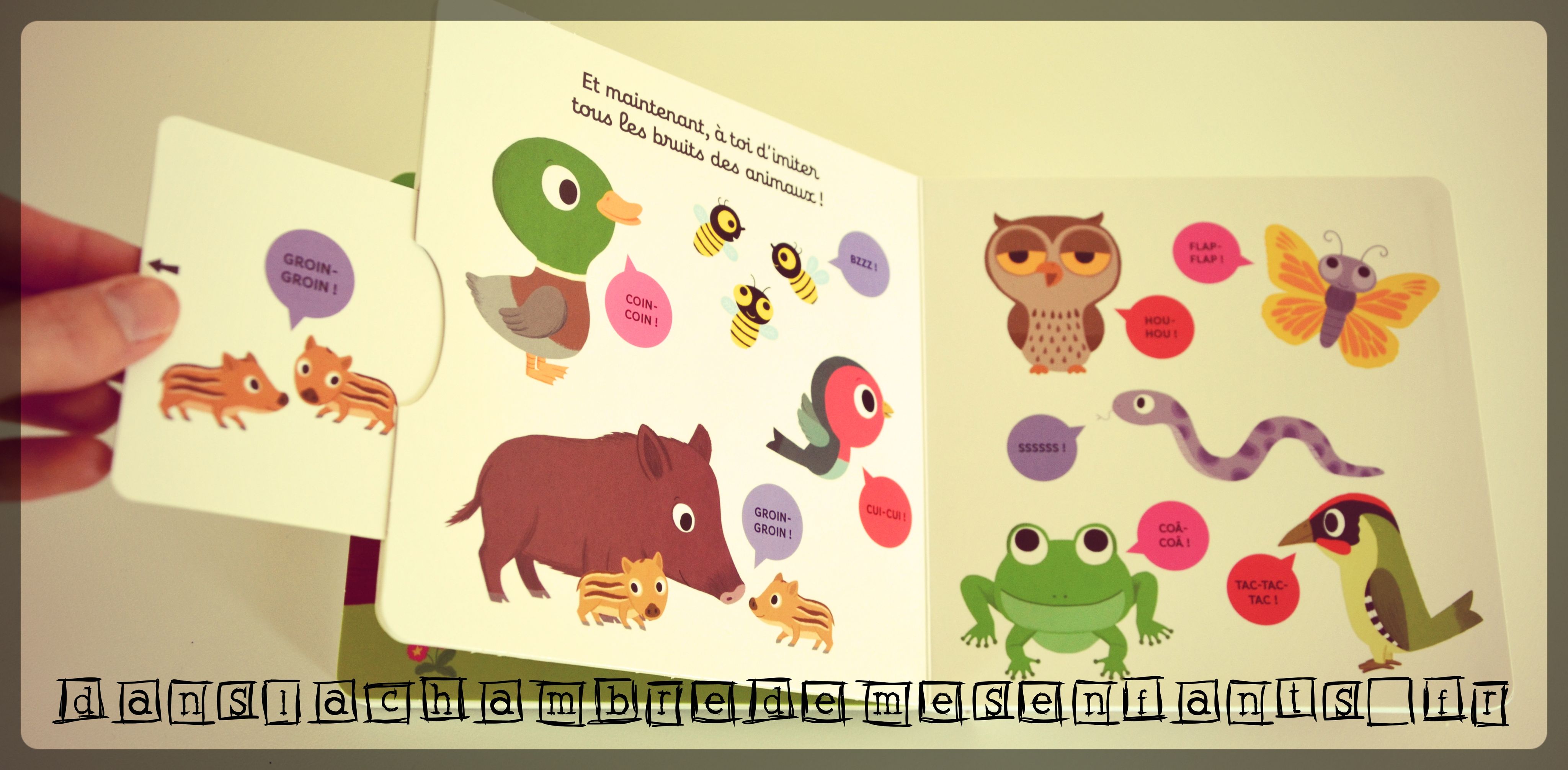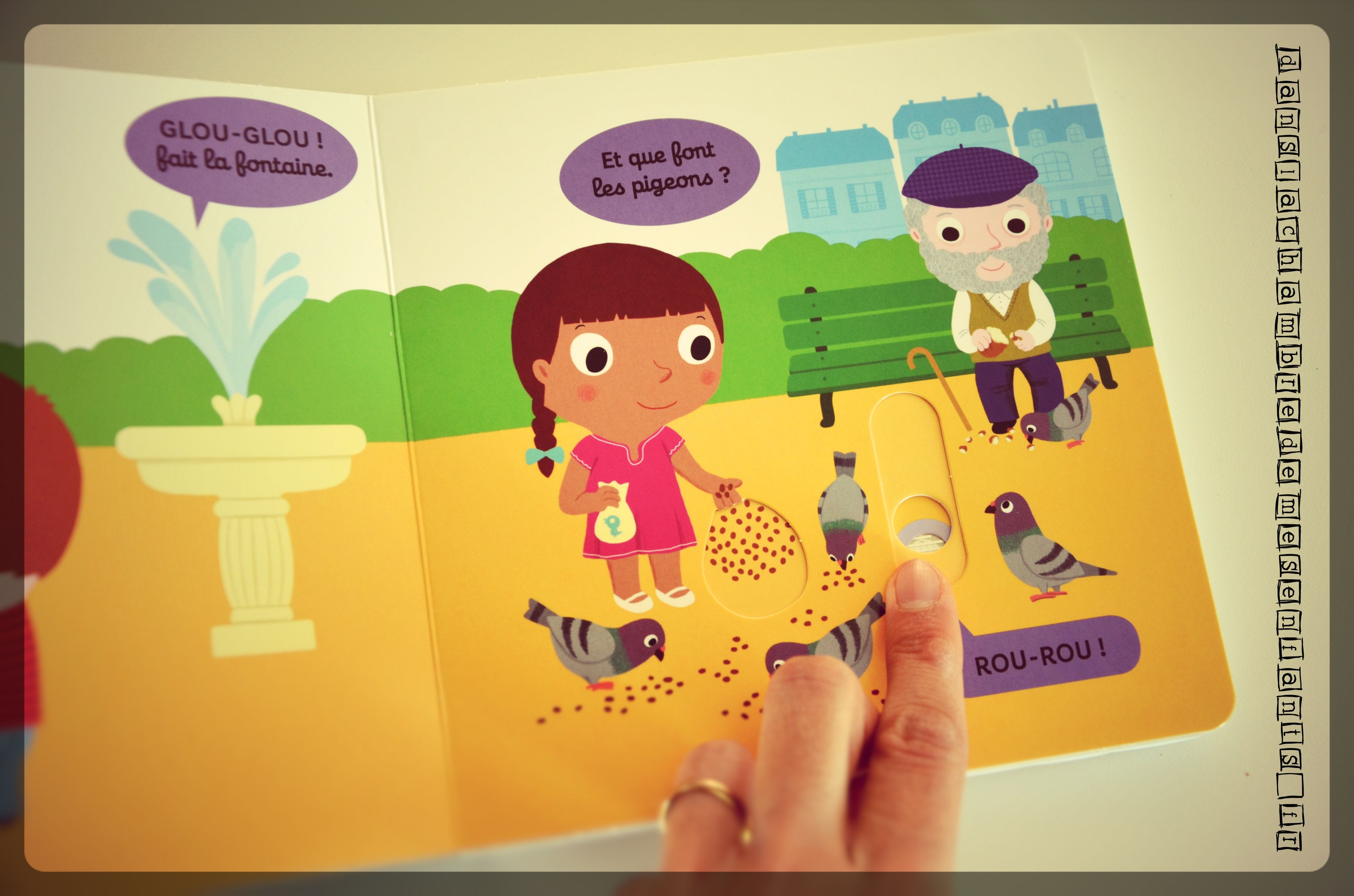 Cette collection est, pour moi, incontournable et sa nouvelle version est pertinente. Les enfants sauront l’apprécier à partir de 9 mois et découvrir ici des animaux de la forêt (canard, pivert…) et la ville (pigeons, sonnette du vélo…).