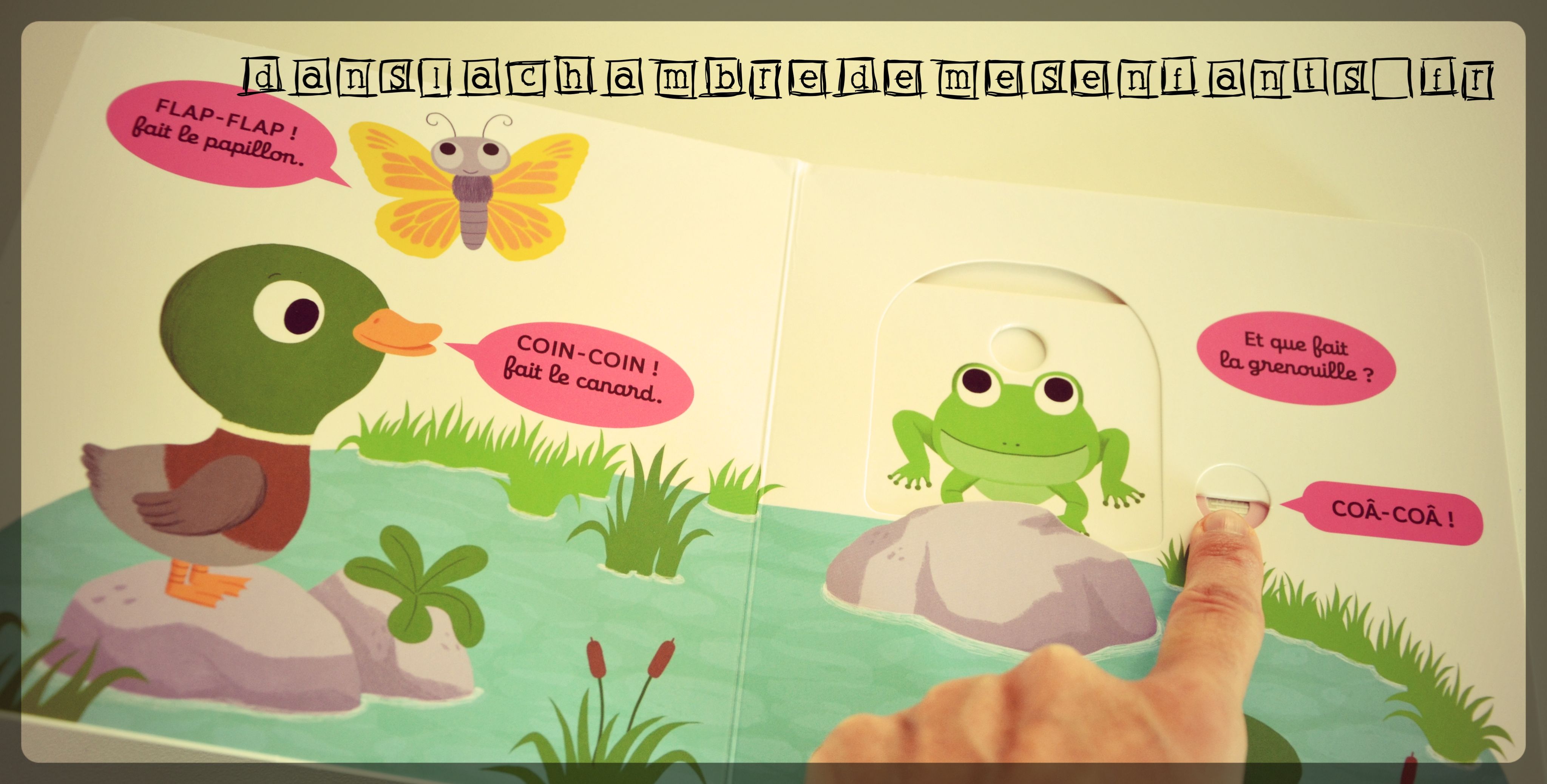 J’ai le plaisir de vous présenter une nouvelle version des premiers imagiers de la collection Kididoc. On retrouve un petit et solide format avec une dimension sonore en plus ! Il ne s’agit pas simplement d’ajouter une simple puce mais de la trouver dans le jeu d’animation : les volets à pousser sont indiqués par un cercle de couleur (découpé dans le carton) ce qui, en plus d’enclencher l’animation de la scène (ex : saut de la grenouille) fait apparaître la puce au liseré de couleur (pour mieux la repérer). Le son du dessin mis en avant est alors activé par effleurement et il peut être interrompu de la même manière (c’est un plus apprécié des enfants). Les dessins sont « commentés » (incitant à plus d’imitation lors de la lecture) et une double page, en fin d’ouvrage, reprends les éléments de l’imagier pour inviter l’enfant à reproduire leur son.