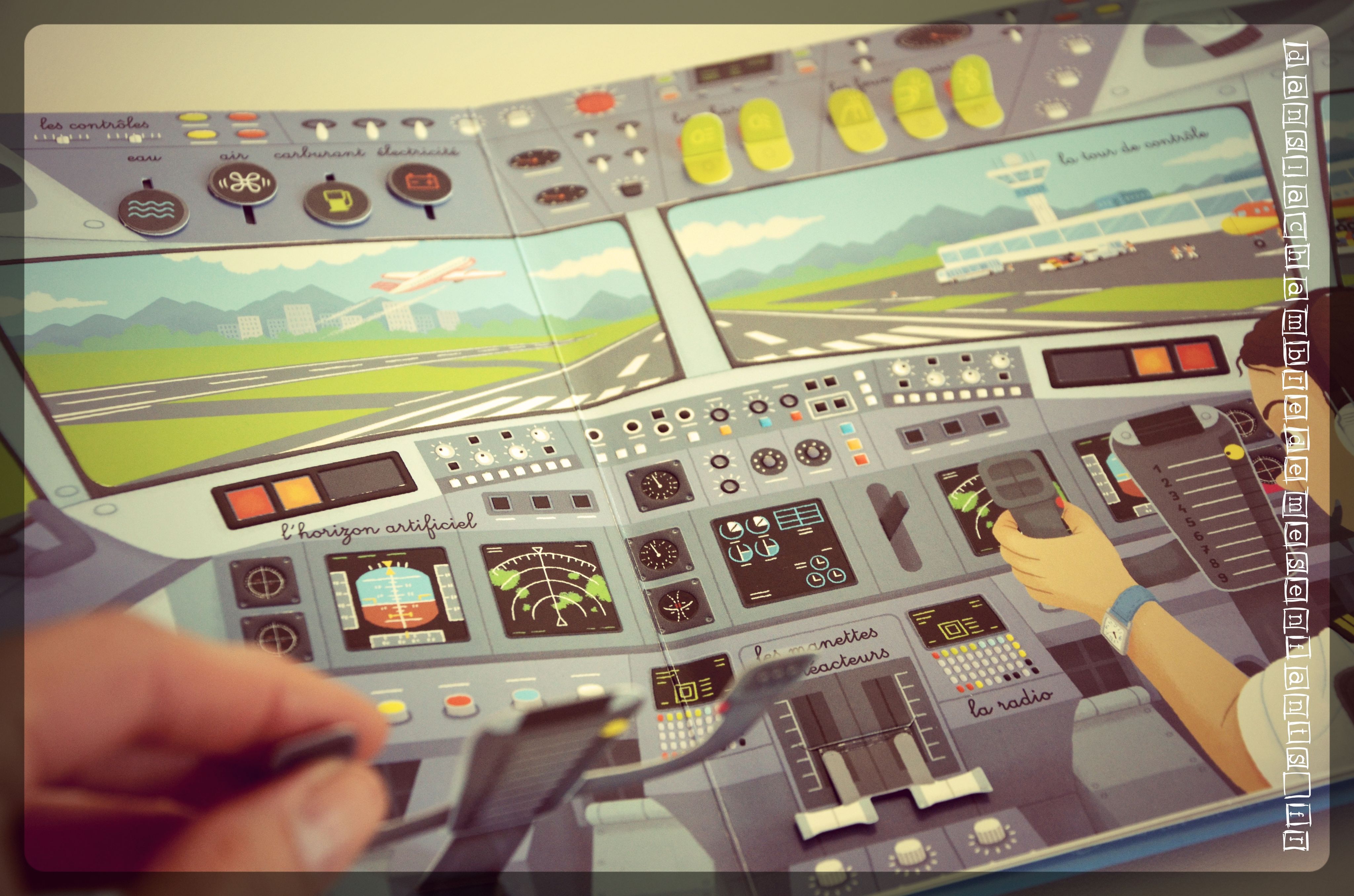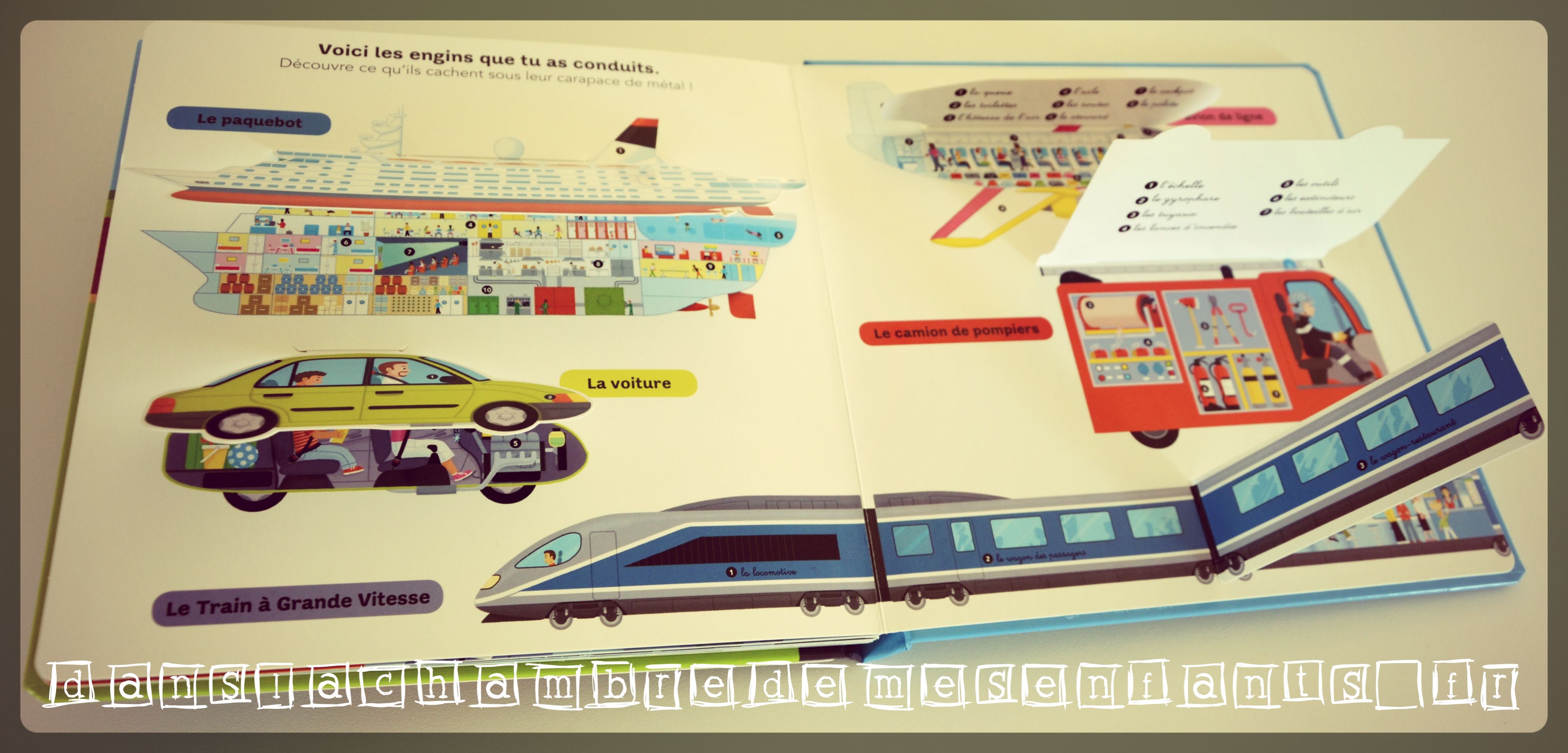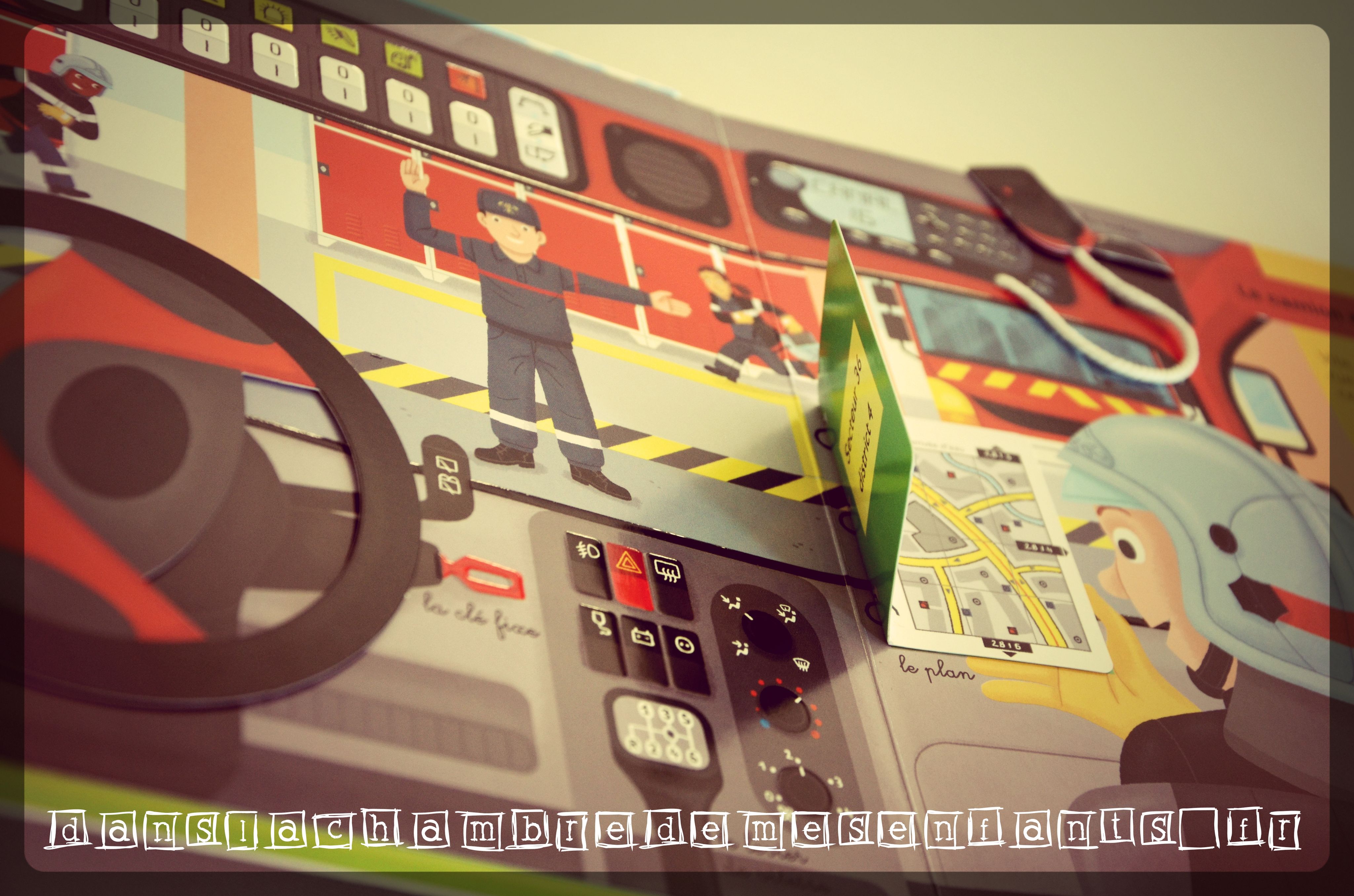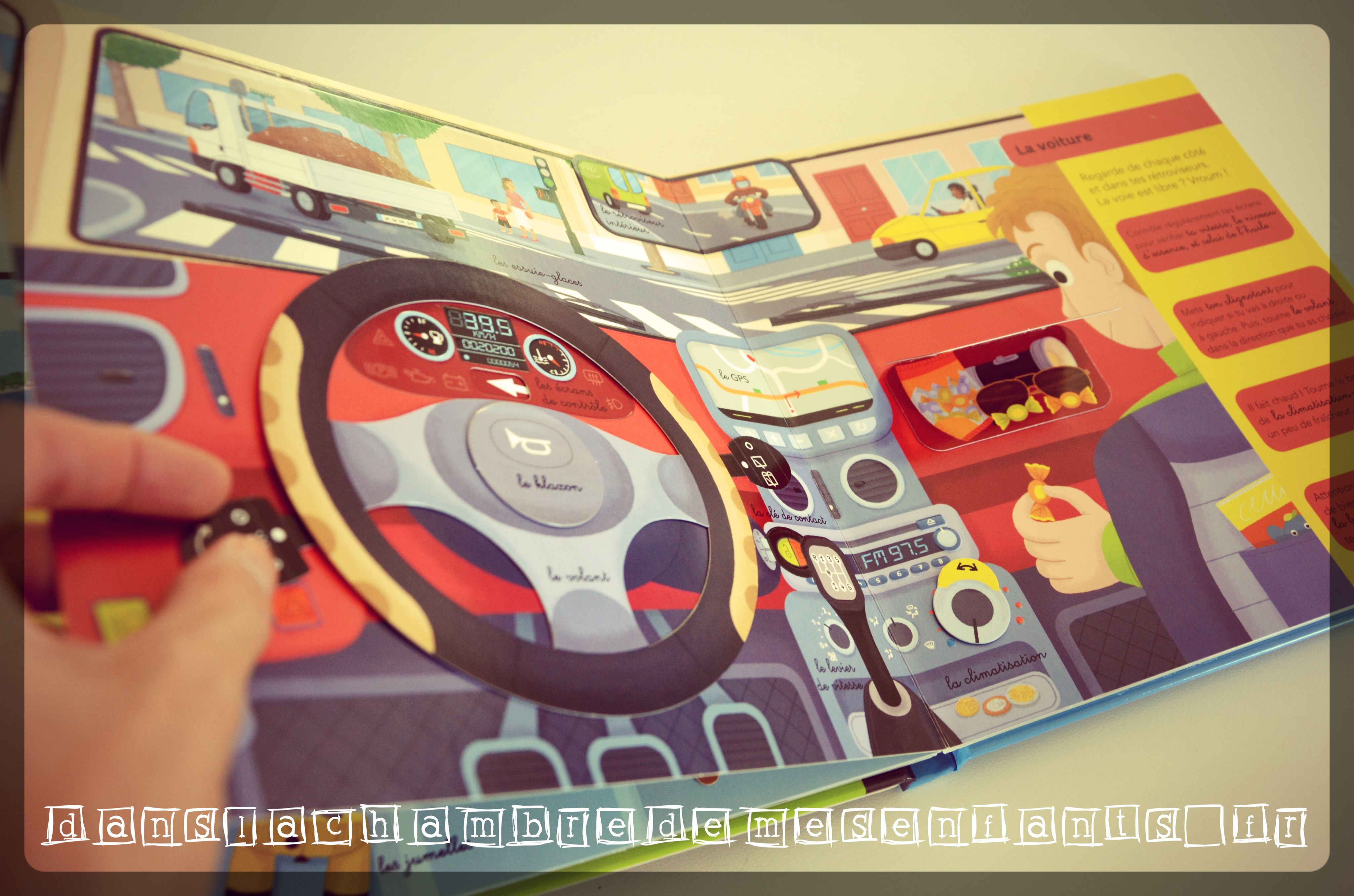 Ce livre a tout pour plaire : il n’a pas échappé aux enfants de DLCDME et c’est un coup de cœur ! Ses pages sont cartonnées et de multiples animations sont faites à l’aide de rabats, de boutons poussoirs, de reliefs et de divers objets des scènes découpés, donc accessibles au lecteur pour les animer. Si le tableau de bord de la couverture et son volant manipulable ne vous ont pas échappé, alors vous aimerez le micro de la radio du camion de pompier, les manettes de commande des moteurs du paquebot, le clignotant à actionner, le manche de l’avion de ligne…