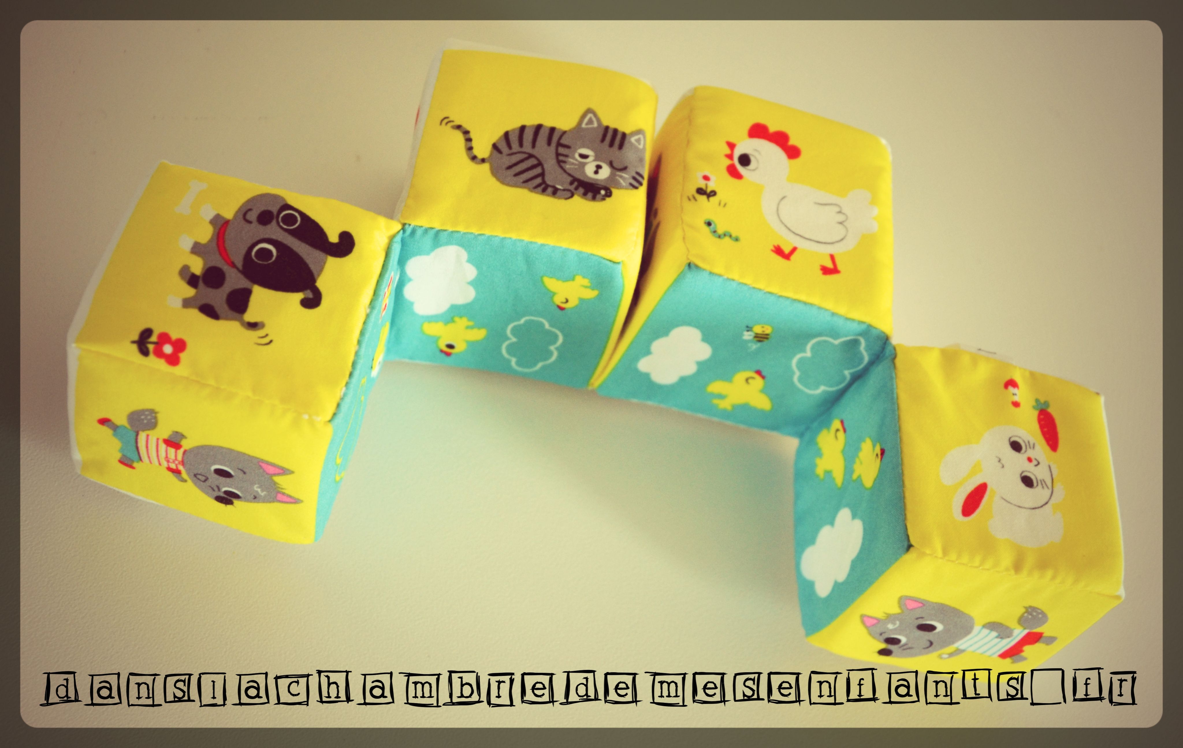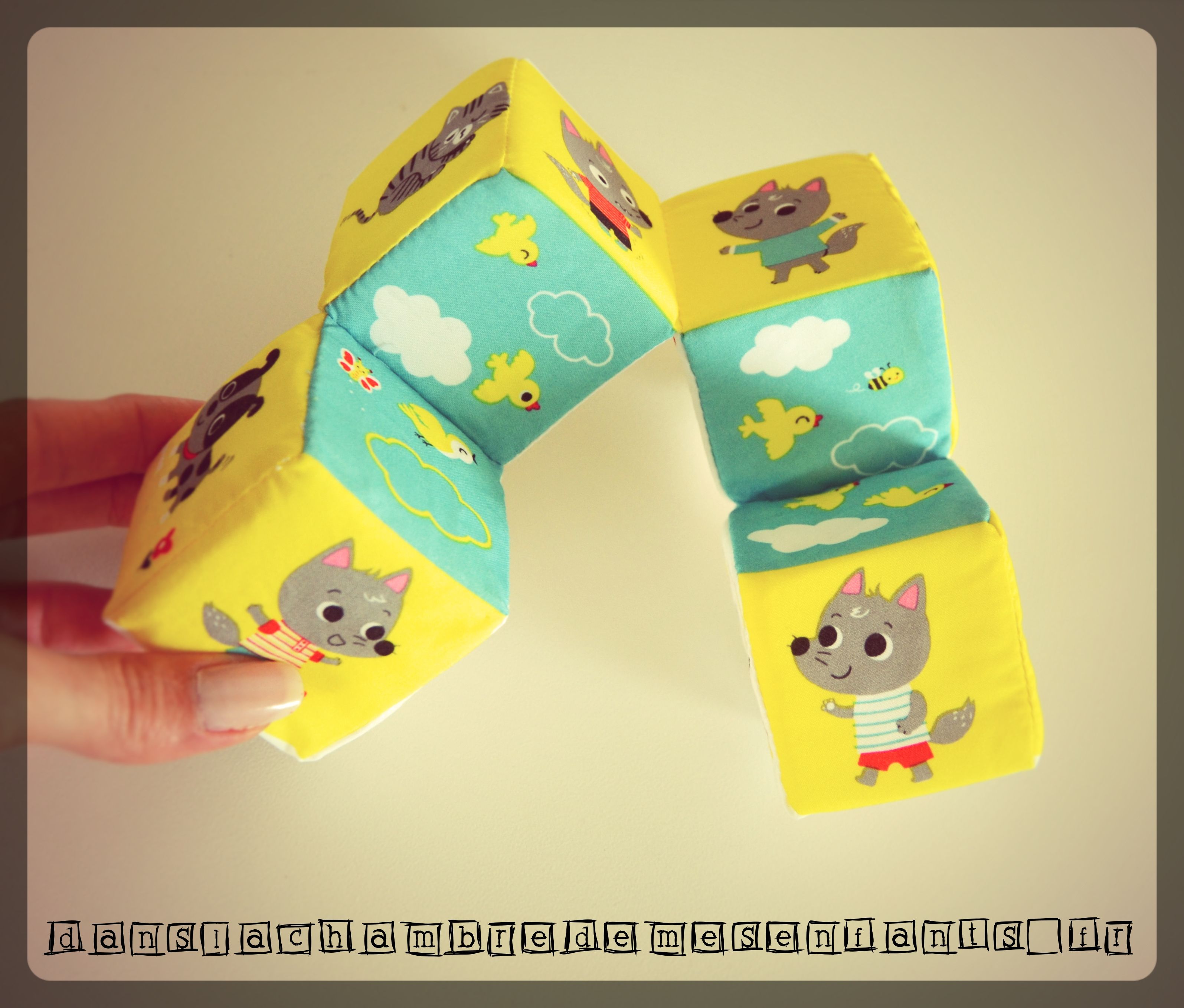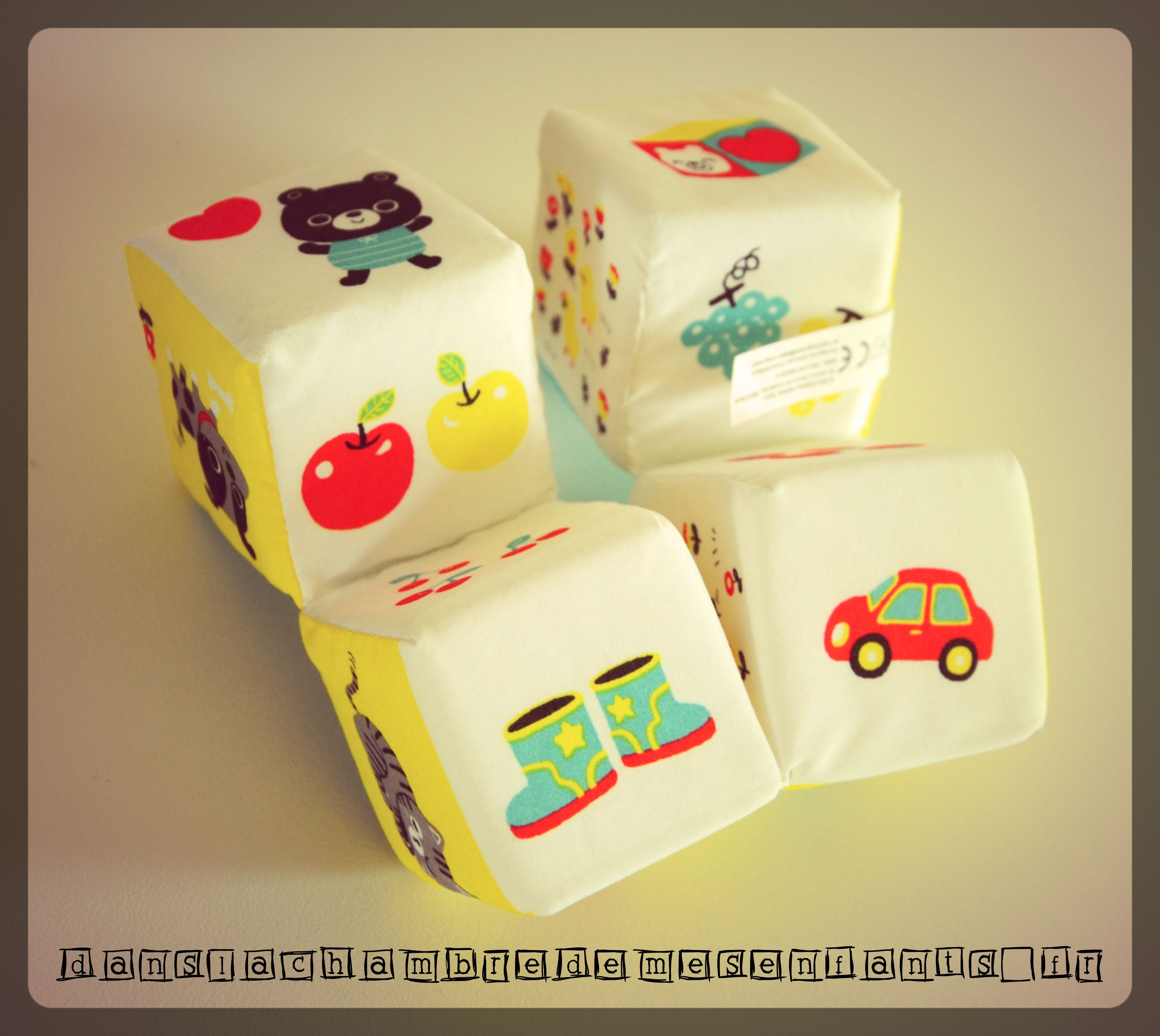 Voici un jeu 1er âge revisité : plus qu’un jeu de cubes, ces 4 éléments sont attachés et forment un tableau de figures similaires à chaque association grâce aux contorsions permises par la « guirlande ». Pour être plus claire, les bébés, à partir de 3 mois, peuvent commencer à manipuler ce jeu de cubes en mousse et en tissu doux (lavable !) et ils seront intéressés par le bruit de papier froissé de l’un des cubes, par les images rondes et à forts contrastes, leur petit format qui permet de le tourner dans tous les sens pour former 6 associations (jardin fleuris avec escargot, poussins…. des fruits, des loups expressifs…).
