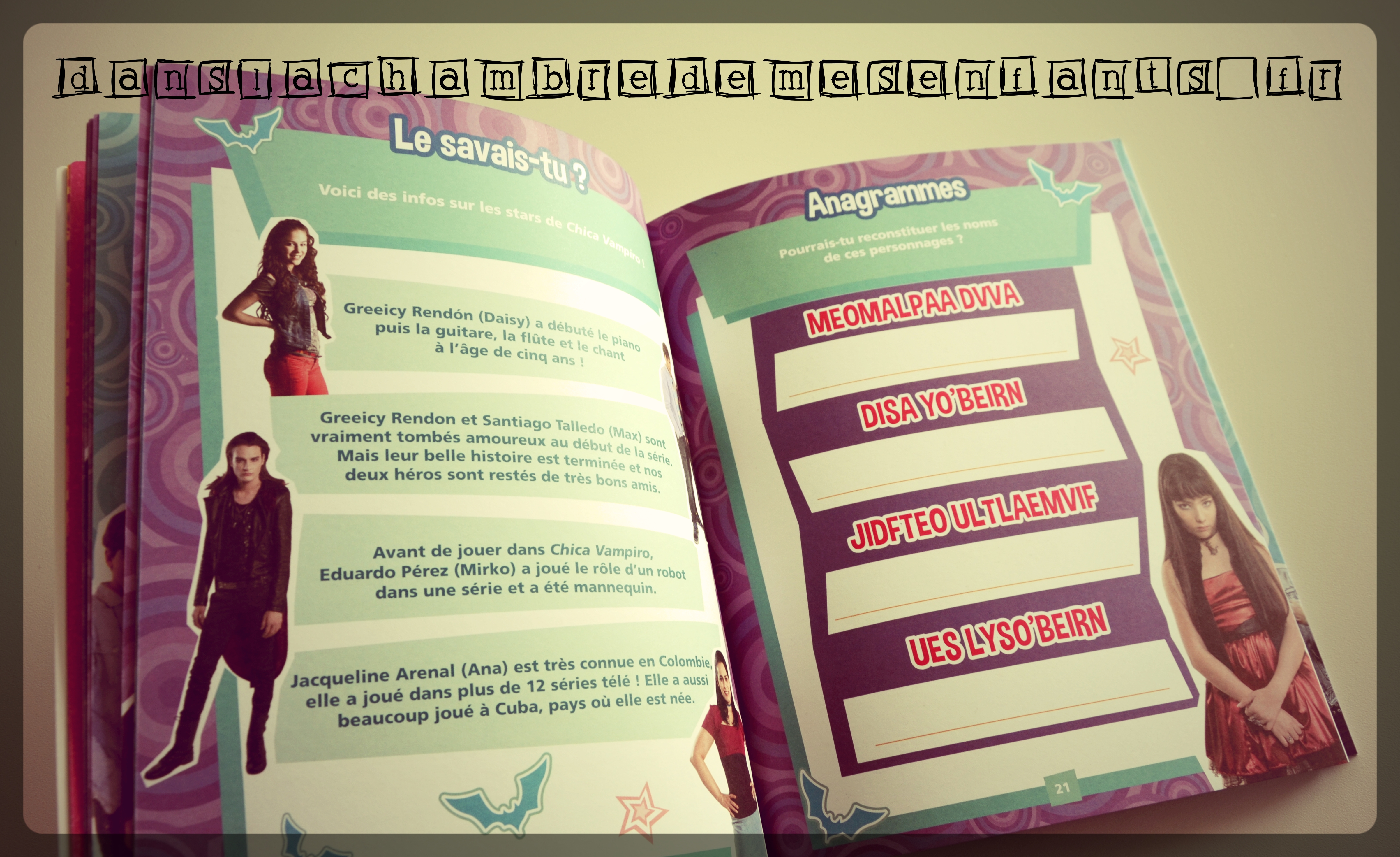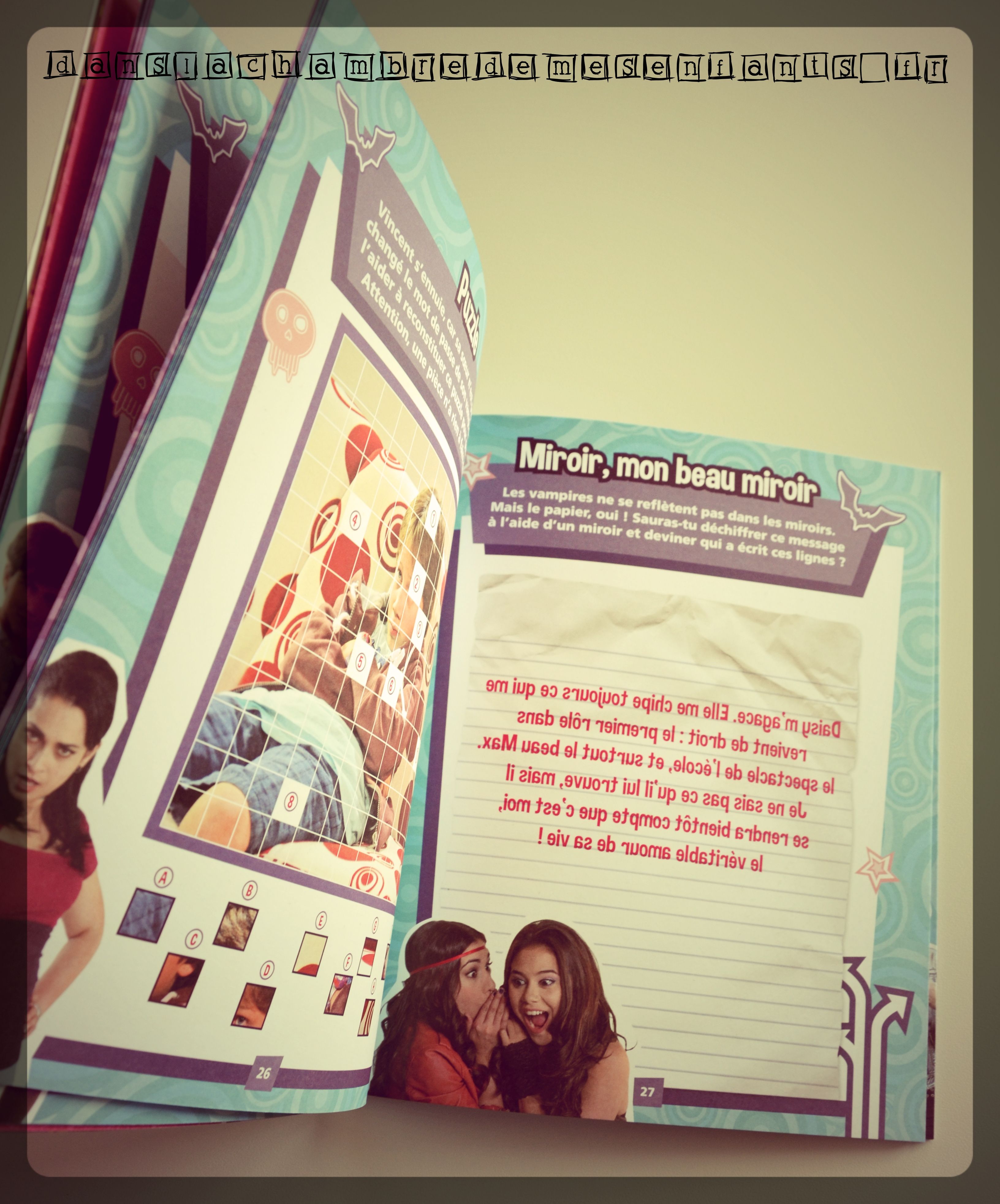 Cette fois-ci, il s’agit d’un grand cahier plus axé sur les jeux. On y retrouve cependant une grande diversité avec un test (savoir garder un secret), un quiz sur la série, un poster (double face), des cartes détachables, des infos sur les personnages, une page de conseils beauté (headband de Lucie), des jeux (mots croisés, jeu du miroir, anagrammes, mots mêlés, sudoku…). Le niveau des jeux est un peu plus élevé que celui de l’ouvrage précédent et je pense qu’il est accessible aux filles à partir de 9 voire 10 ans.