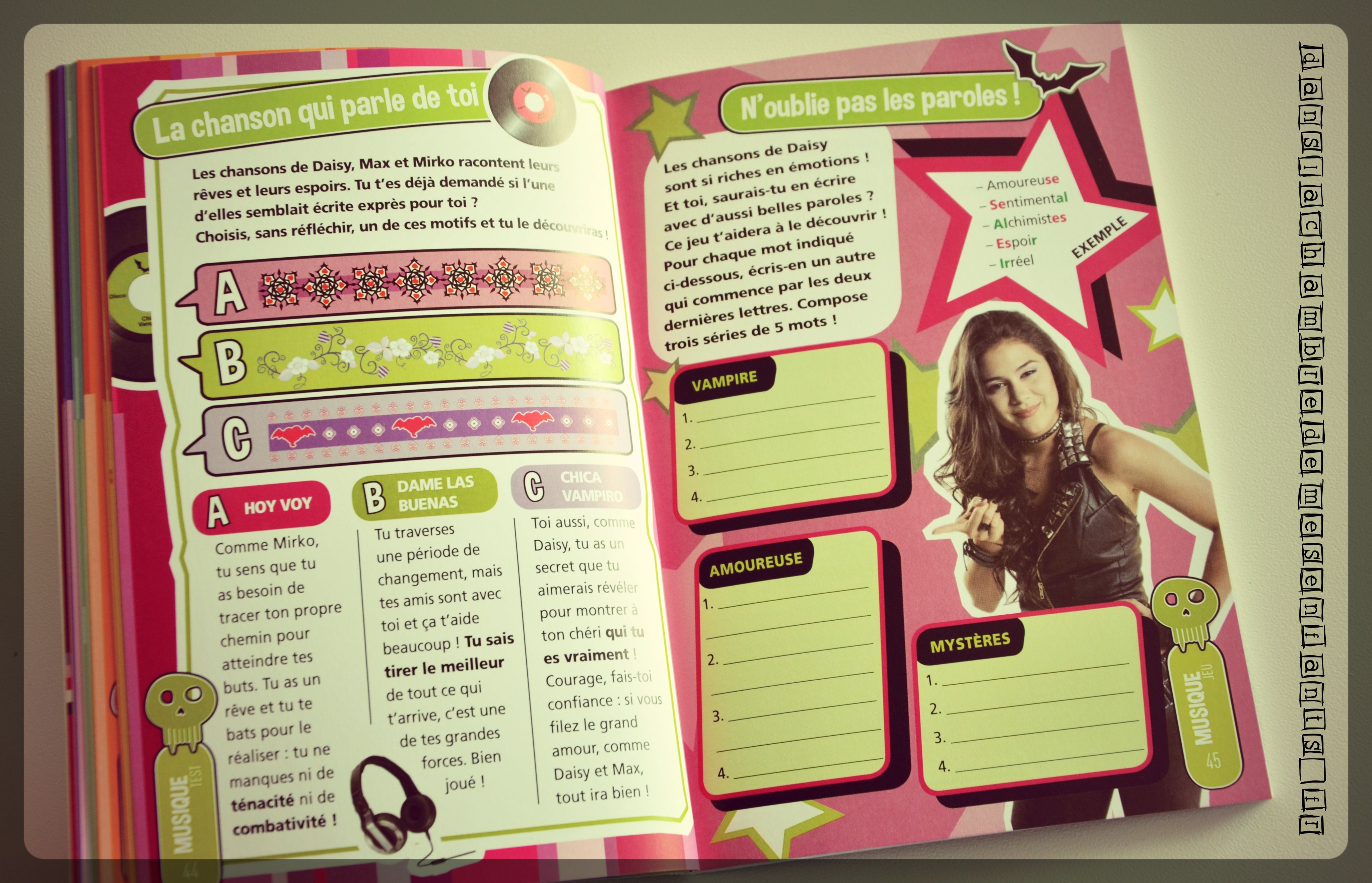 Cet ouvrage se présente sous un format de poche et il s’adresse aux filles à partir de 9 ans. Il a des airs de magazines avec de nombreux tests (ex : est-ce vraiment de l’amour ? / A quel personnage ressembles-tu le plus ?), des conseils beauté (e x : quel vernis porter selon le signe astrologique), les paroles de chansons de la série TV, des jeux (mots croisés, sudoku, message codé…) et des cartes (prédécoupées) à l’image des personnages.
